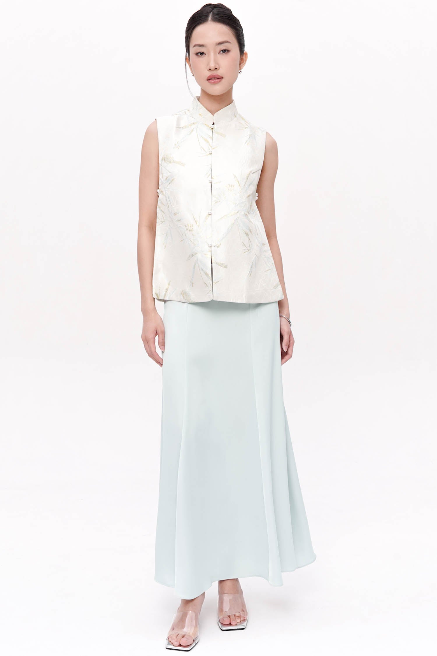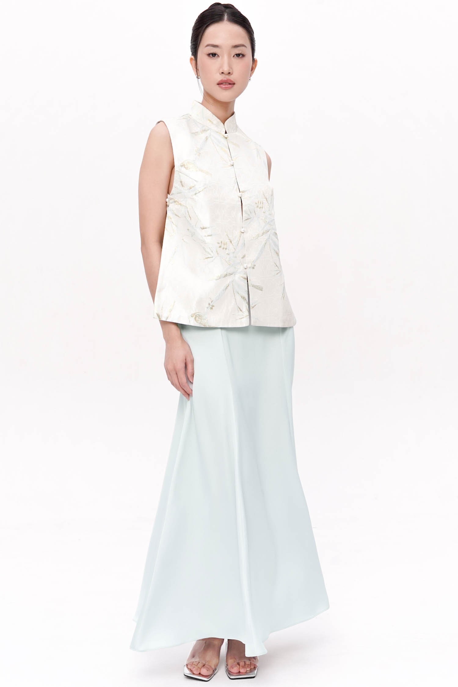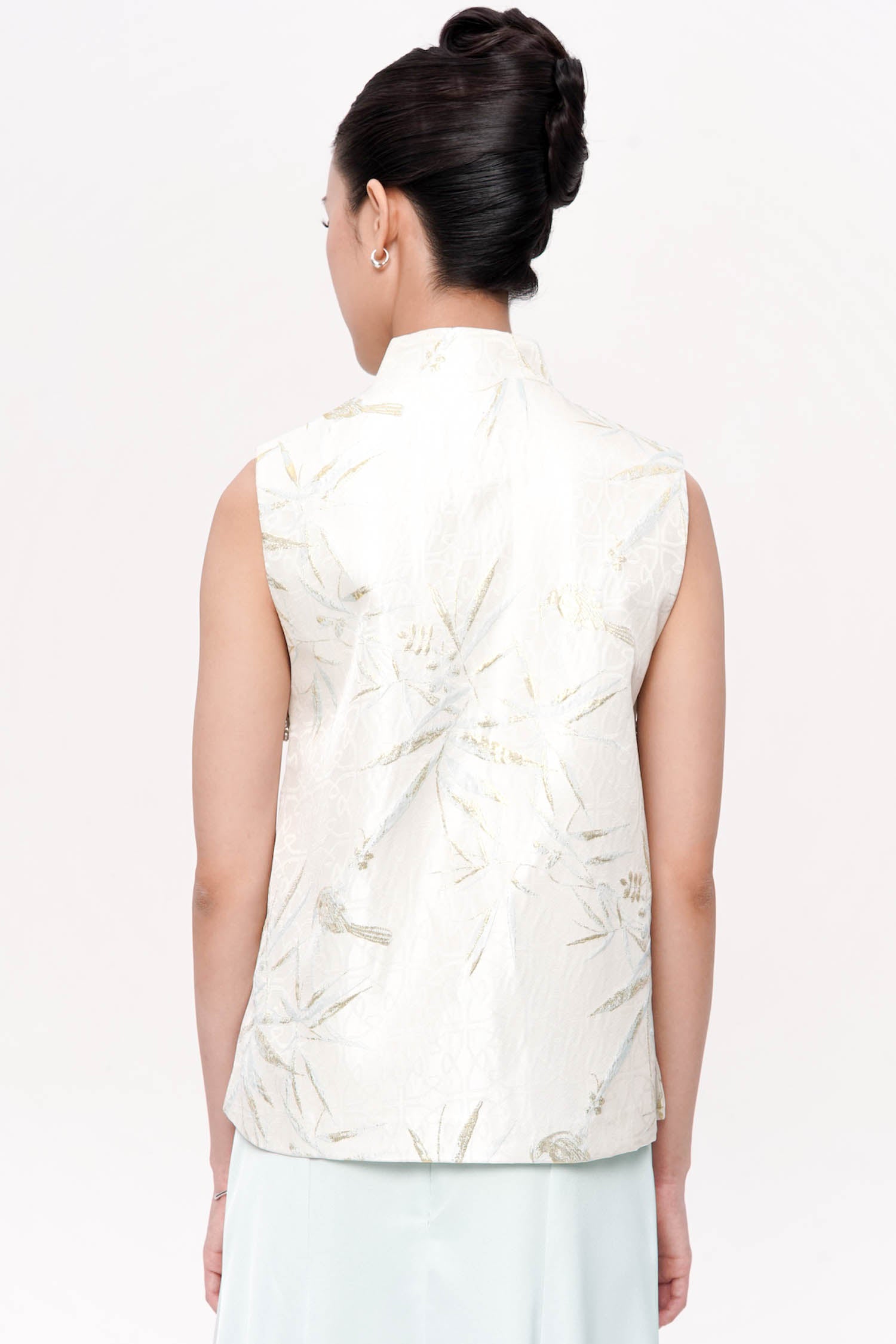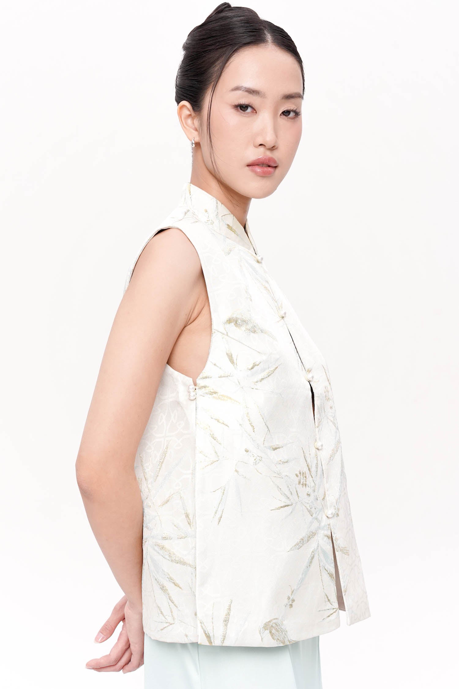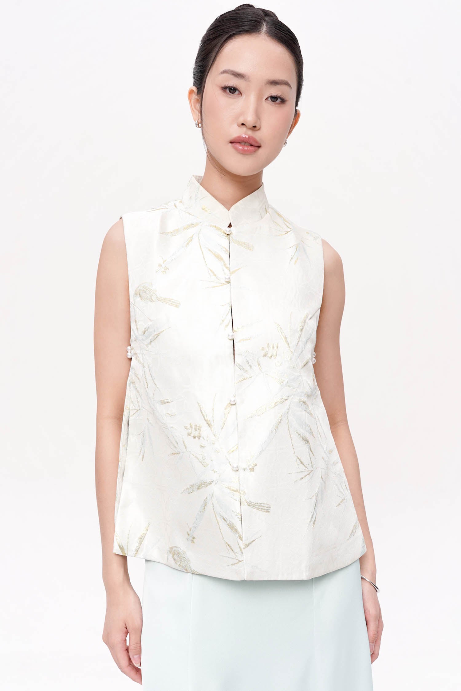 The Amei Qipao Vest in Ivory is a refined expression of traditional inspiration interpreted through a modern, minimalist lens. Crafted from smooth polyester, this sleeveless design features a soft ivory base adorned with delicate botanical motifs highlighted by subtle golden accents, lending an air of quiet luxury. The structured mandarin collar and elegant pearl button closures create a polished focal point, while the clean, tailored silhouette offers contemporary versatility and ease. Thoughtfully shaped to flatter the form, the Amei Qipao Vest transitions seamlessly from formal occasions to elevated everyday wear, embodying timeless sophistication with understated cultural nuance.