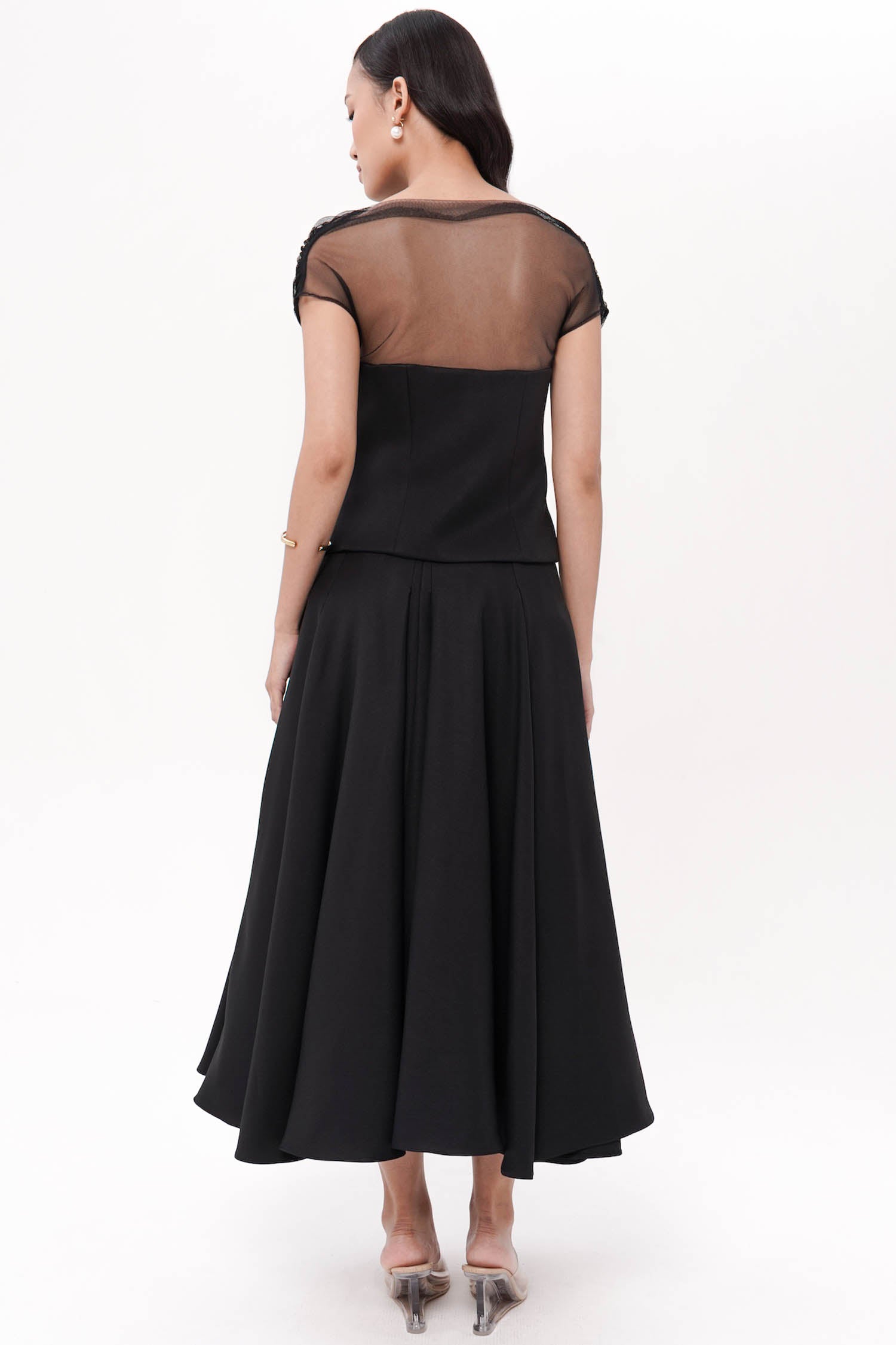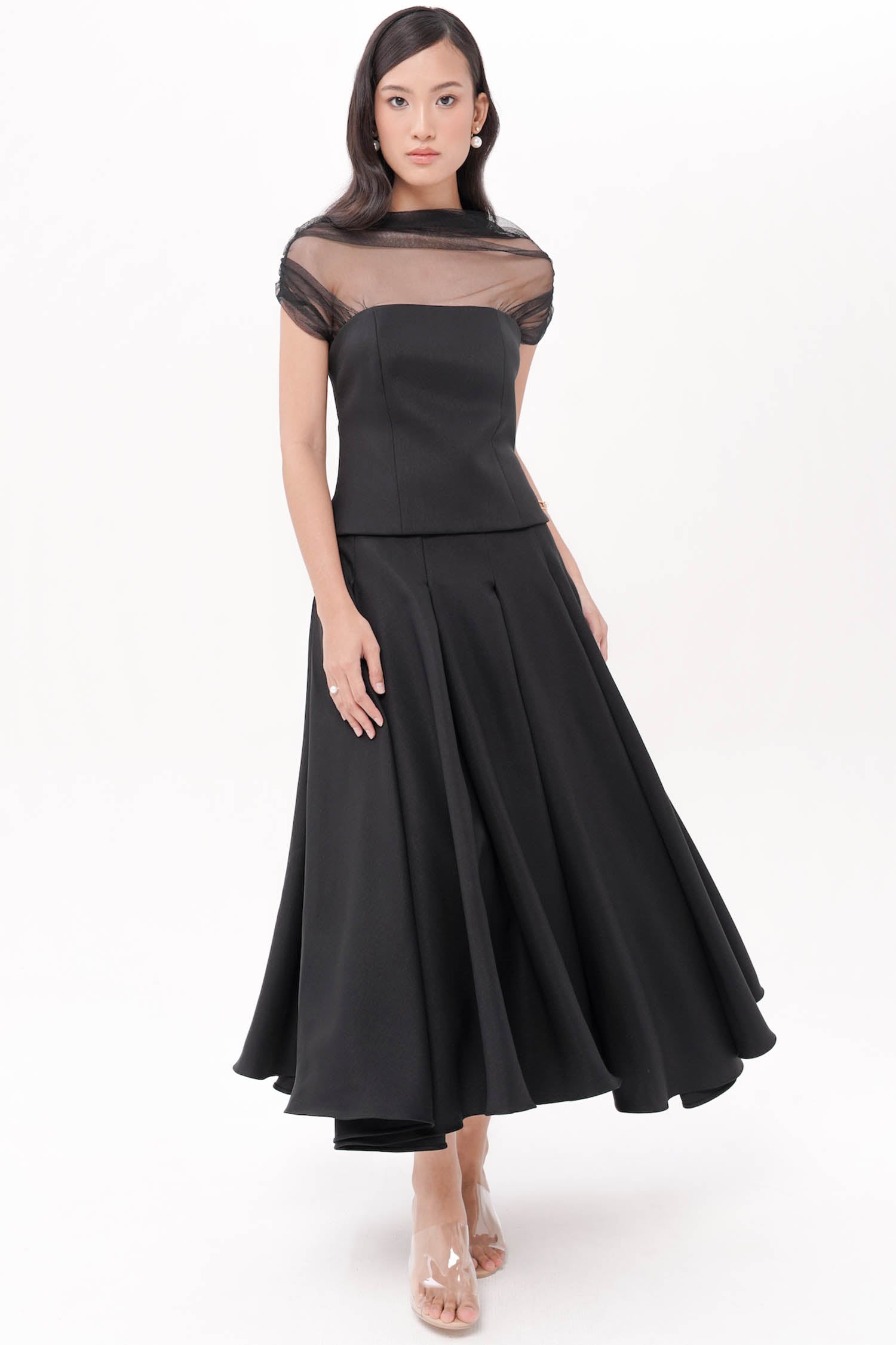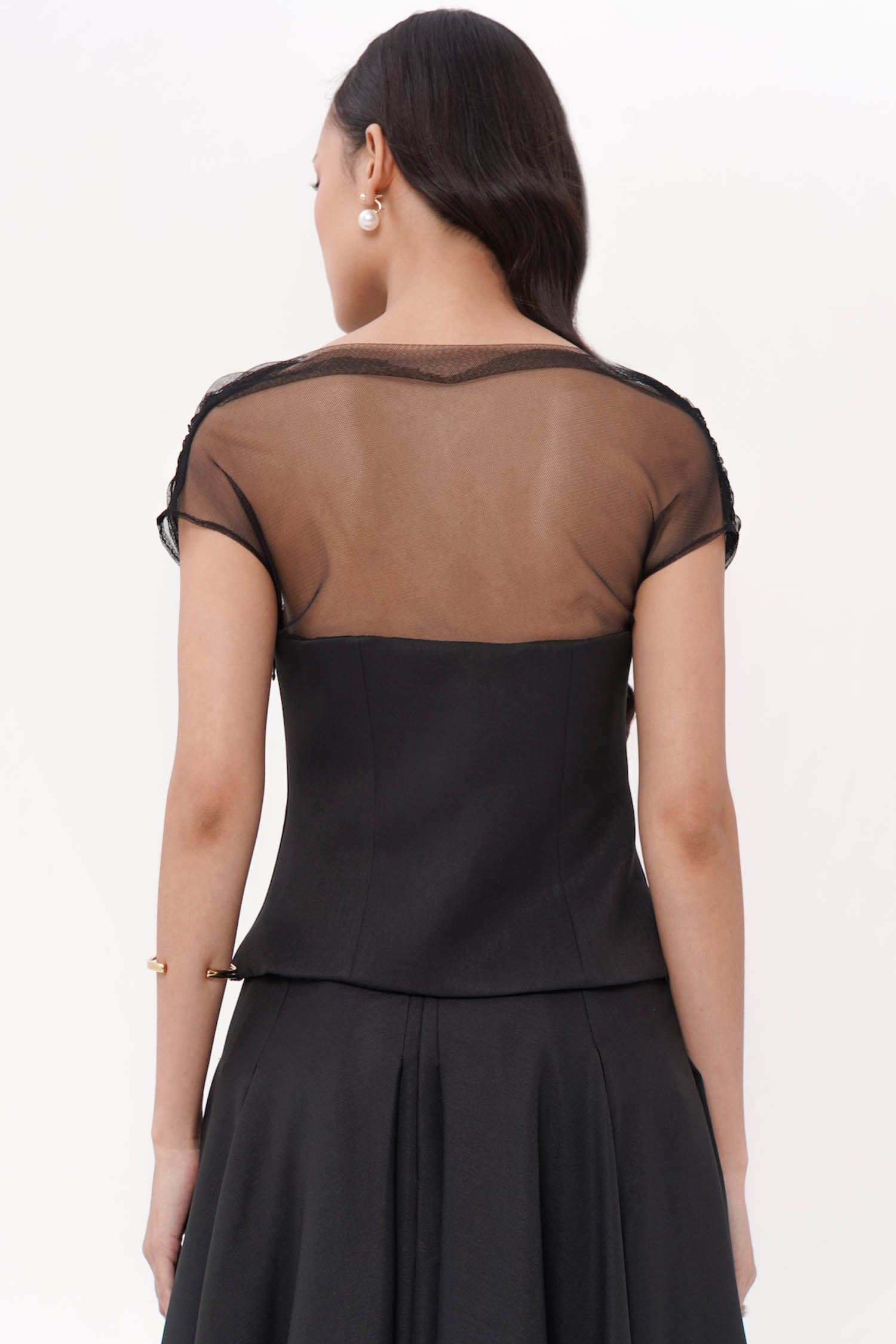The Amelle Mix Tulle Top captivates with quiet drama, blending soft structure and ethereal charm...