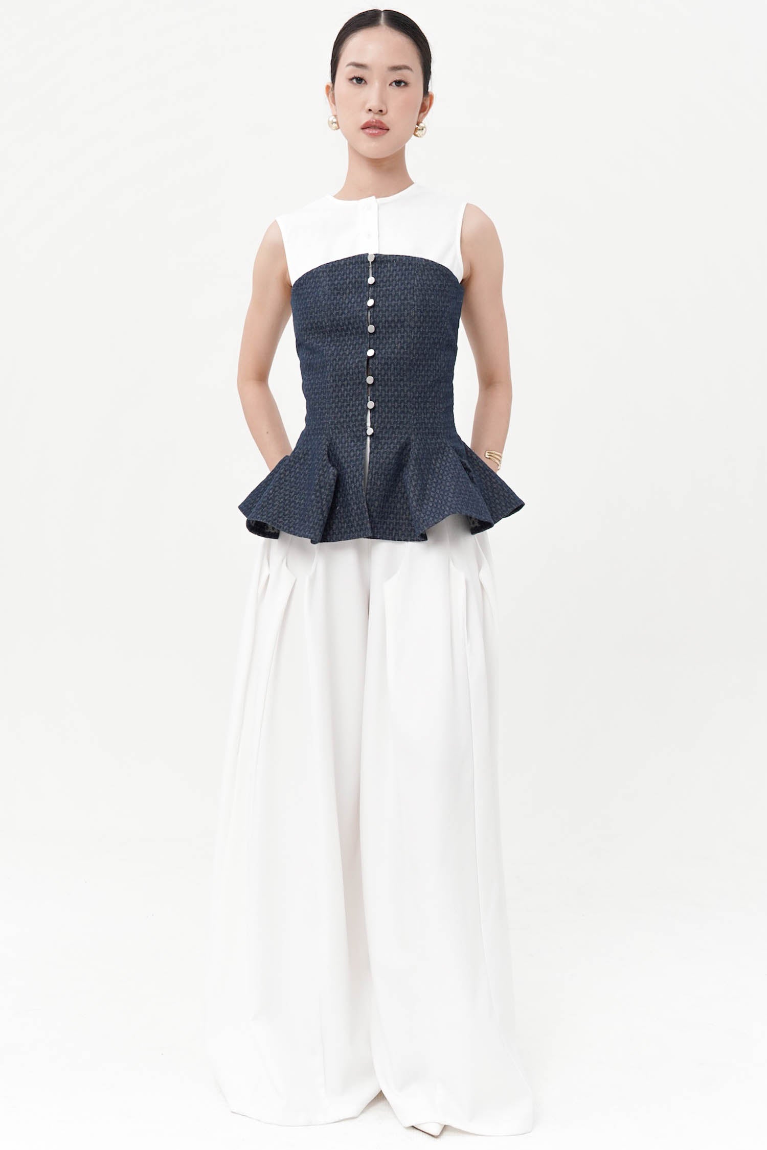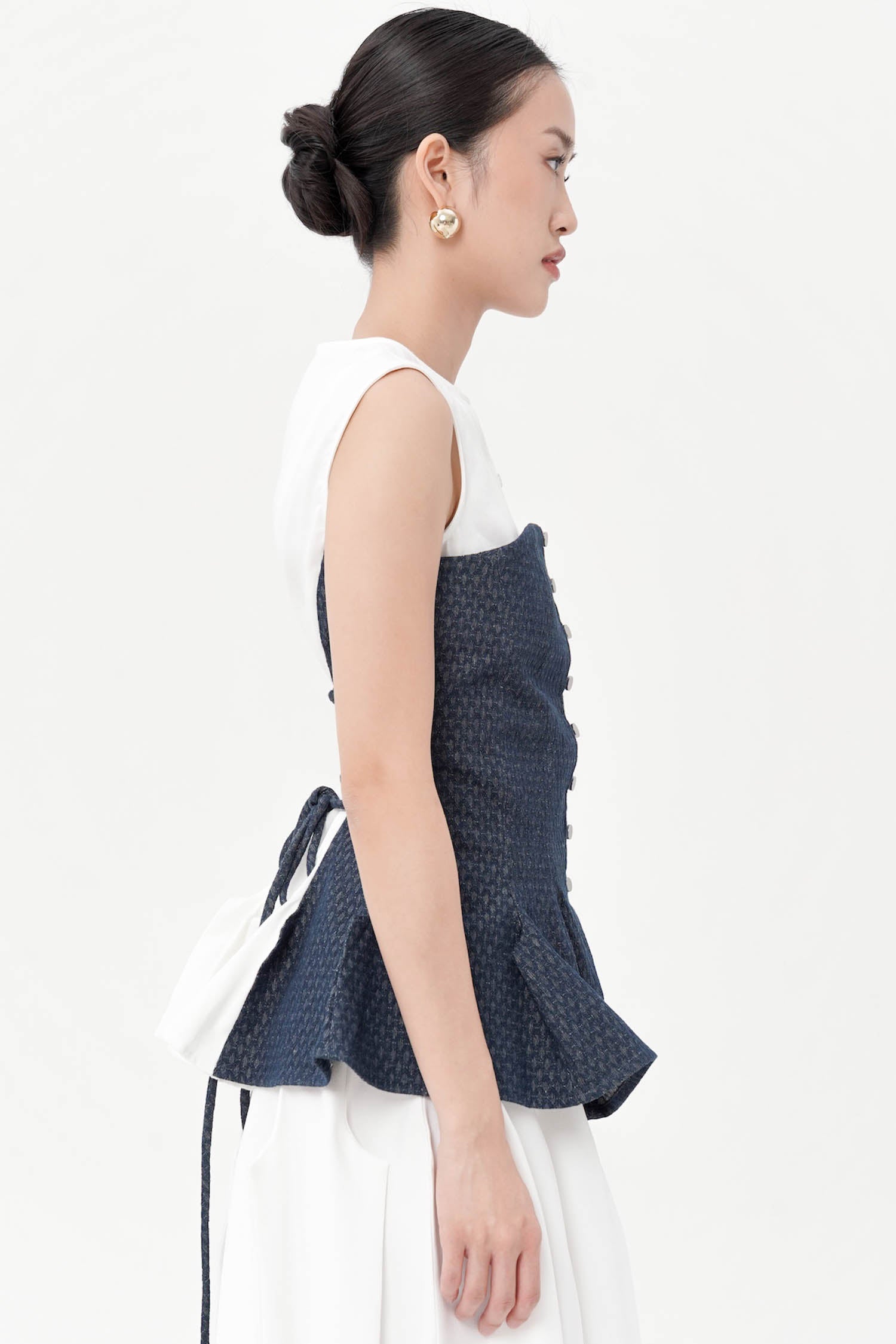 This two-tone button-down top features a double-layer design for a refined silhouette. The adjustable lacing at the back ensures a customized fit. Its 3D panels contour the waist to hips, enhancing shape and structure.