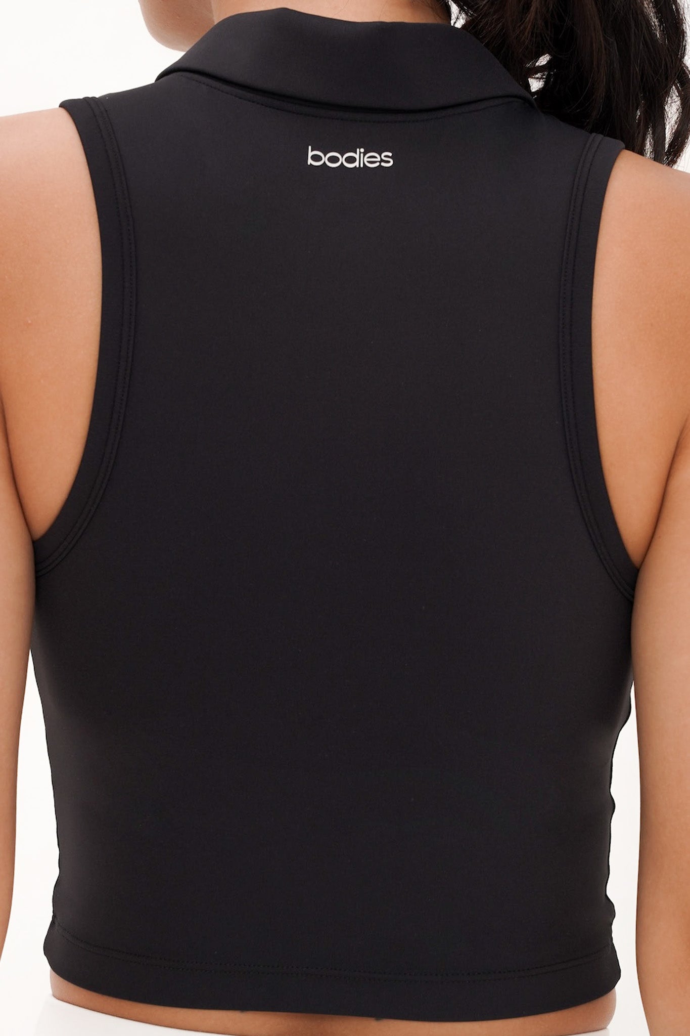Sporty, refined silhouette: Polo-inspired design adds a touch of collegiate chic while staying functionally streamlined. Polo-Inspired Design: A refined collar and zip-front bring that sporty-chic, collegiate vibe. Hidden Safety Hook: A discreet hook behind the zipper keeps everything secure while you move. Built-In Bra Padding: Light support that lets you skip the layers and go with ease. Cropped Silhouette: A flattering cut that hits just right — elevated, easy, and made to move.