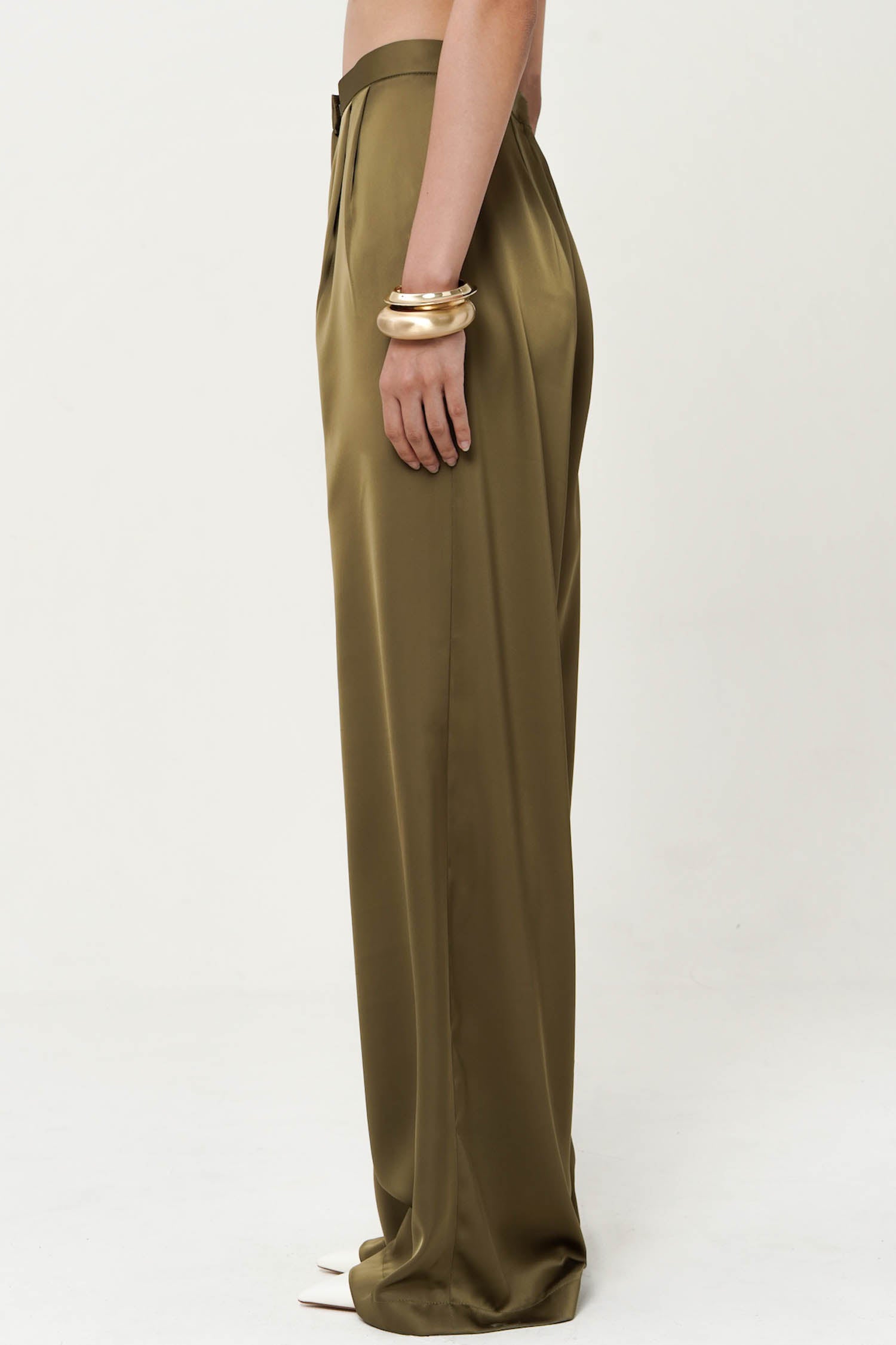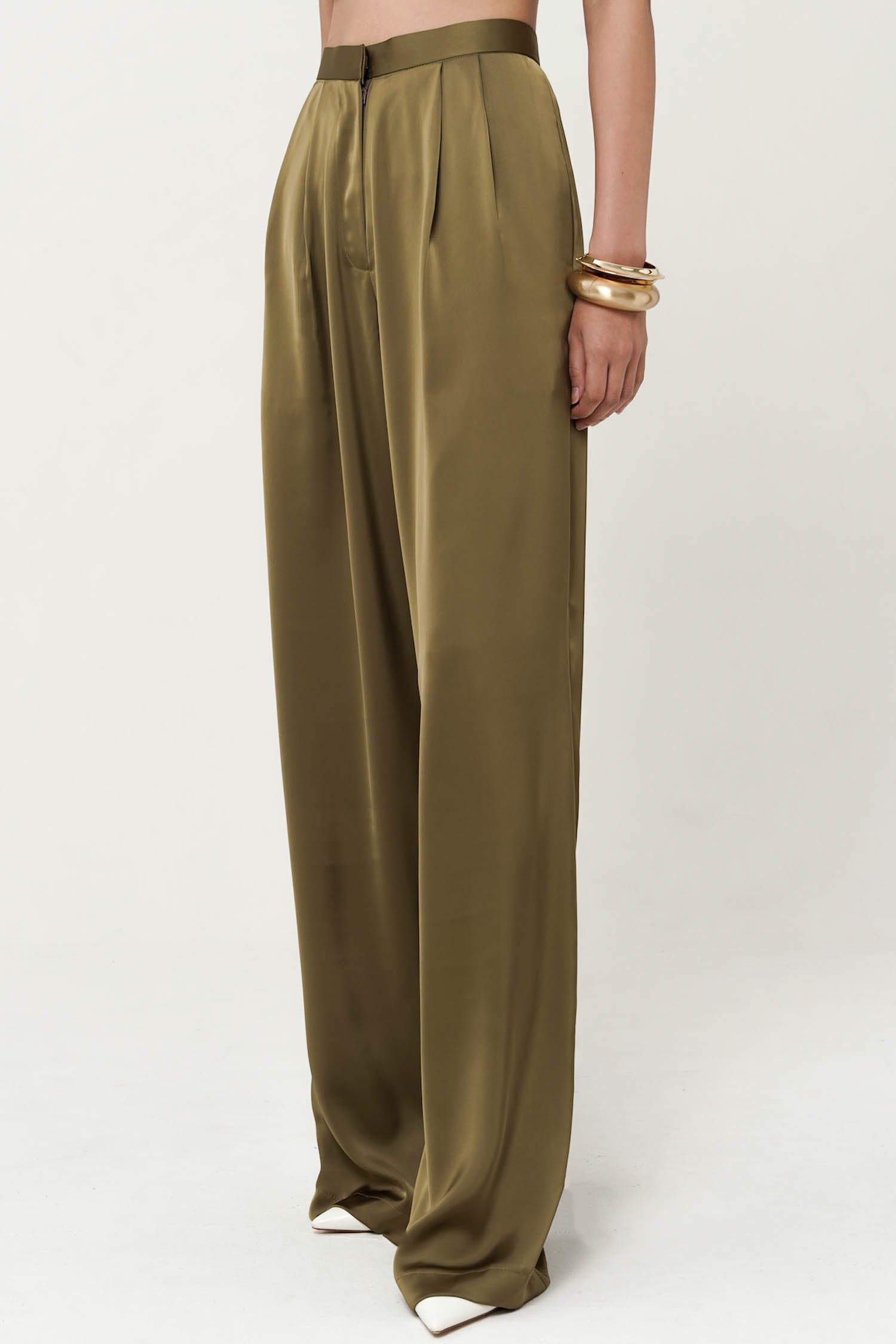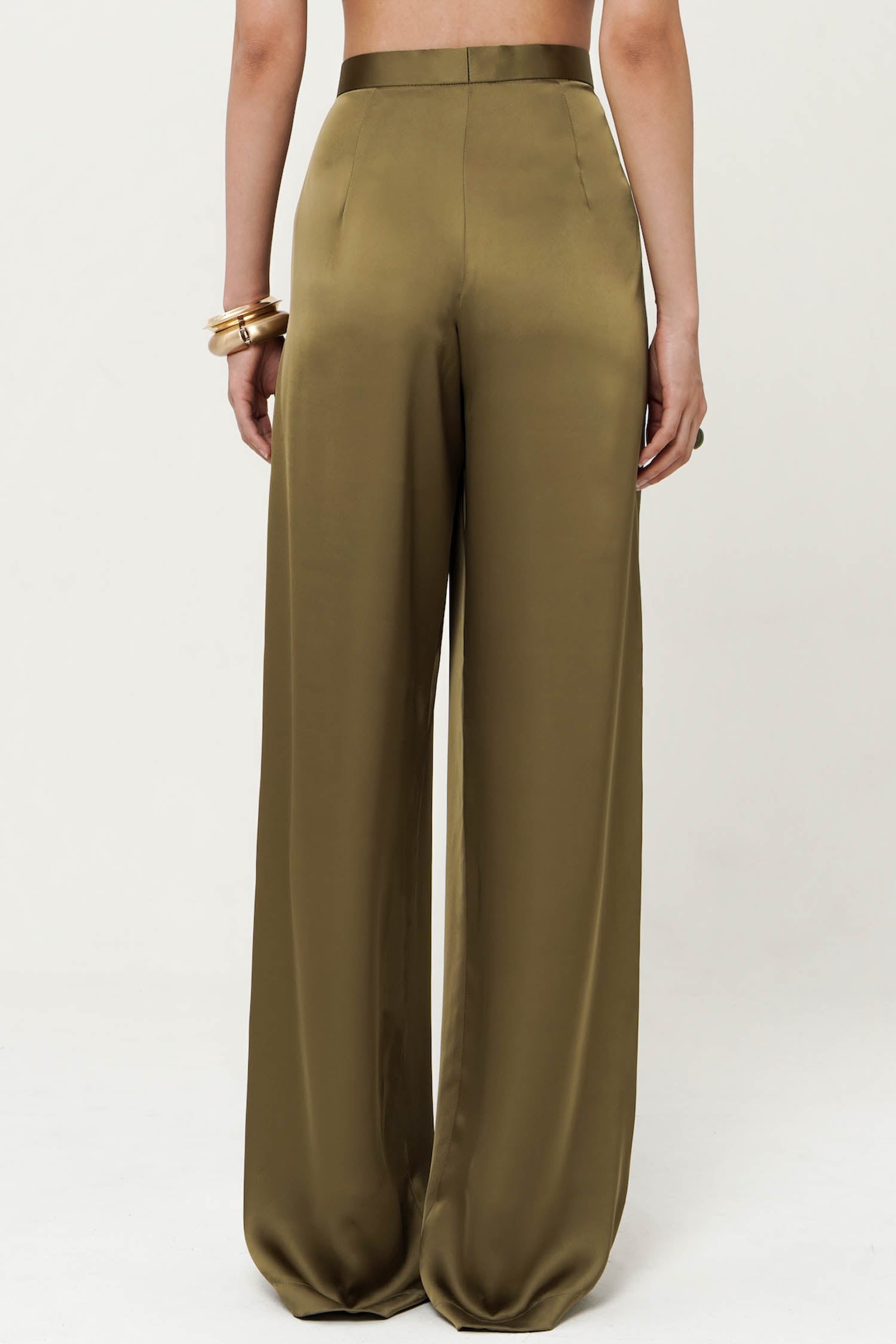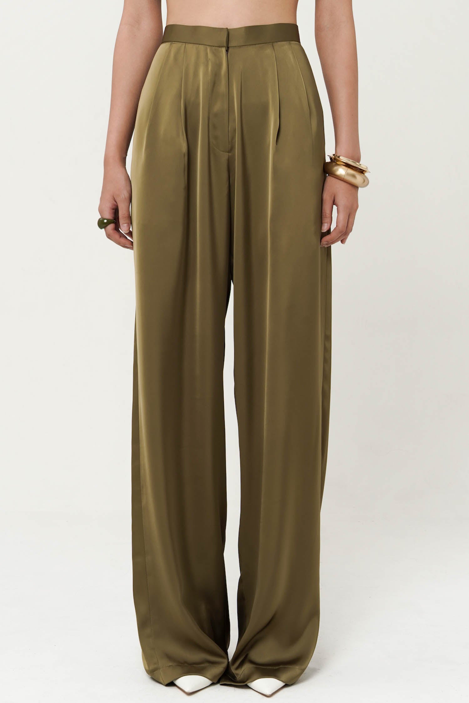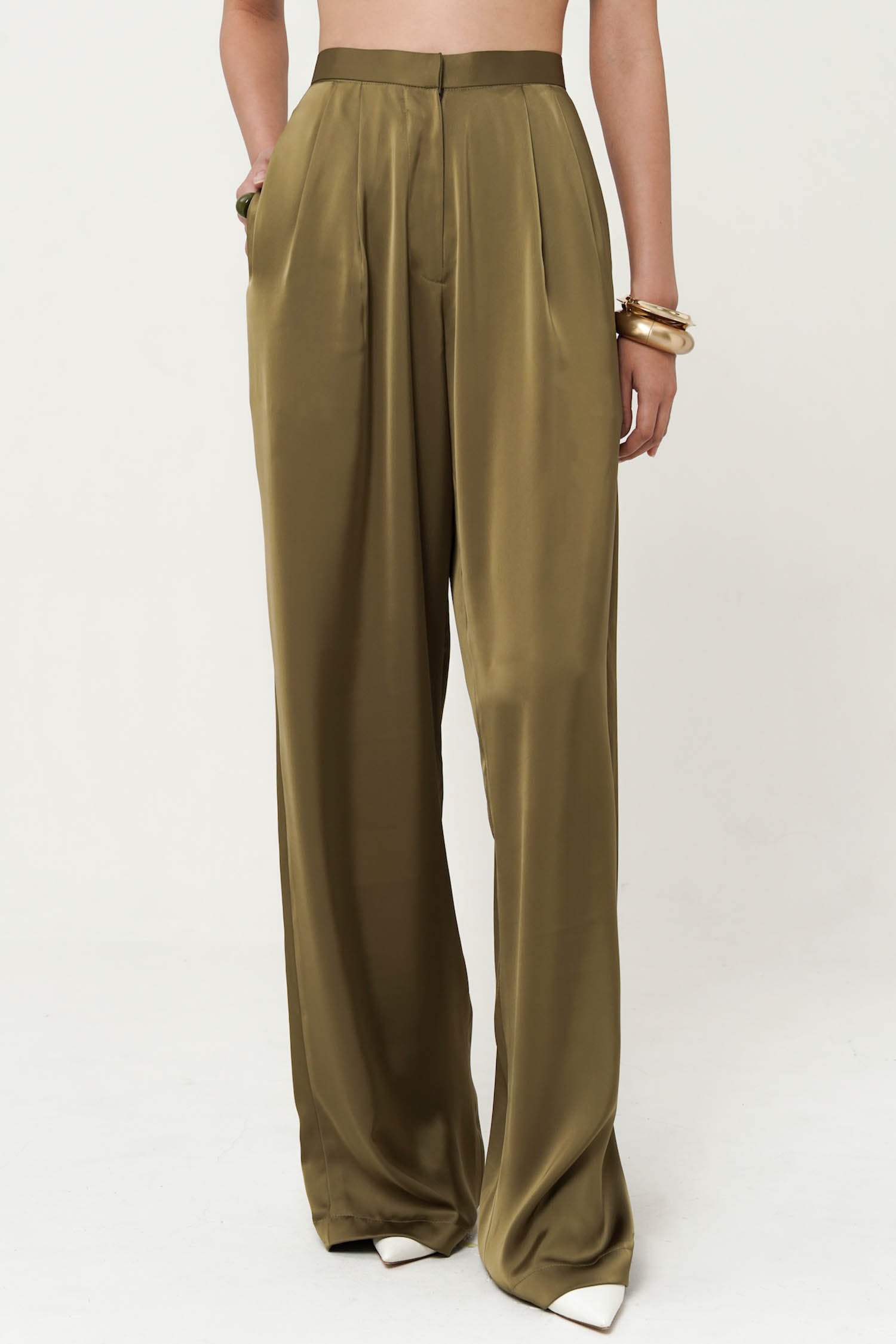 BITSY PANTS IN GREEN These are sateen silk pants in a rich green shade, designed with a relaxed, wide-leg silhouette ...
