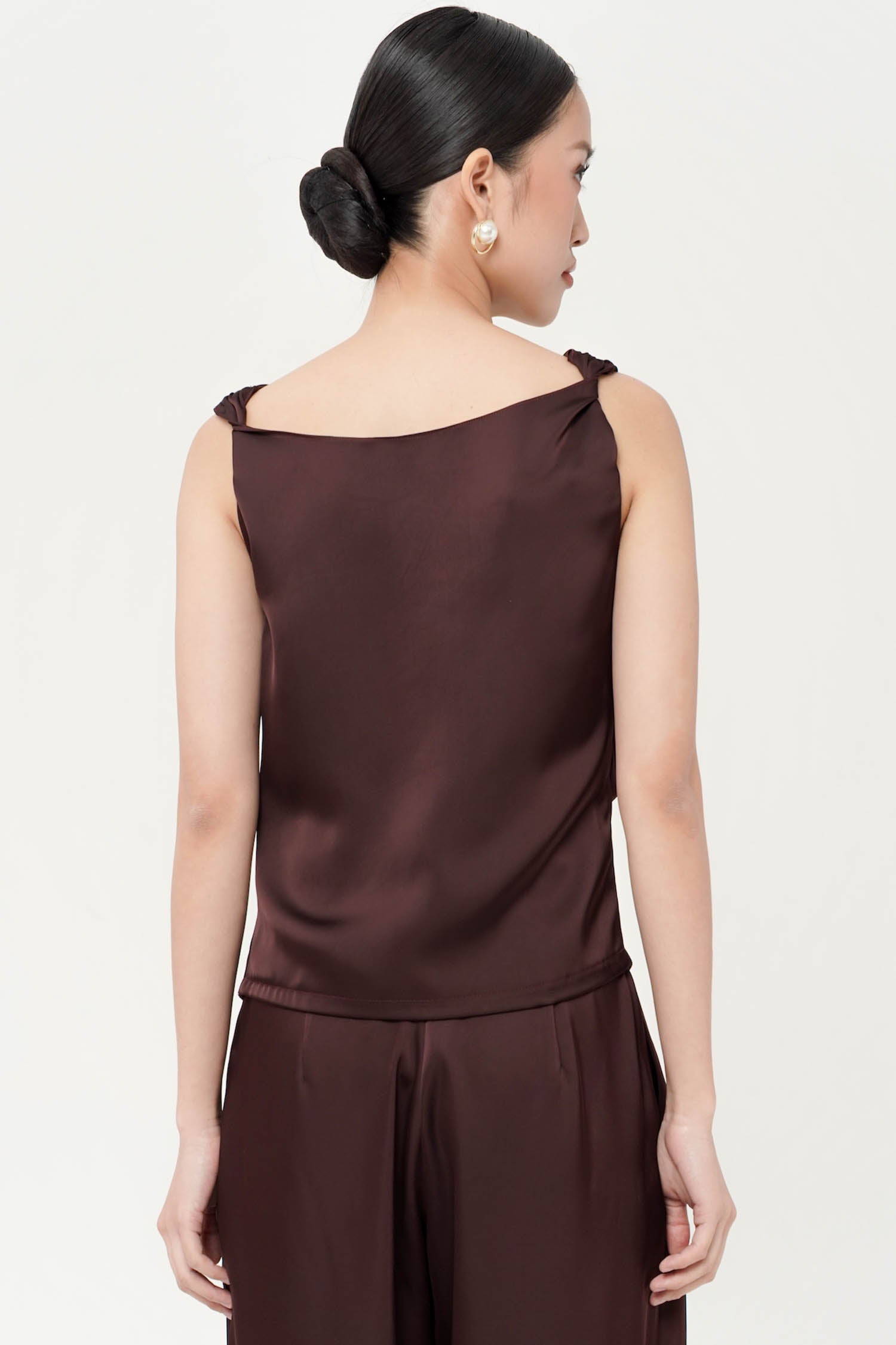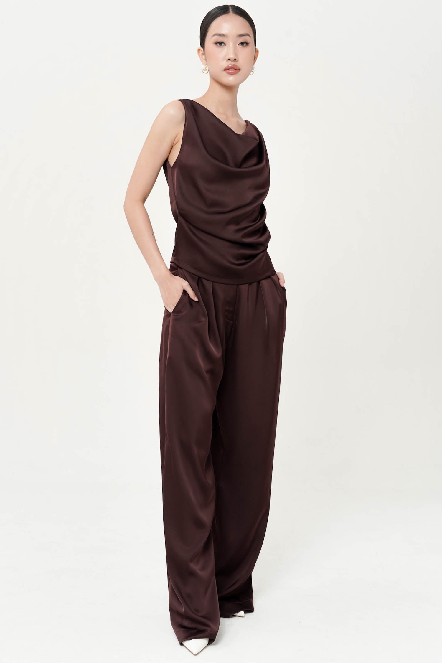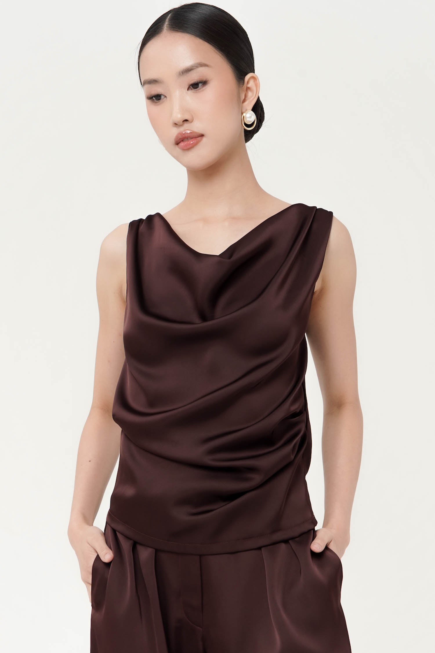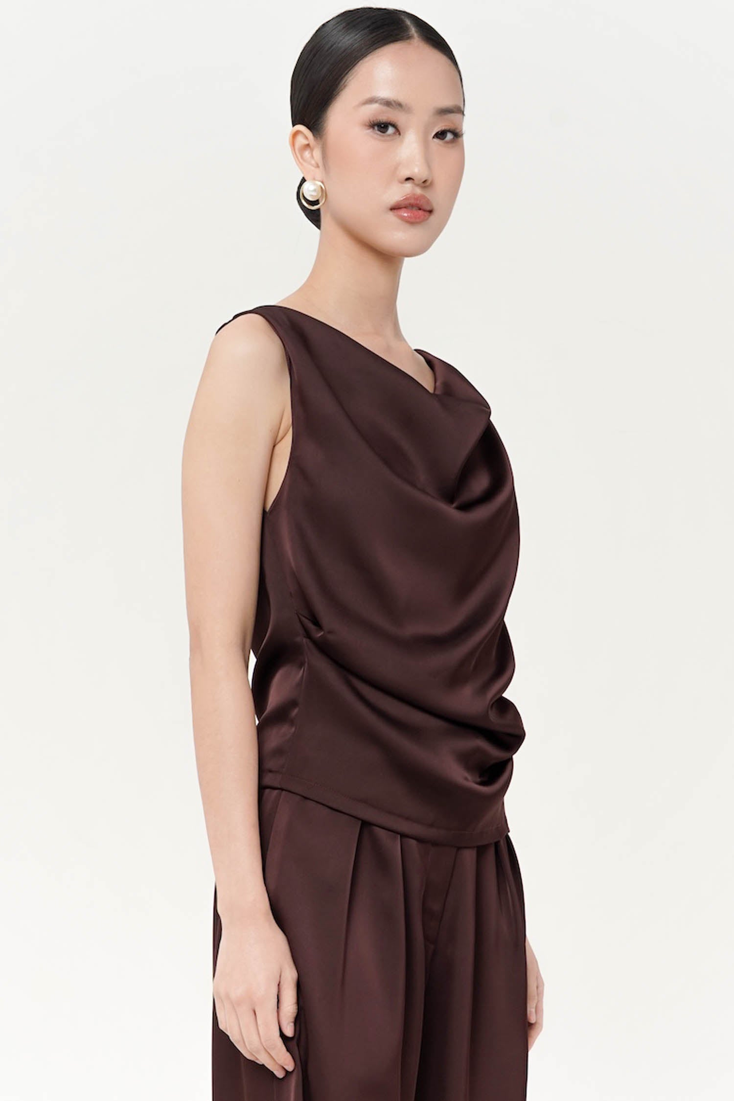 This top is a sleeveless sateen silk blouse. It features a draped cowl neckline, creating a soft and elegant flow across the chest. The fabric has a smooth, slightly glossy finish, typical of silk or satin, which enhances its luxurious and sophisticated look. Perfect for both evening wear and styling with tailored bottoms for a polished outfit. Perfect Matching set with BITSY PANT.