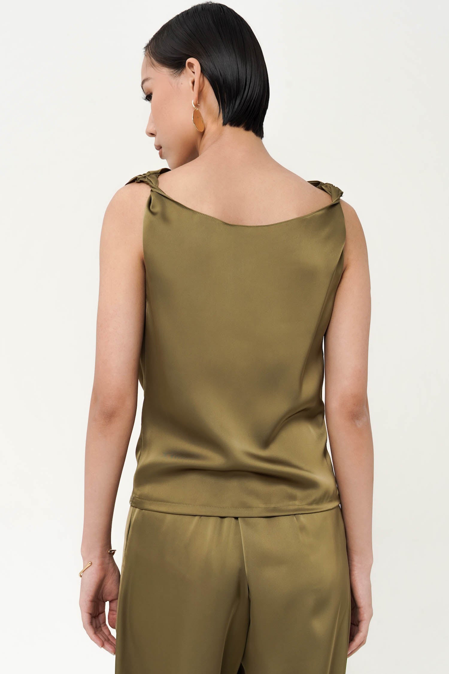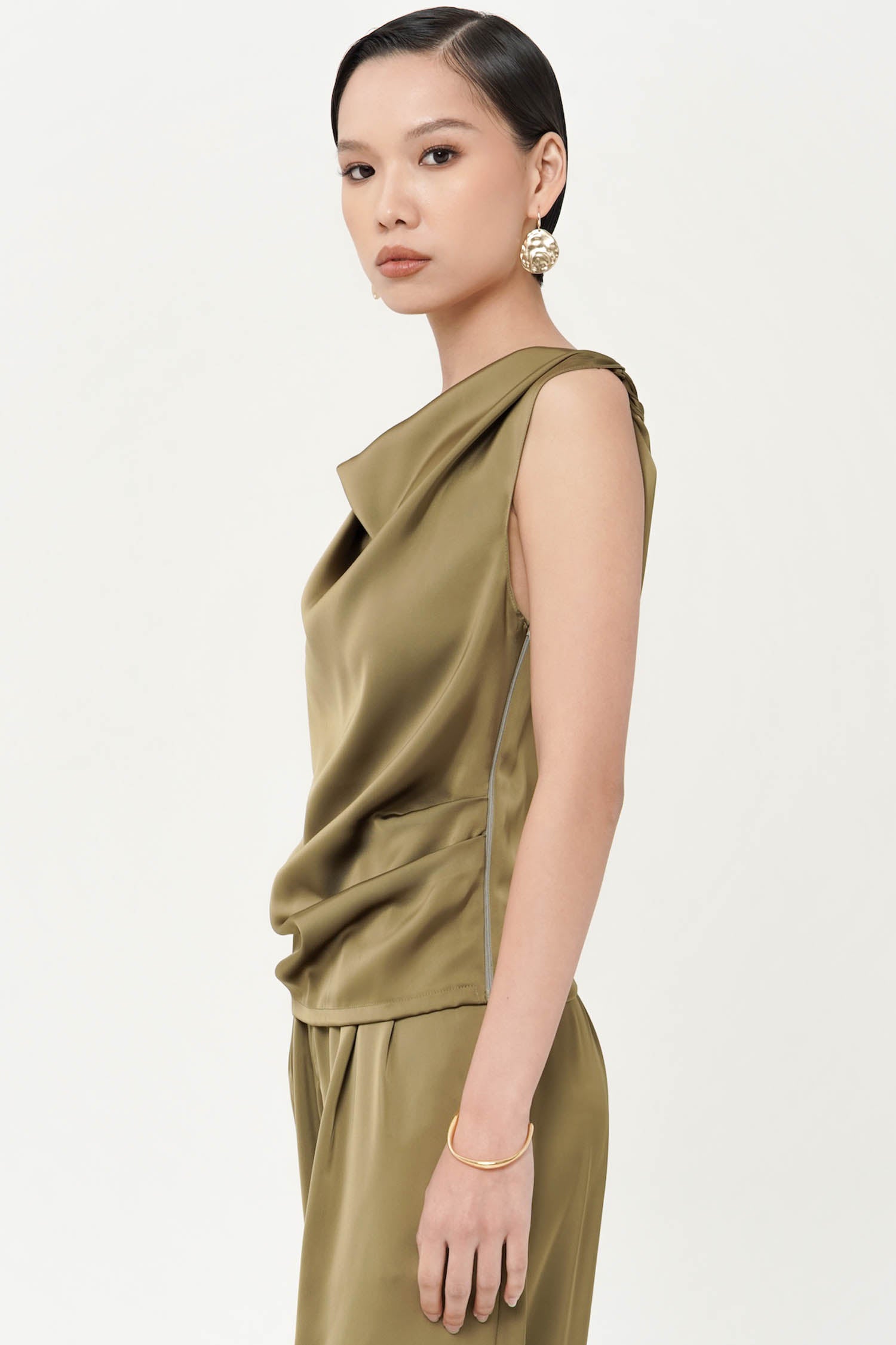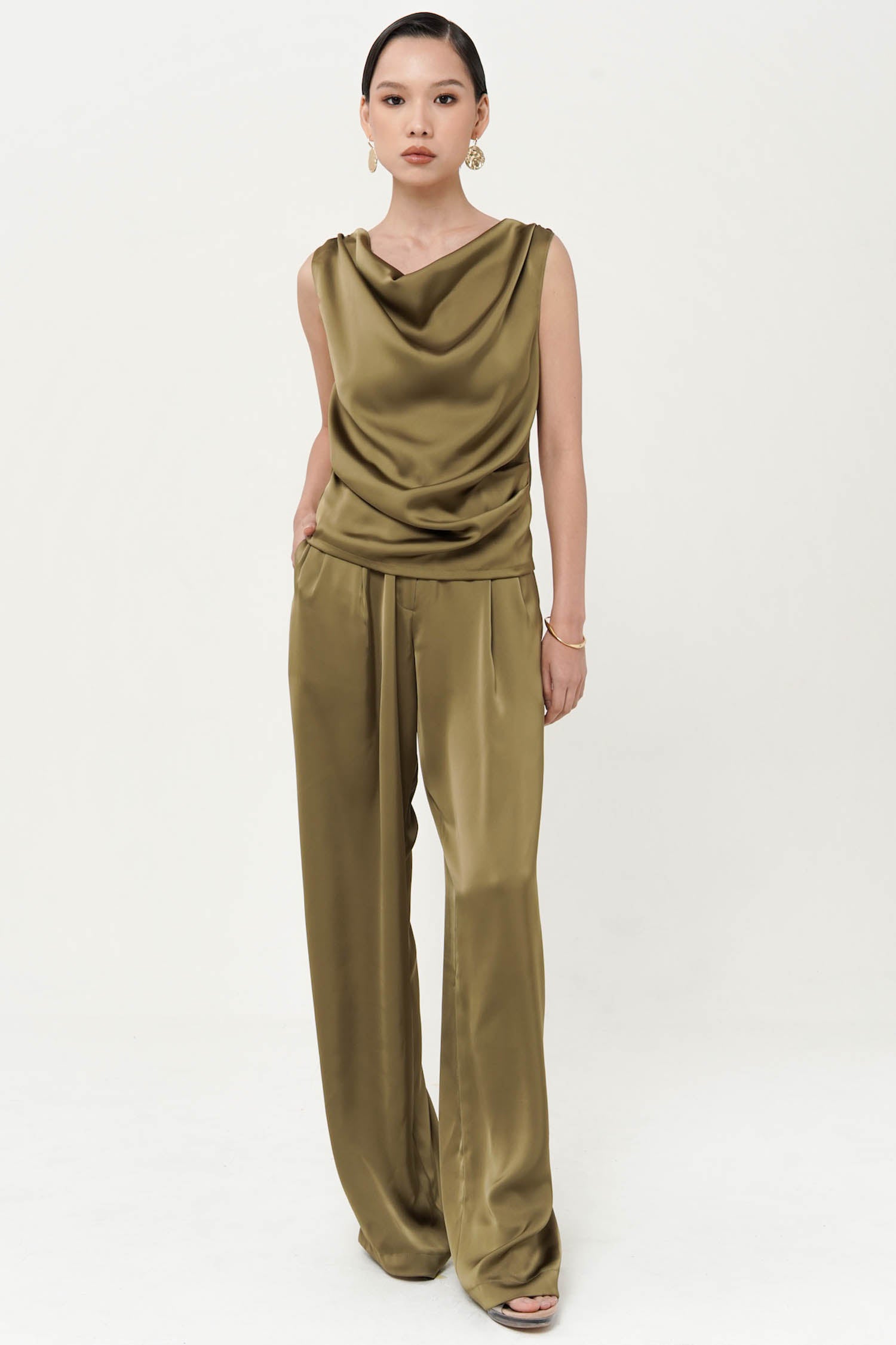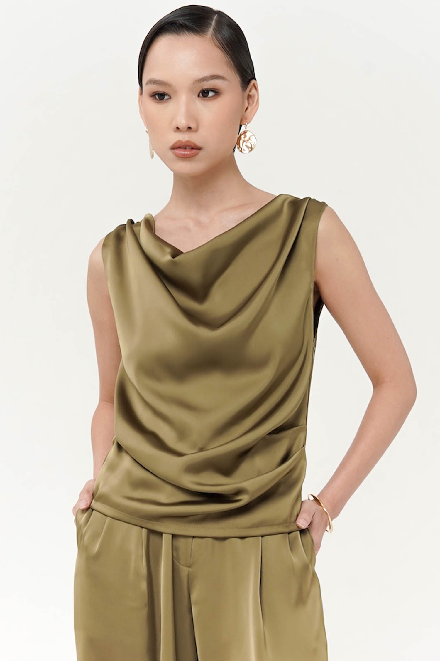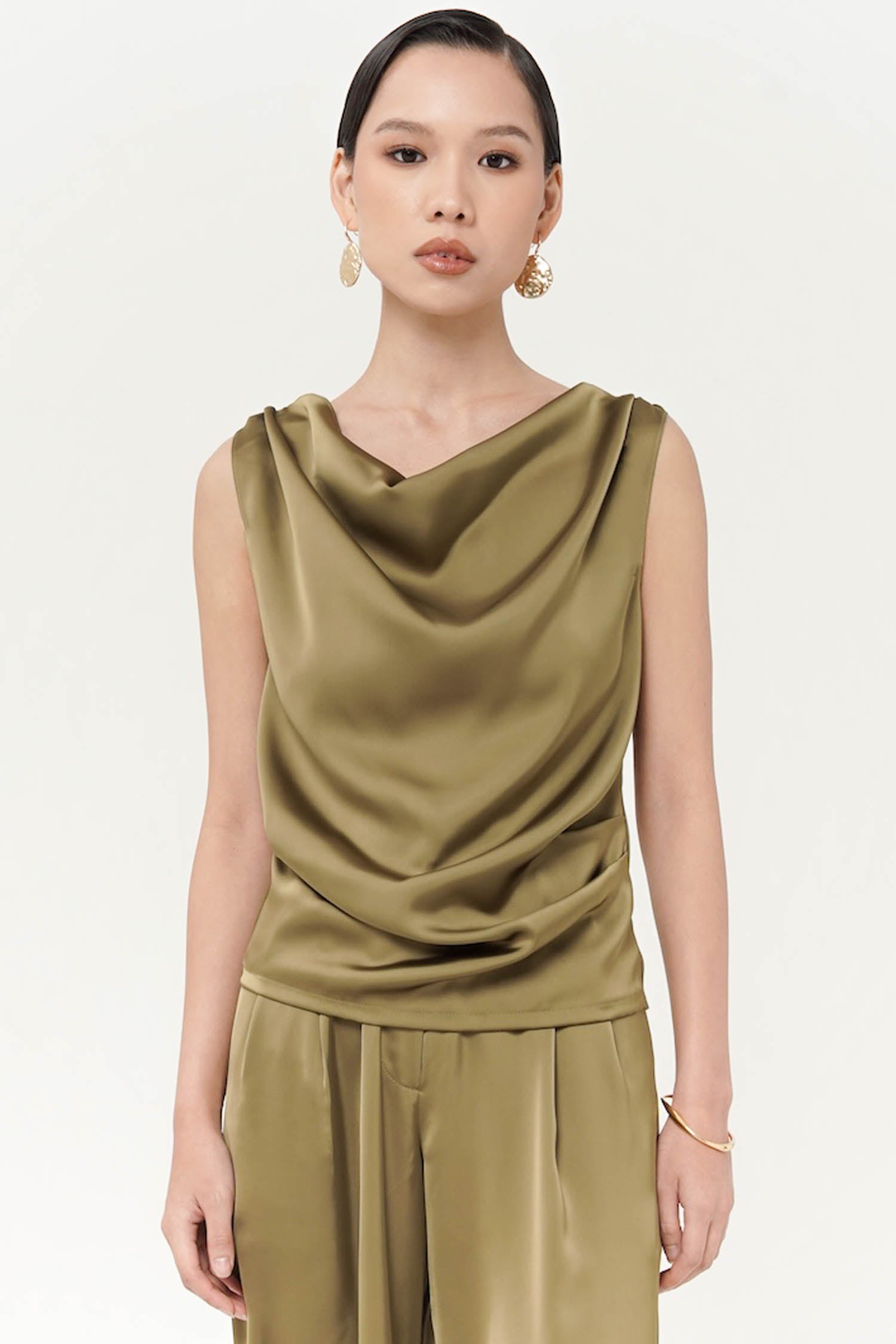 This top is a sleeveless sateen silk blouse in a green shade. It features a draped cowl neckline, creating a soft and elegant flow across the chest. The fabric has a smooth, slightly glossy finish, typical of silk or satin, which enhances its luxurious and sophisticated look. Perfect for both evening wear and styling with tailored bottoms for a polished outfit. Perfect Matching set with BITSY PANT.