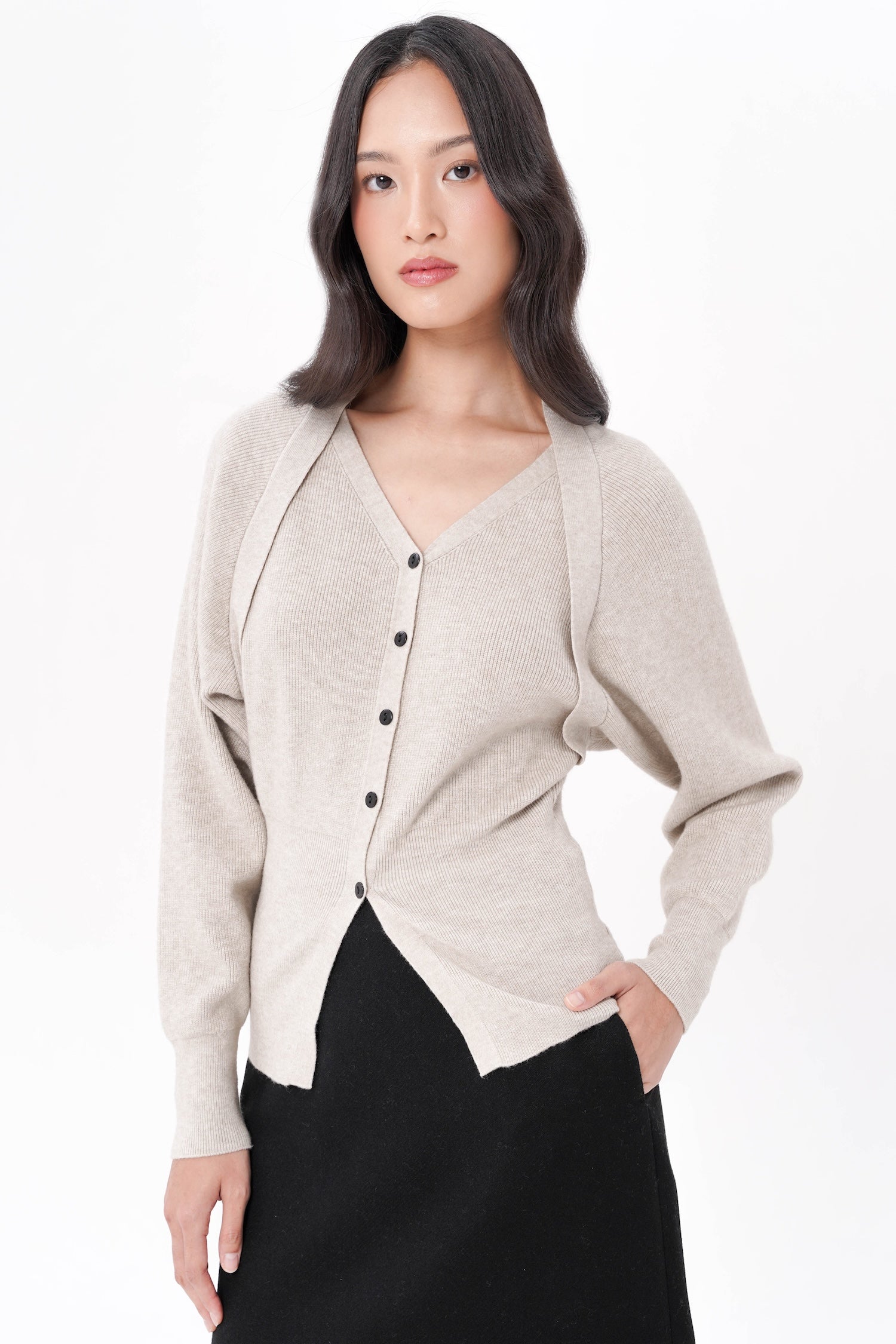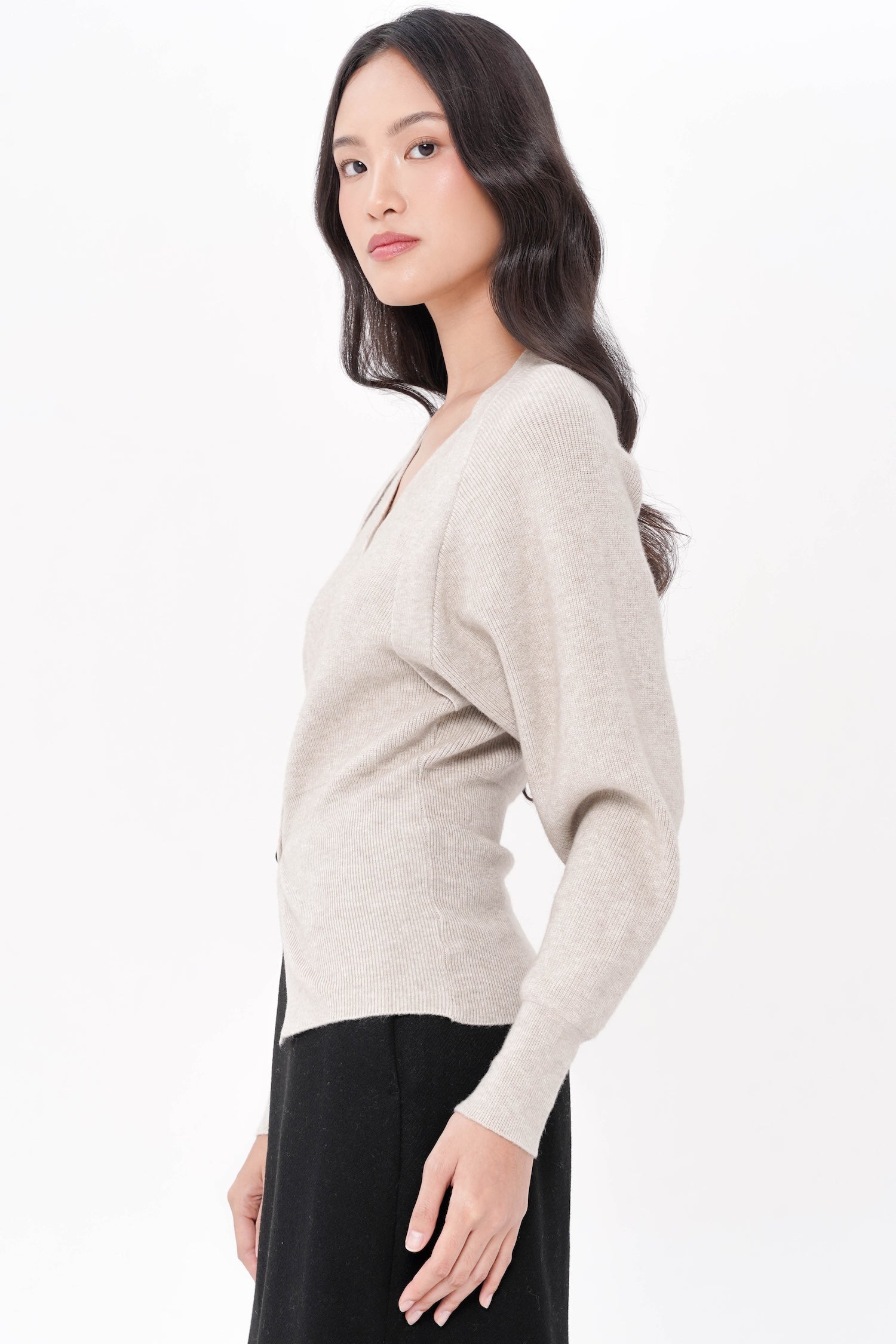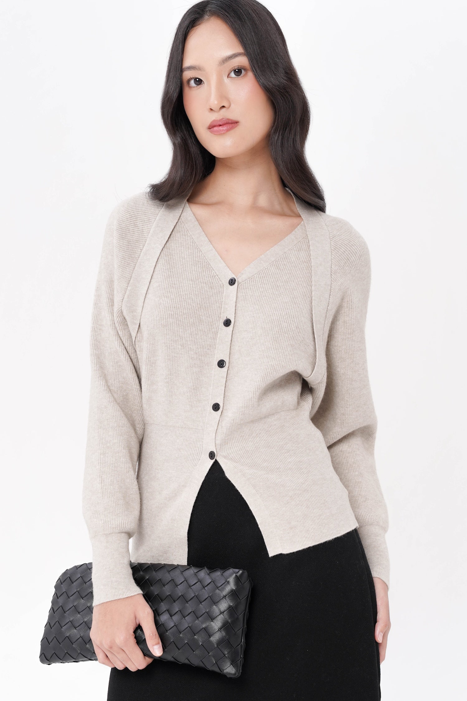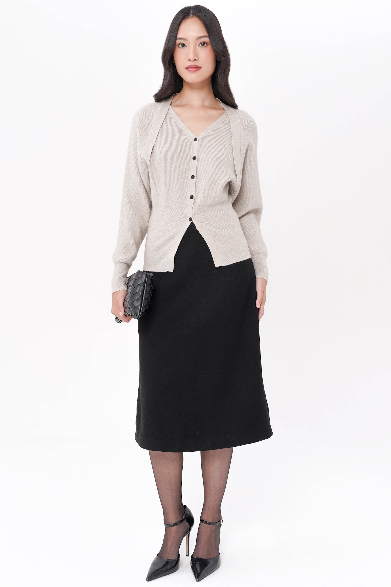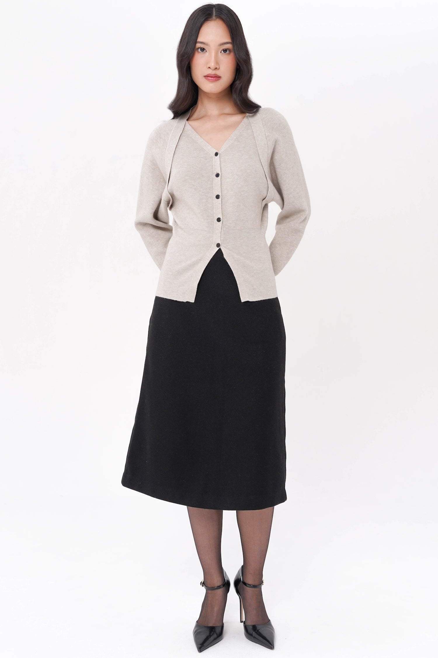 The Briar Knit Cardigan is a refined reinterpretation of a timeless essential, crafted from a soft polyester knit that offers both comfort and elegant structure. Designed with a subtly contoured silhouette, it features a graceful drape through the sleeves that tapers into a defined waist, creating a flattering balance of ease and polish. The button-down front is accented with a clean, modern neckline and a gently notched hem, adding understated sophistication to its minimalist form. Versatile and effortlessly chic, the Briar Knit Cardigan transitions seamlessly from day to evening, making it a wardrobe staple for the discerning modern woman. Available in classic black and warm oat.