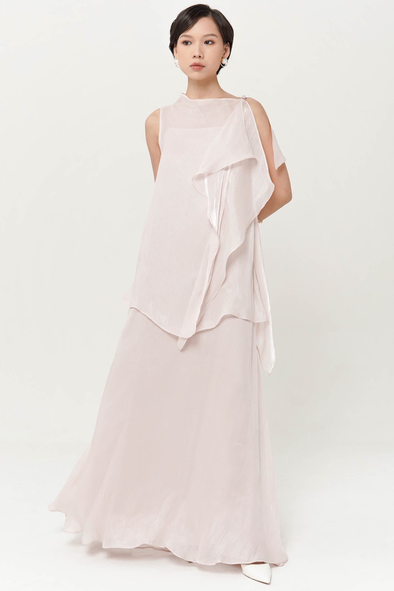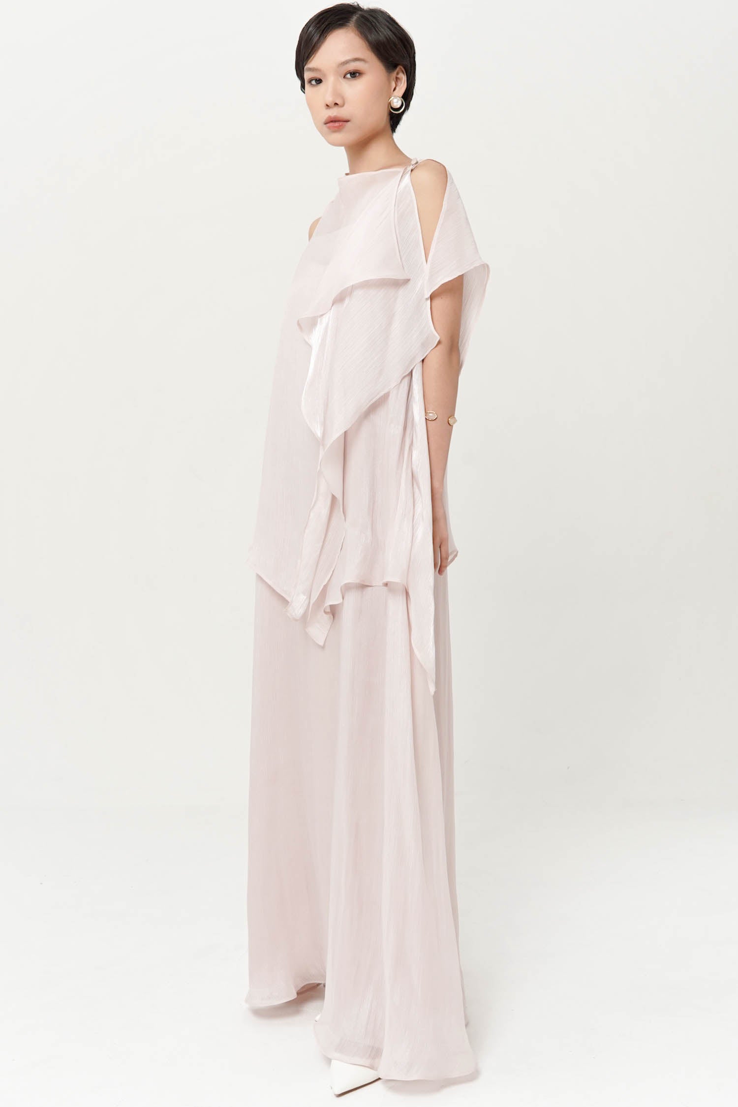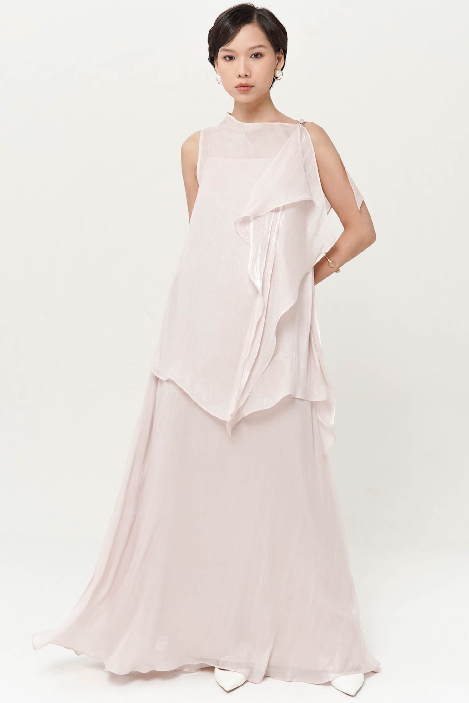 The Cassiopeia Two-Piece Dress in Pink is a poetic expression of fluid elegance, crafted from silk shimmer polyester that catches the light with a subtle, ethereal glow. Designed as a layered ensemble, the sleeveless overlay drapes asymmetrically with soft cascading folds, creating movement and depth, while delicate cut-out shoulder details add a whisper of modern sensuality. The floor-length skirt flows effortlessly beneath, elongating the silhouette with refined grace. Presented in a delicate blush tone, this two-piece dress embodies understated sophistication, making it a timeless choice for evening gatherings, formal occasions, or moments that call for quiet yet striking presence.