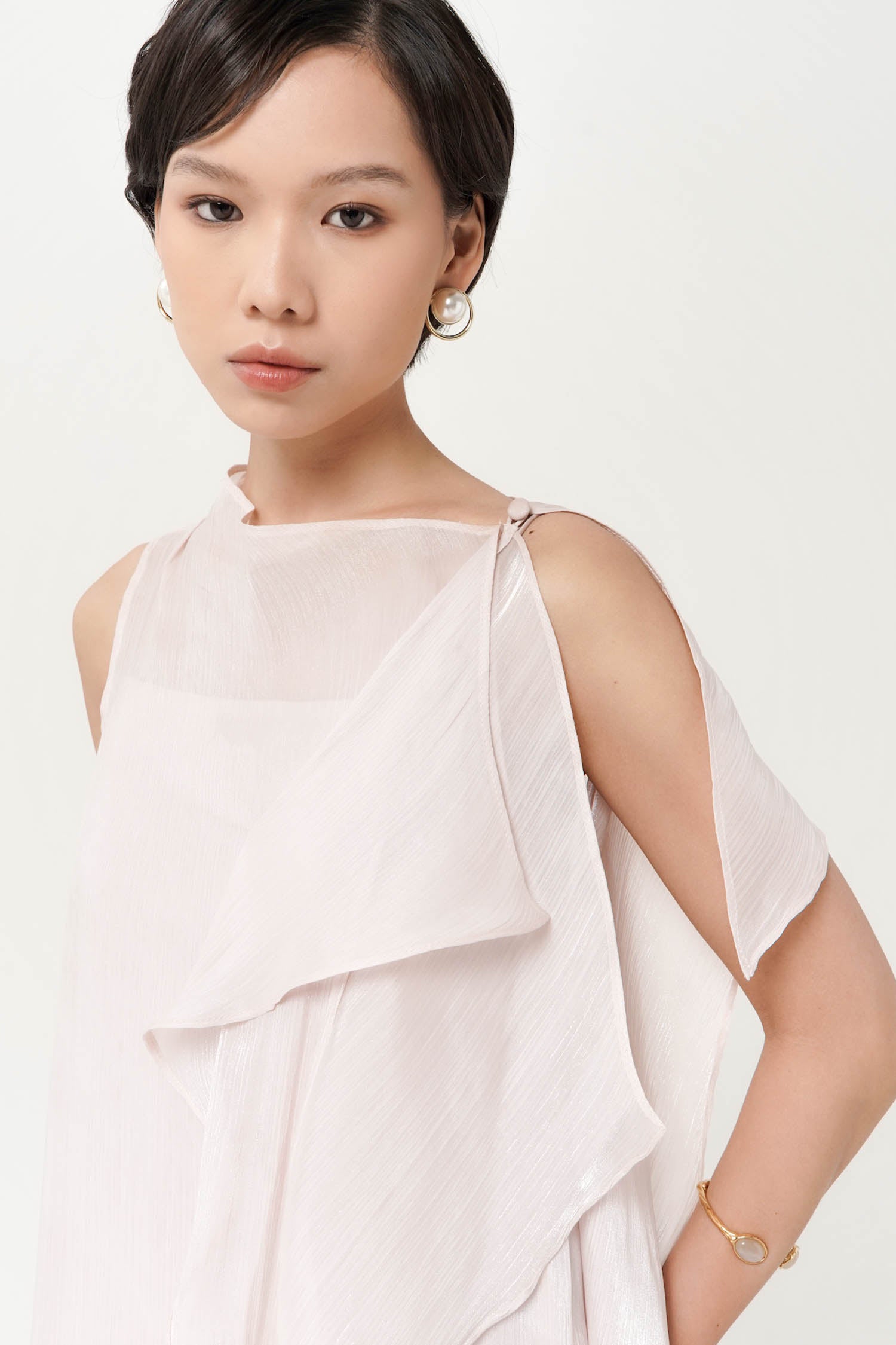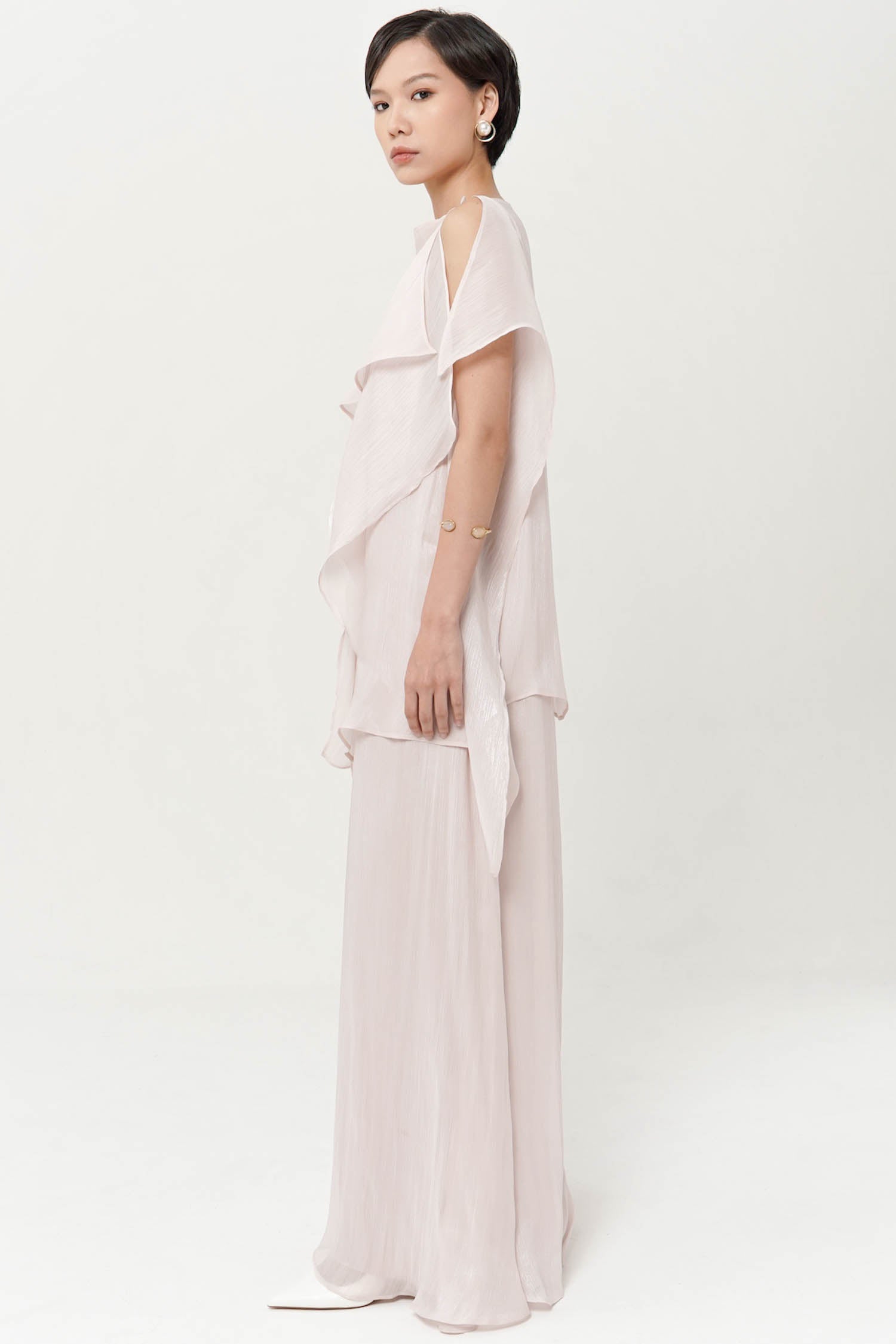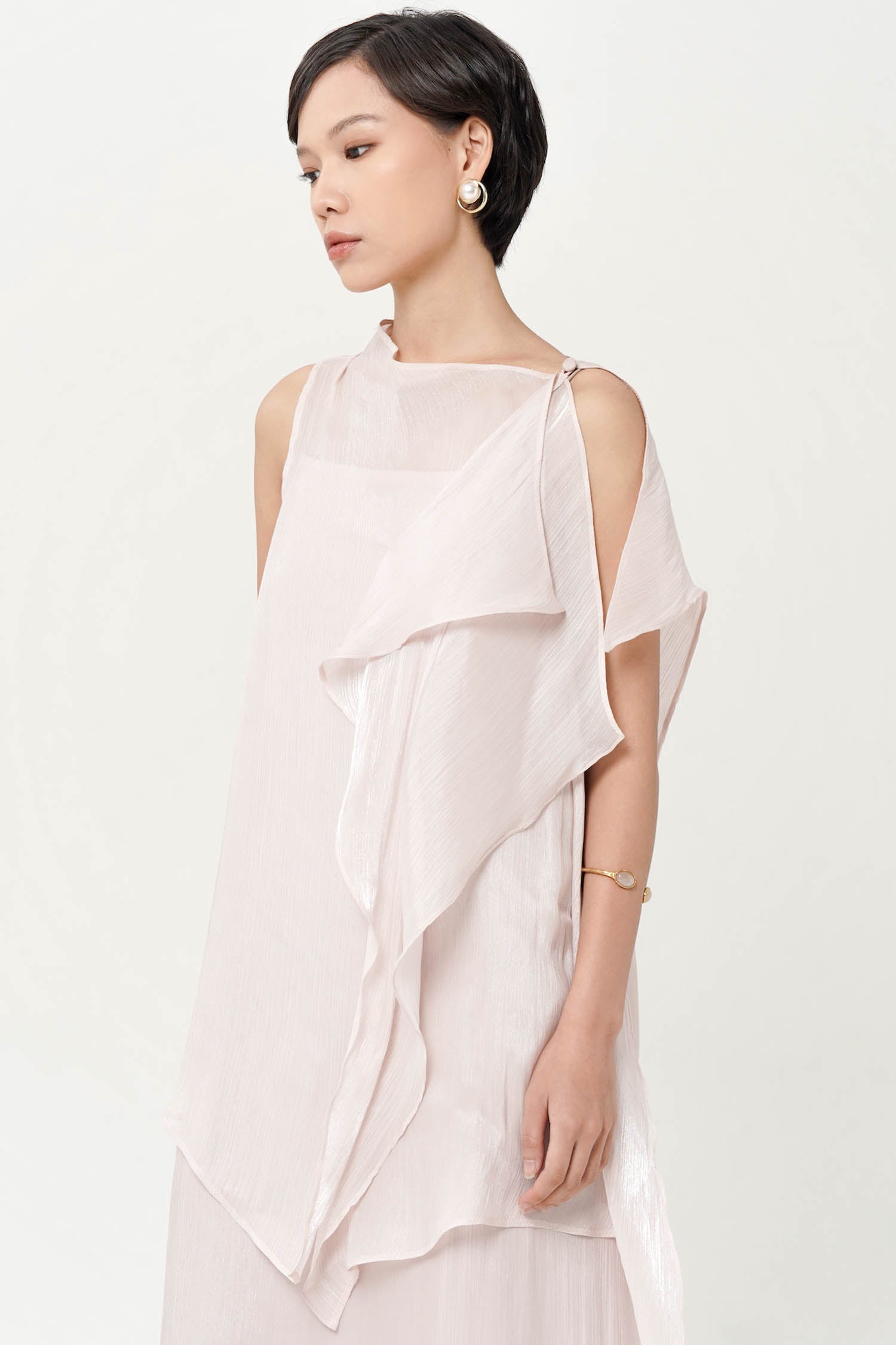 The Cassiopeia Two-Piece Dress in Pink is a poetic expression of fluid elegance, crafted from silk shimmer polyester that catches the light with a subtle, ethereal glow. Designed as a layered ensemble, the sleeveless overlay drapes asymmetrically with soft cascading folds, creating movement and depth, while delicate cut-out shoulder details add a whisper of modern sensuality. The floor-length skirt flows effortlessly beneath, elongating the silhouette with refined grace. Presented in a delicate blush tone, this two-piece dress embodies understated sophistication, making it a timeless choice for evening gatherings, formal occasions, or moments that call for quiet yet striking presence.