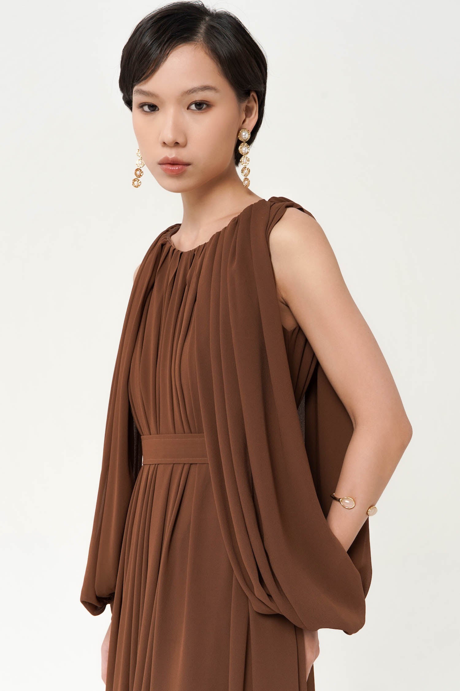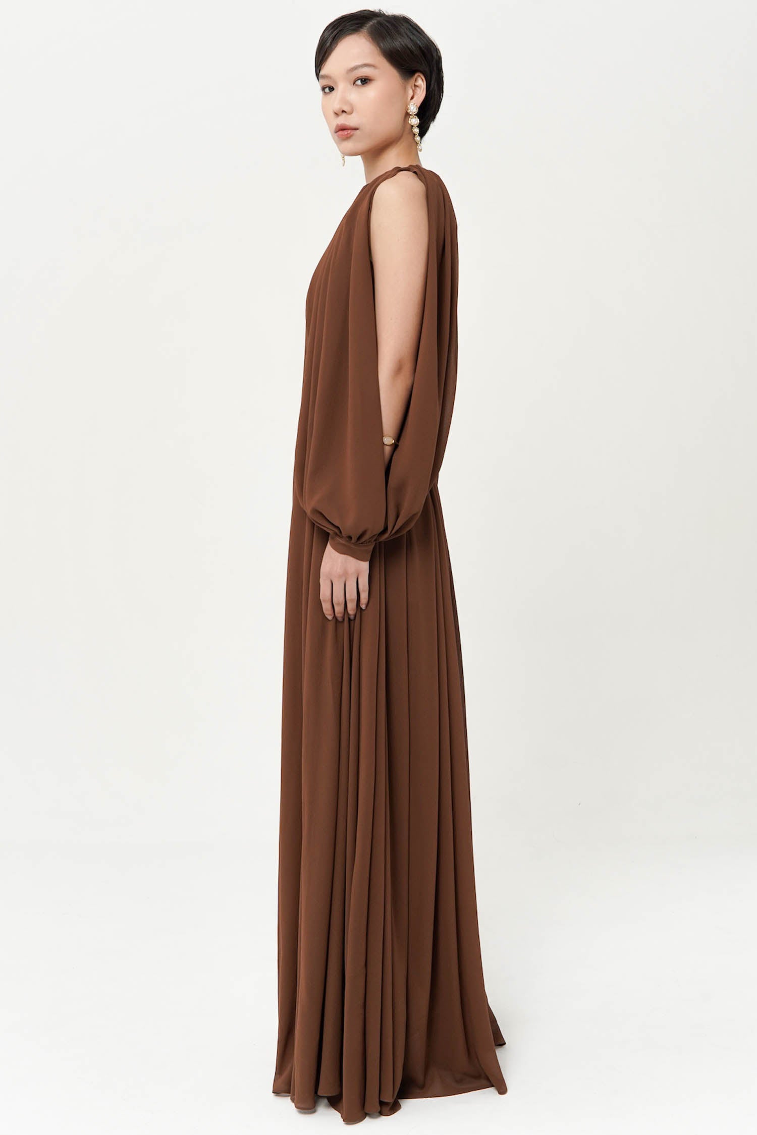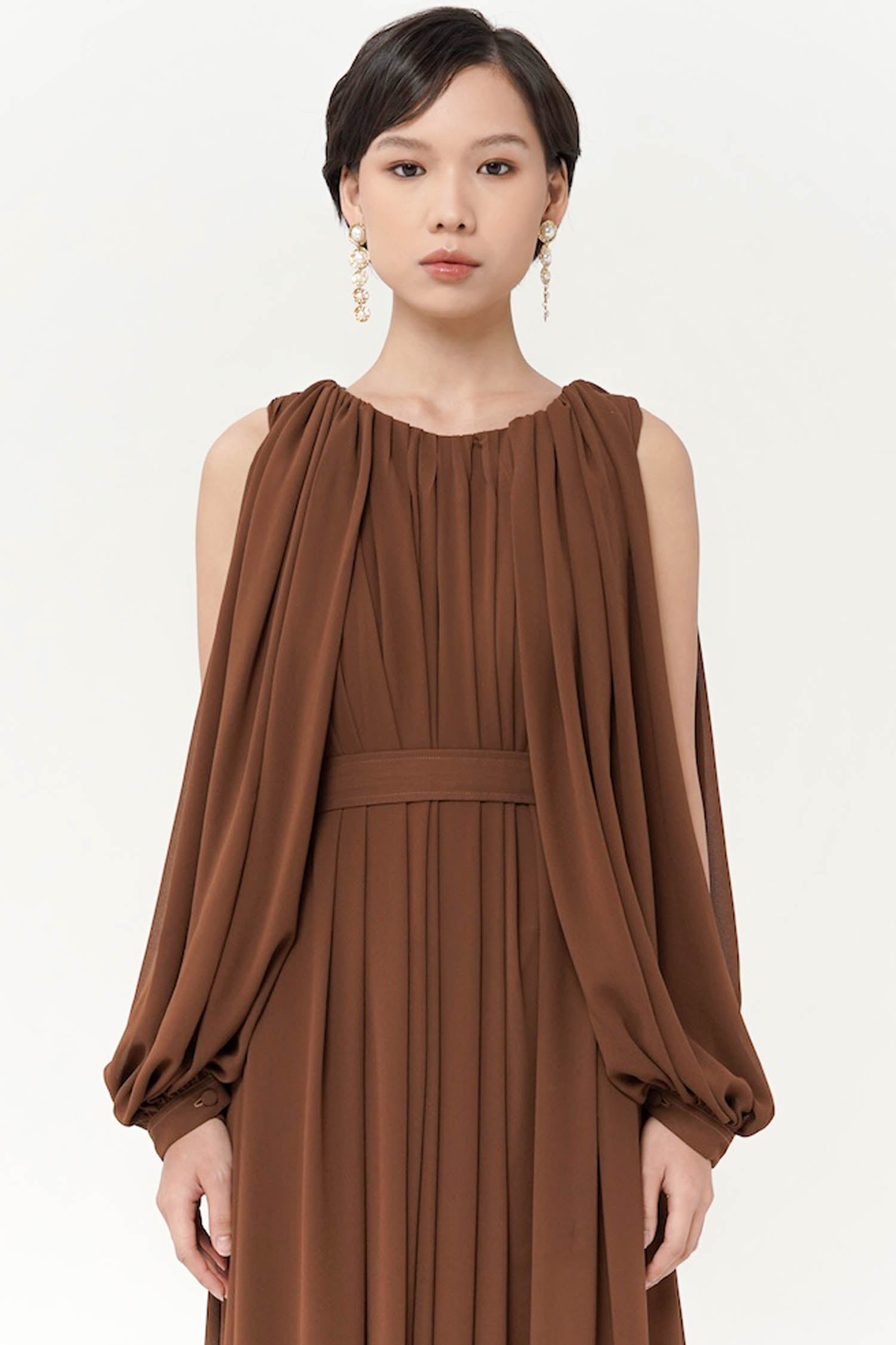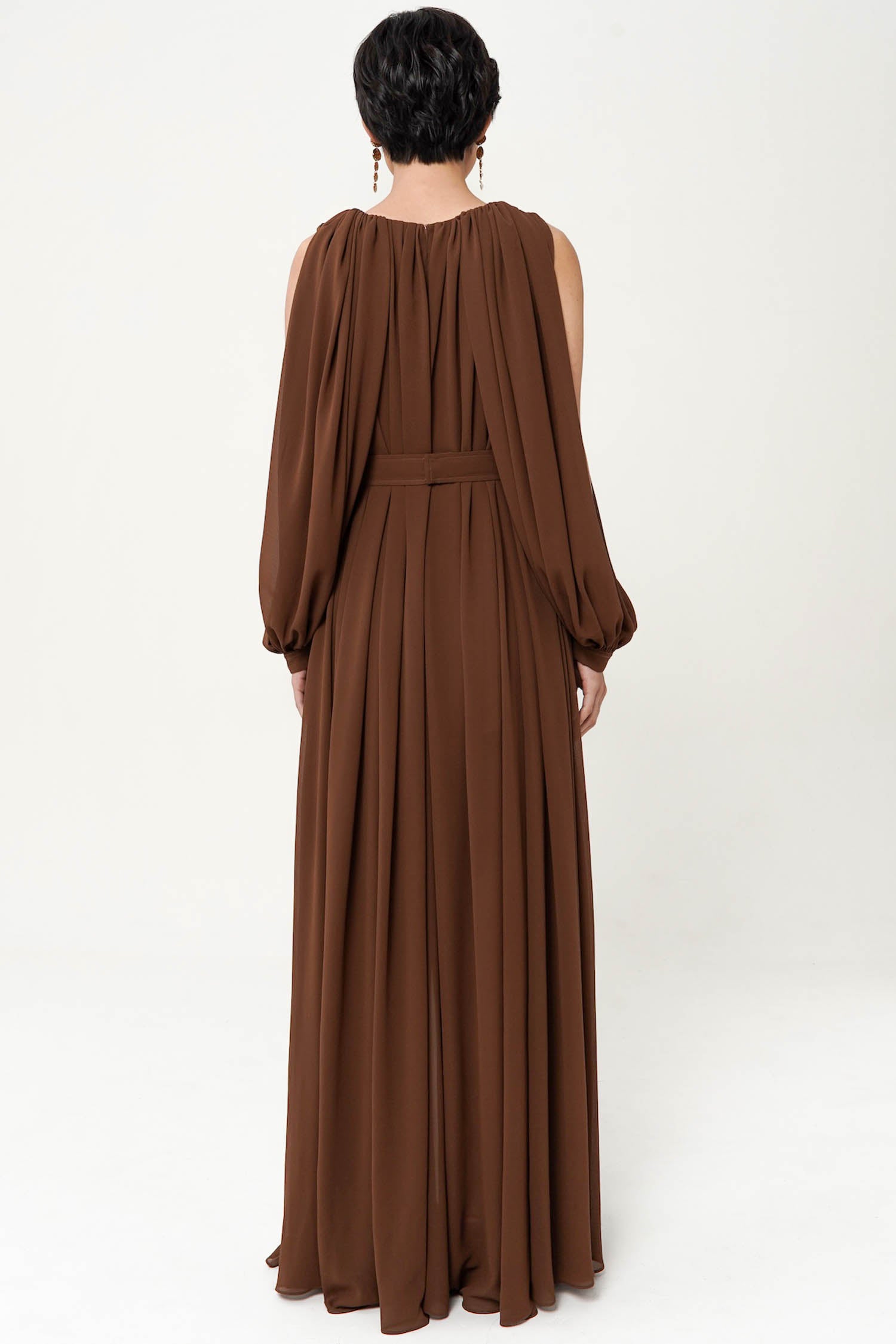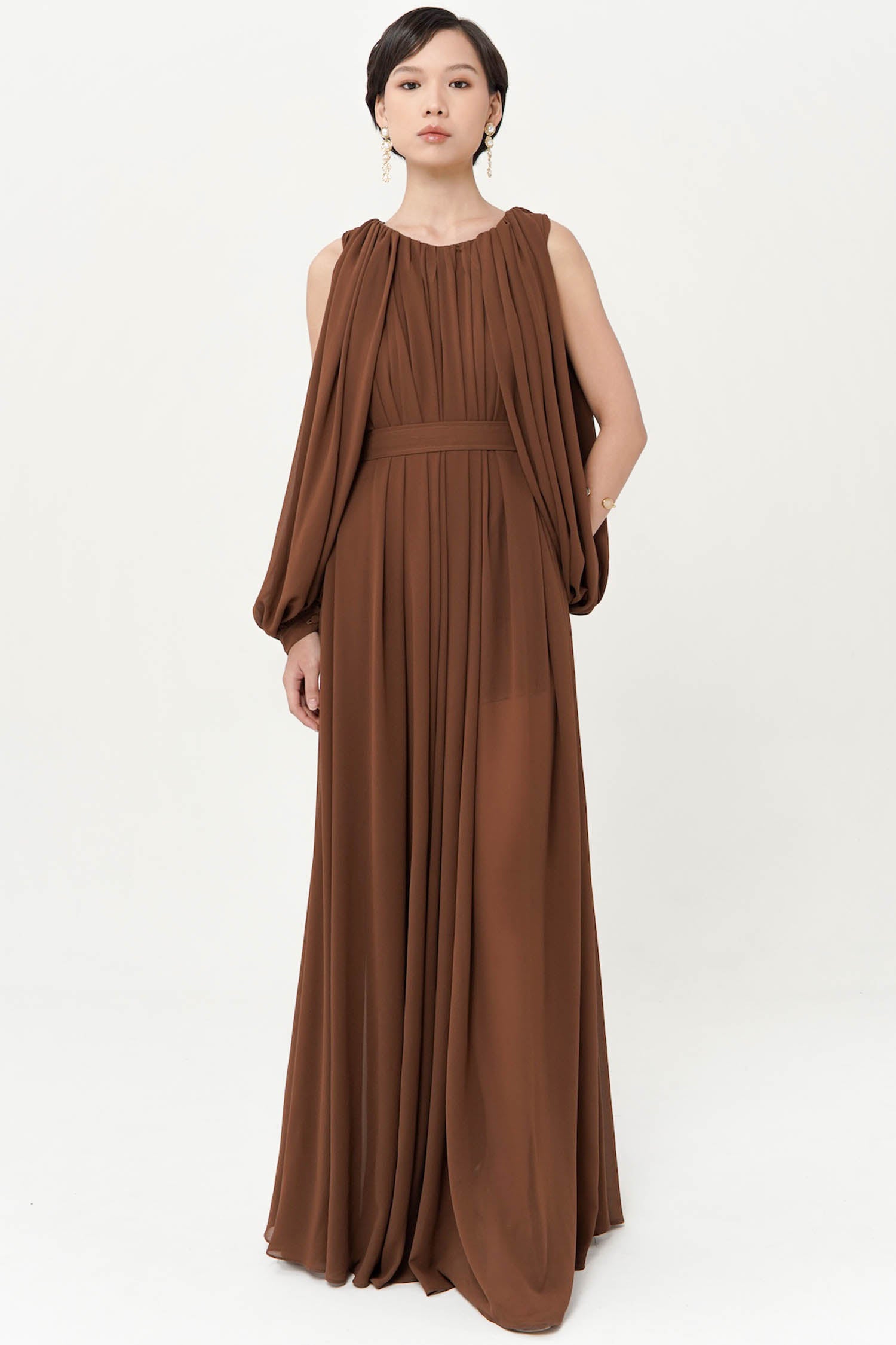 Brown Maxi Gathered Dress with Belt and Slit. There is Might Be a Slight difference in Color Due to Lighting