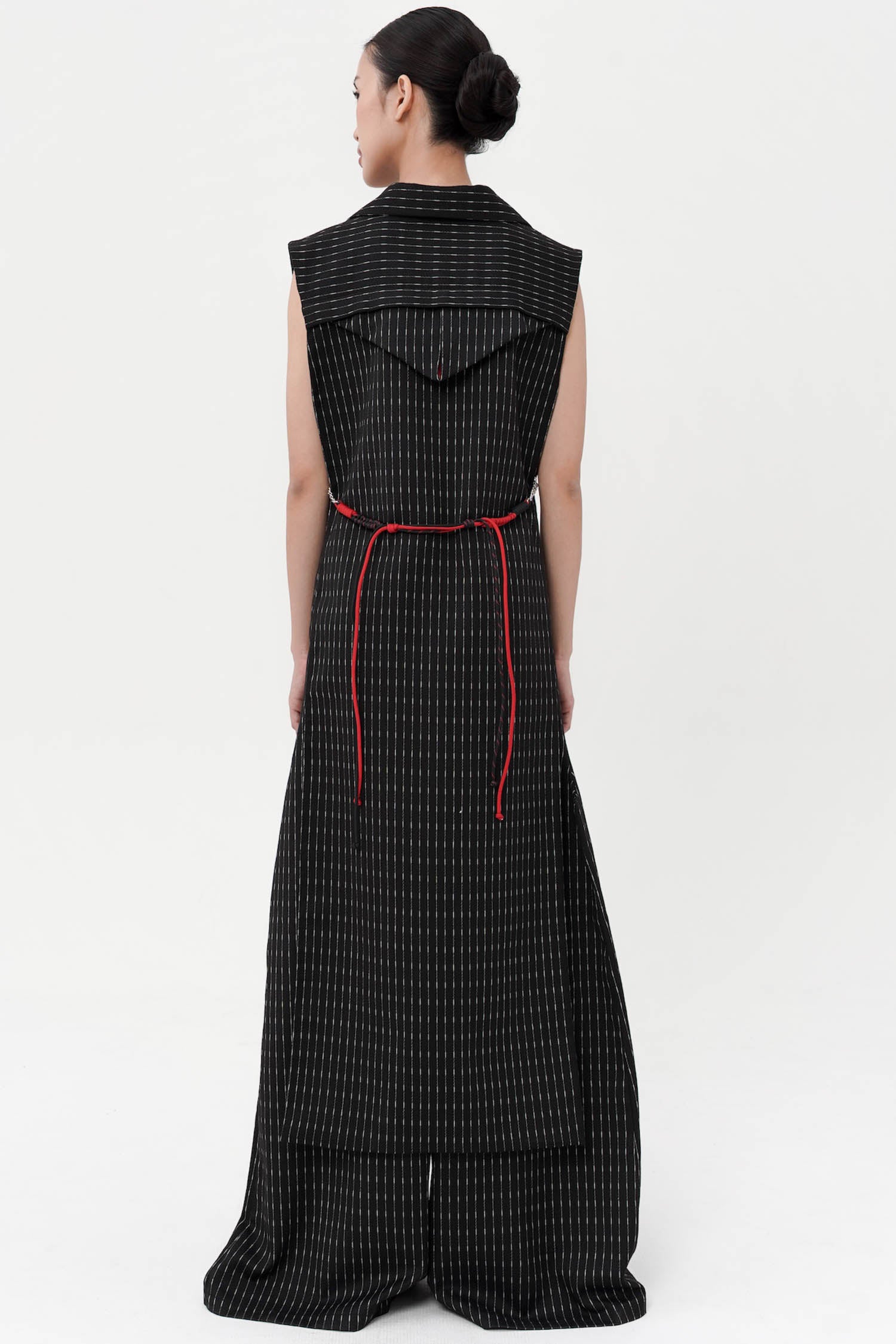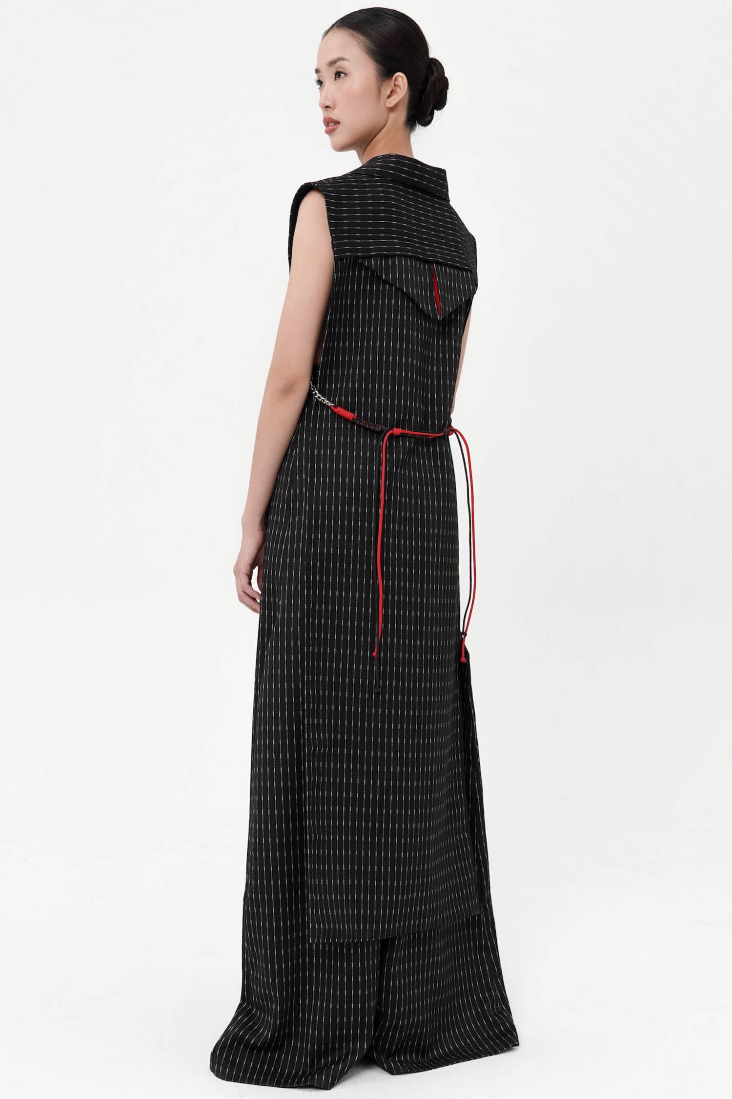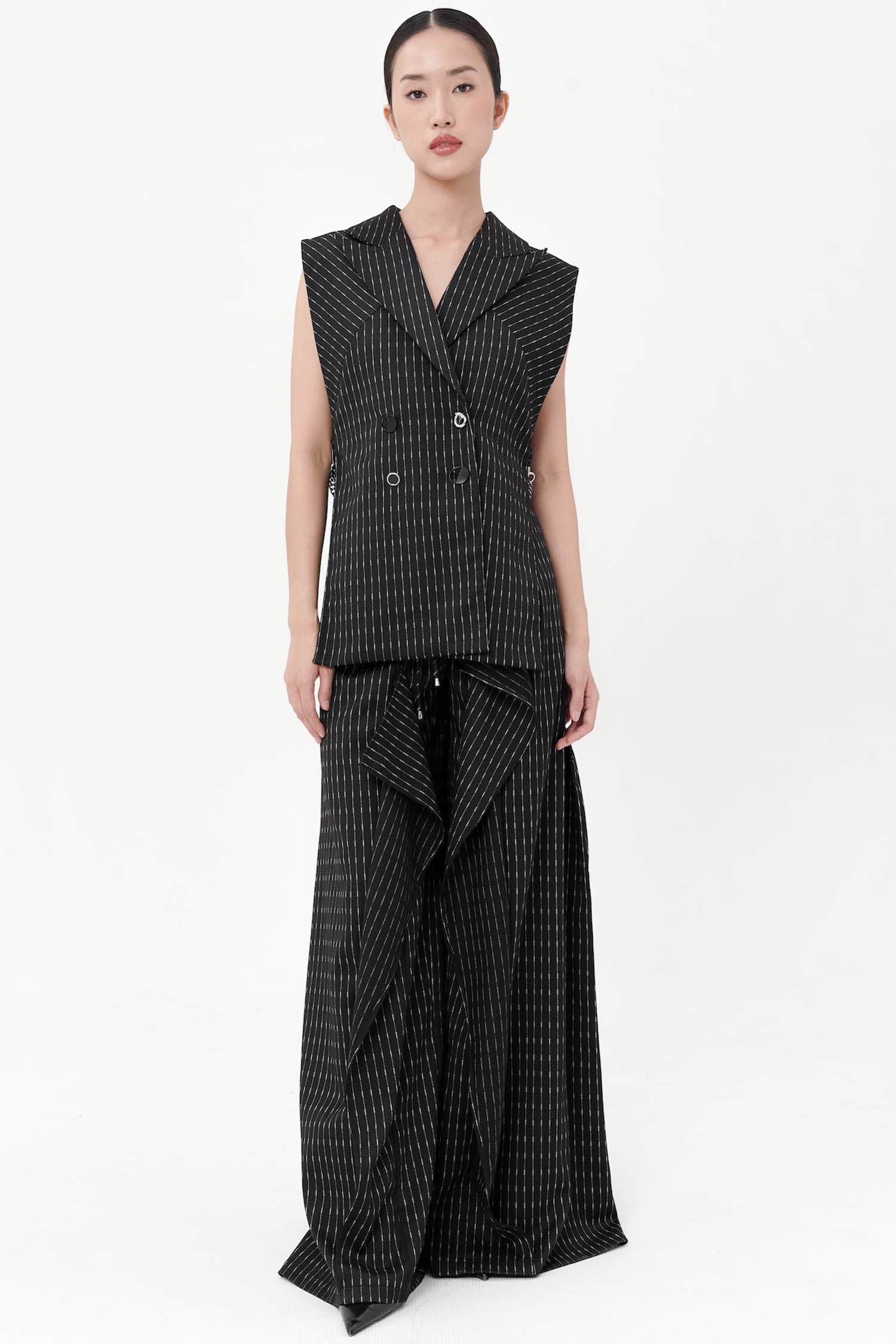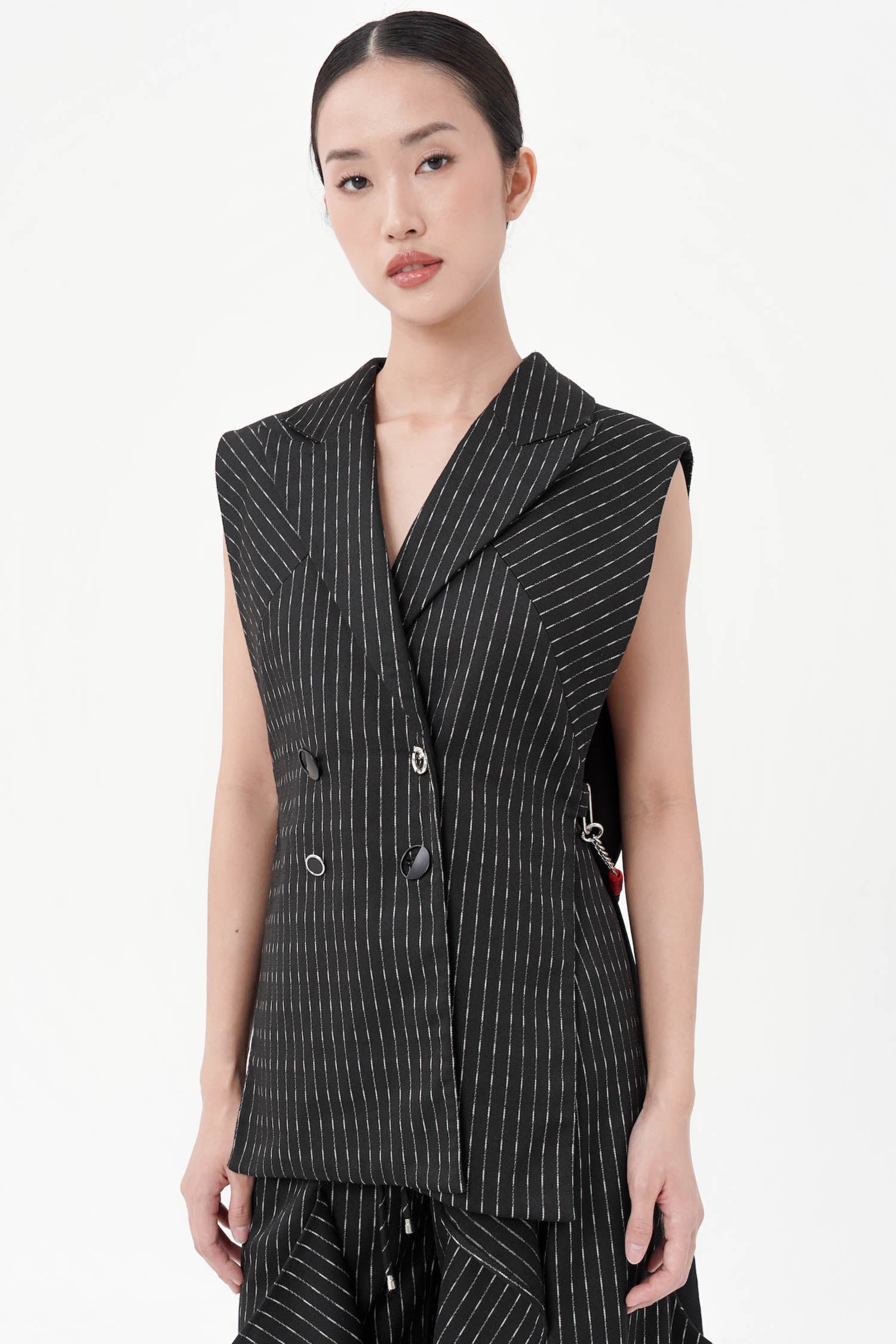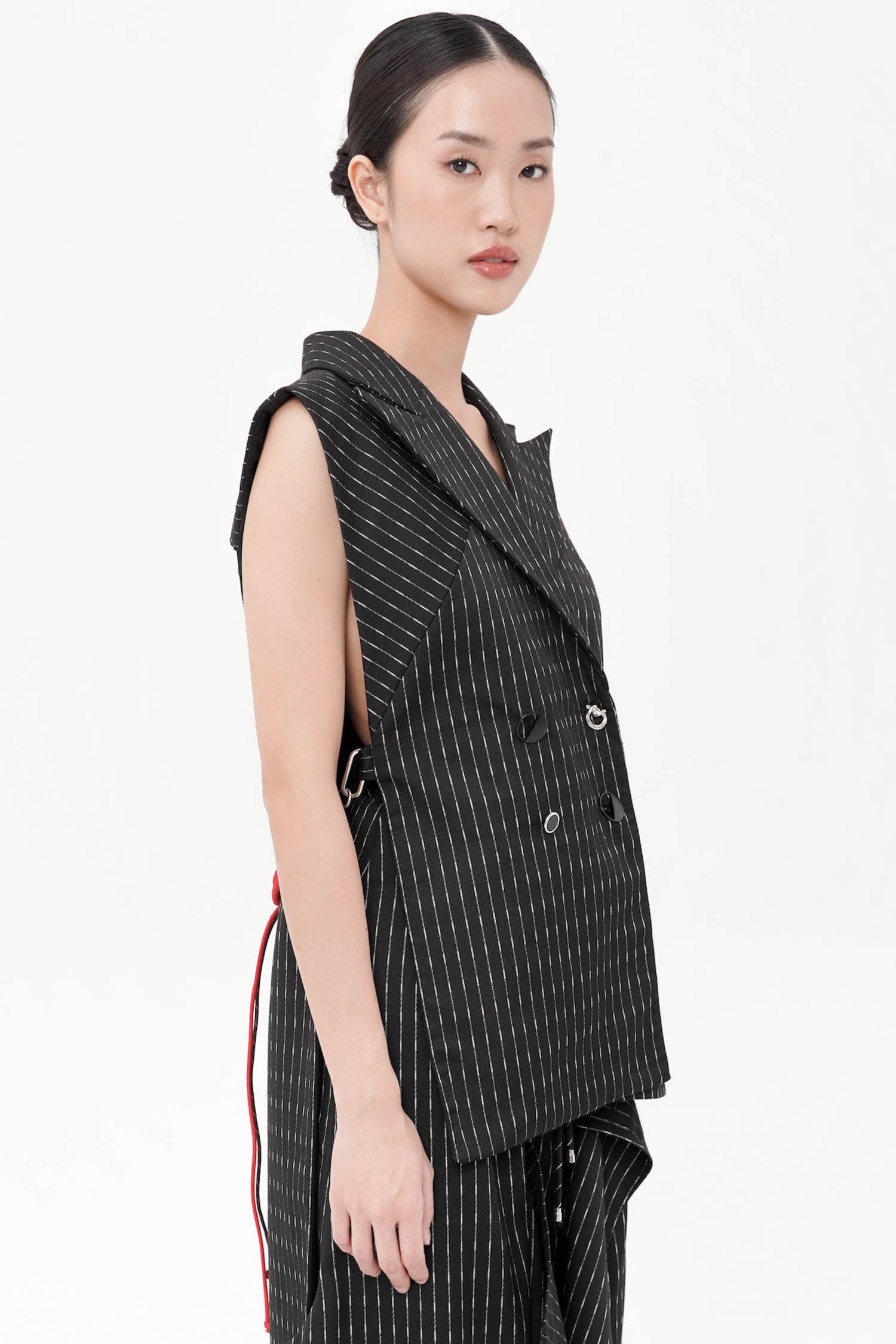Presenting a refined straight cut paired with a double-breasted front for a timeless and structured silhouette, this vest features step hem with detach- and adjustable chain-macrame belt at the back.