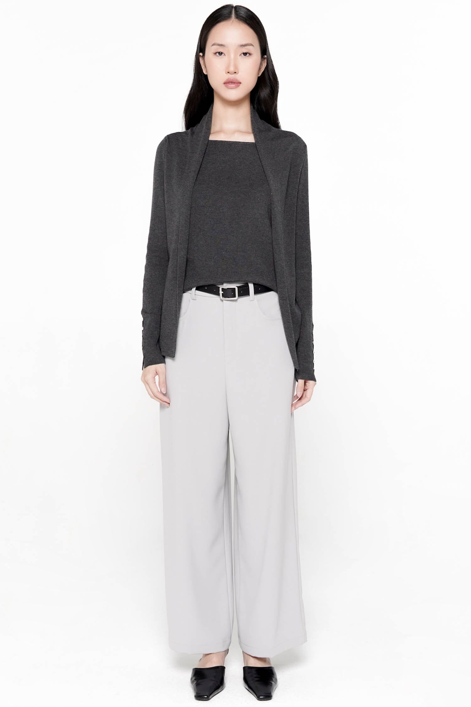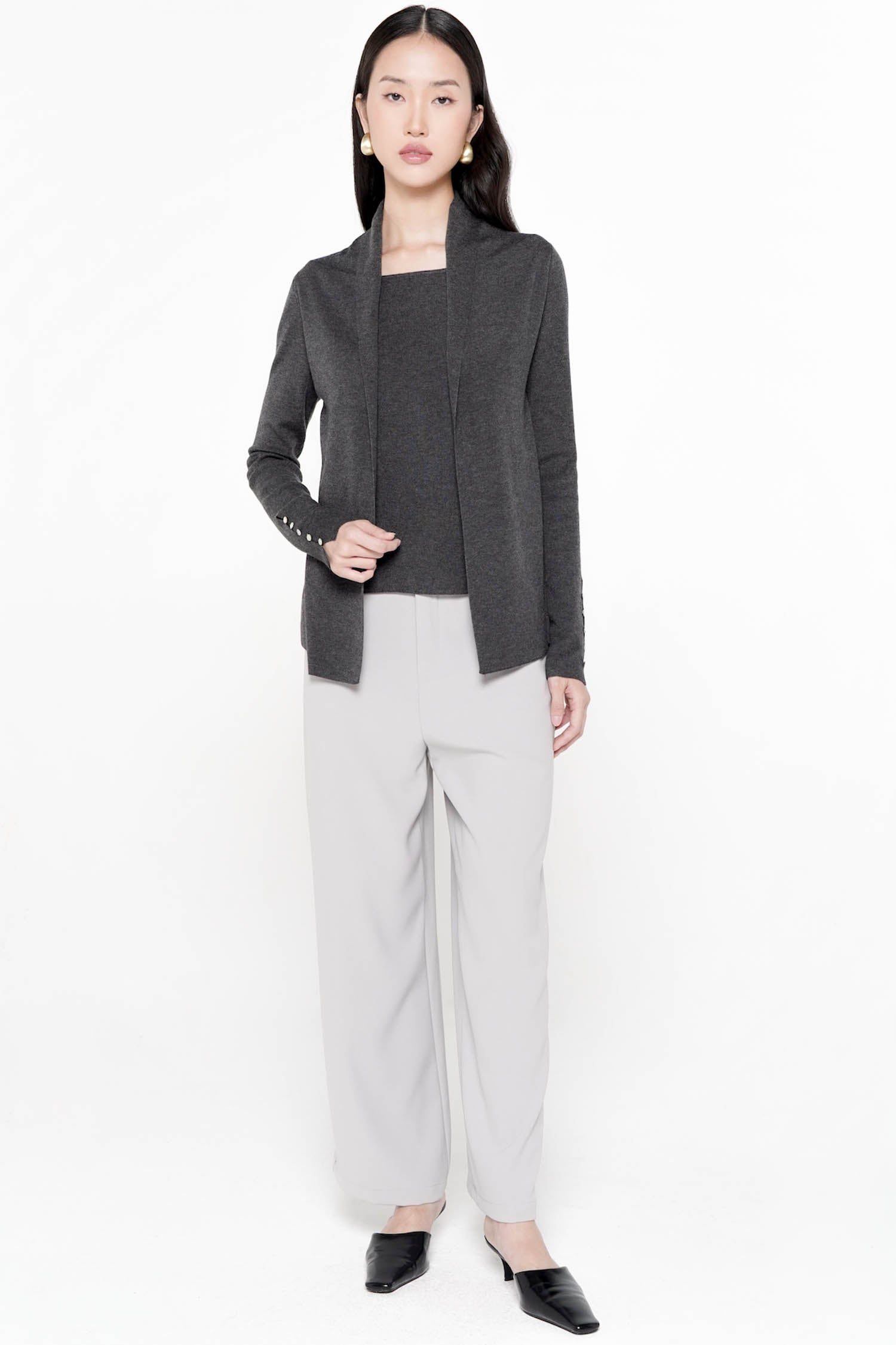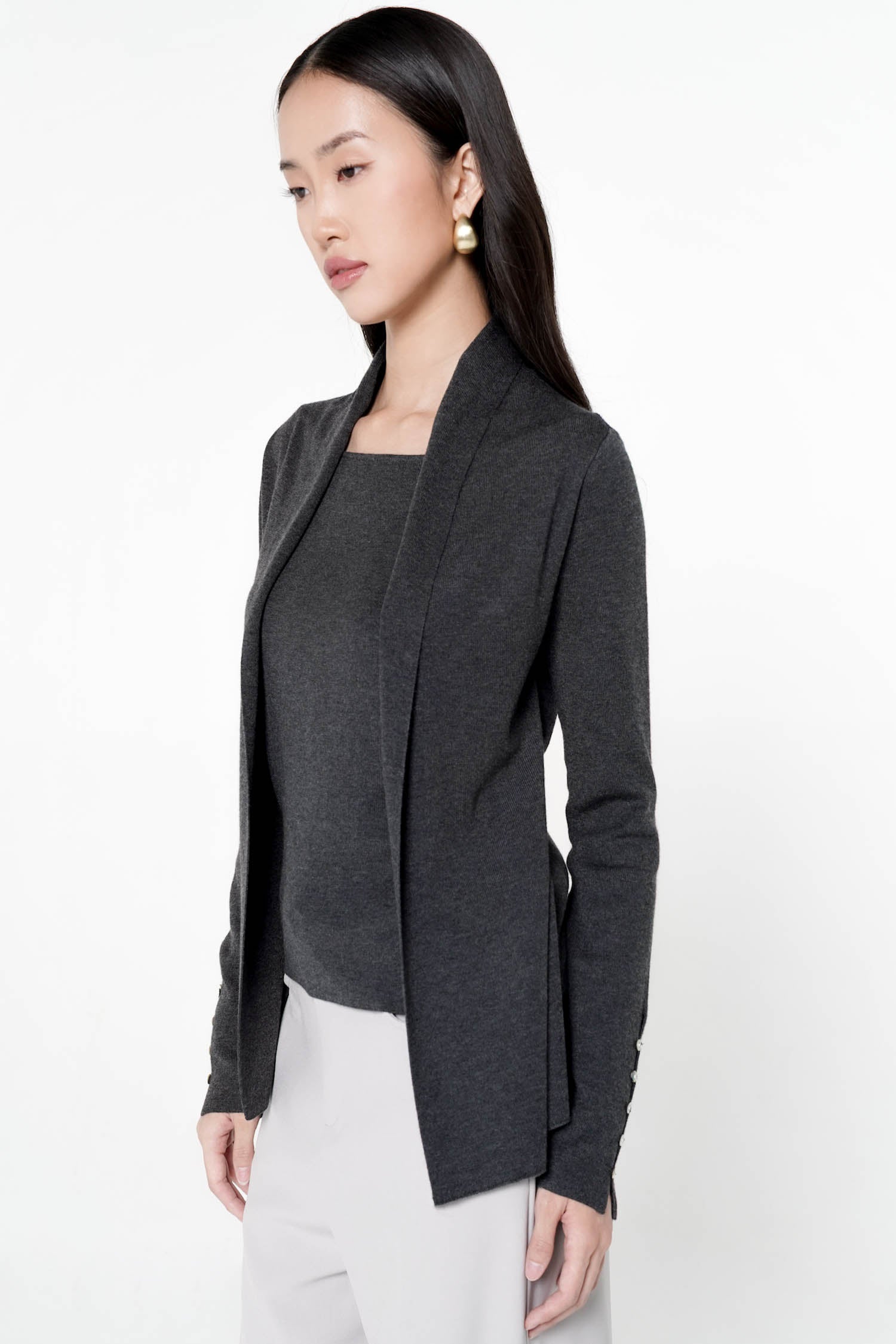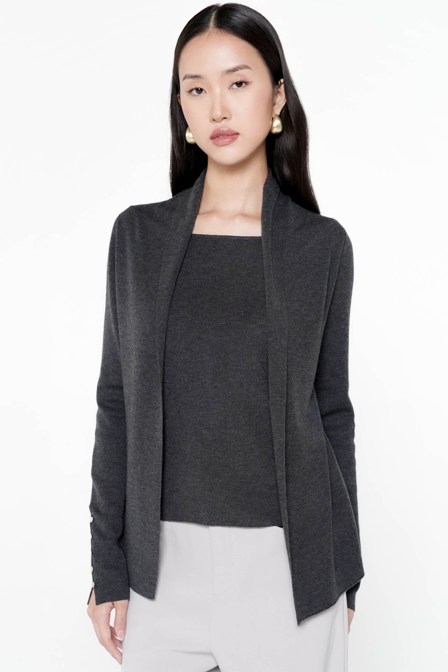 The Cyrilla Knit Top is an elegant, all-in-one layering piece thoughtfully crafted from soft knit, featuring a seamlessly integrated inner that offers effortless sophistication without the need for additional styling. Designed with a clean open-front silhouette and refined lapel shaping, it drapes gracefully over the body, while delicate sleeve buttons lend a subtle touch of ornamentation. Its smooth, comfortable finish makes it an ideal choice for both polished daytime looks and understated evening ensembles. Available in the timeless shades of Wine and Taupe, the Cyrilla Knit Top embodies modern refinement with quiet, enduring charm.