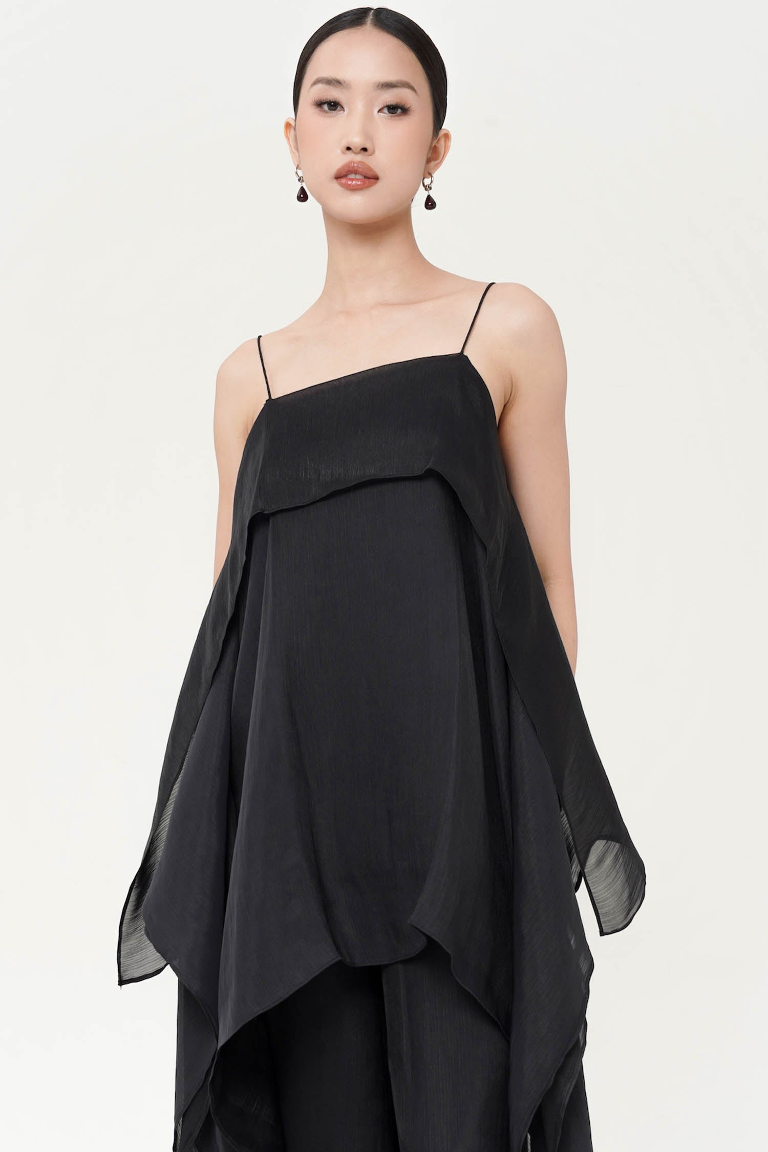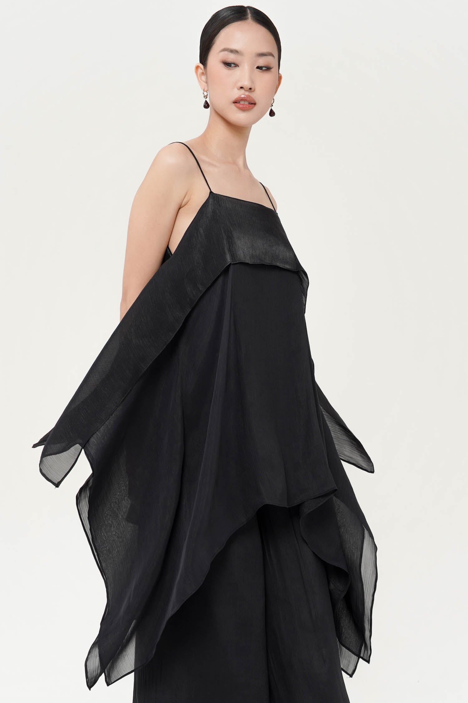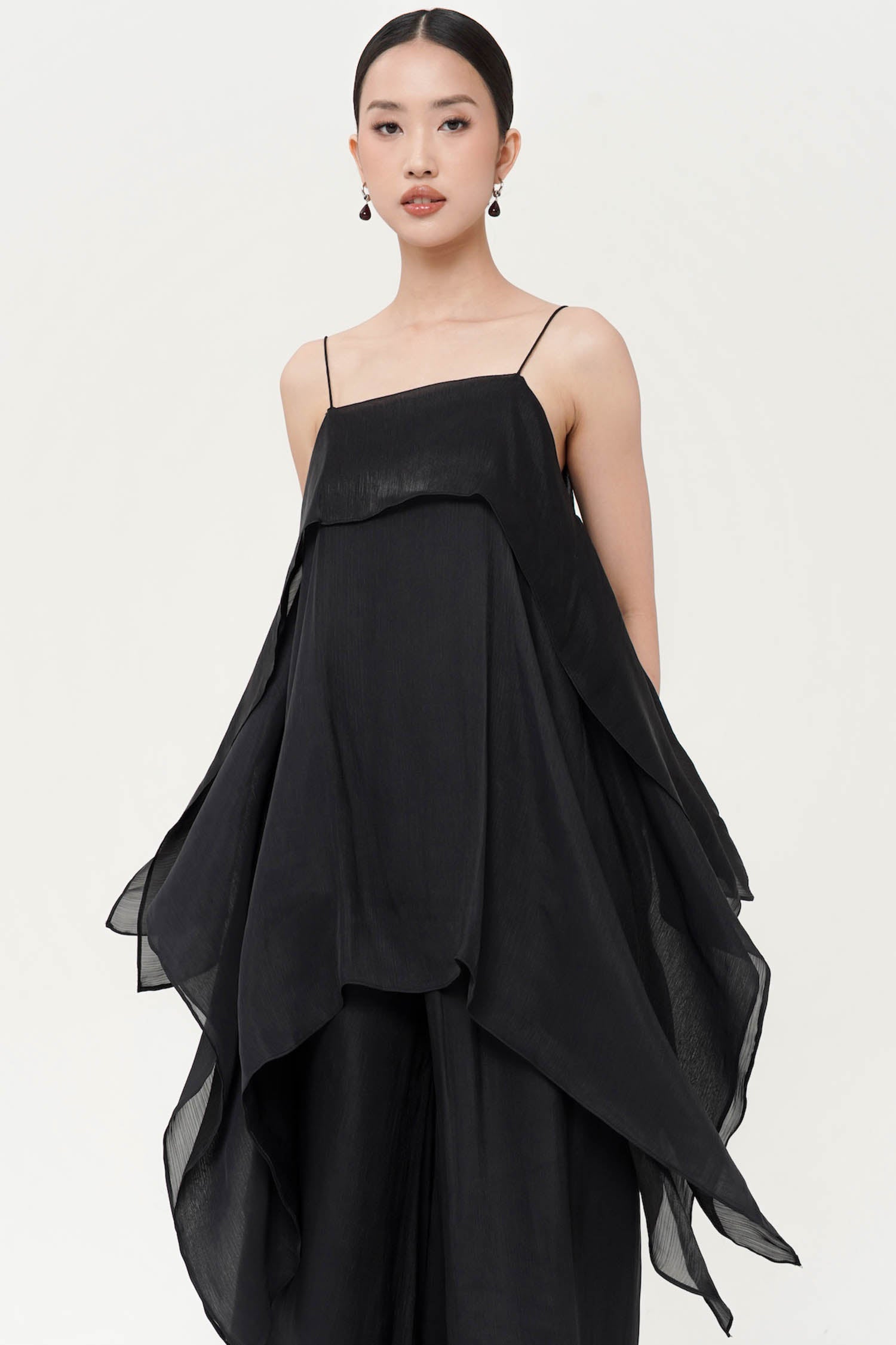 The Estella Handkerchief Top is a fluid statement of modern elegance, crafted from silk shimmer polyester that captures the light with effortless grace. Its flowing handkerchief hem and draped silhouette create a sense of movement, while the delicate spaghetti straps balance the design with a touch of refined minimalism. Ethereal yet contemporary, this piece embodies versatility—equally striking when paired with tailored trousers for a polished ensemble or layered over wide-leg pants for a more relaxed sophistication. Available in timeless Black and romantic Pink, the Estella Handkerchief Top is an elevated essential for those who favor understated glamour.