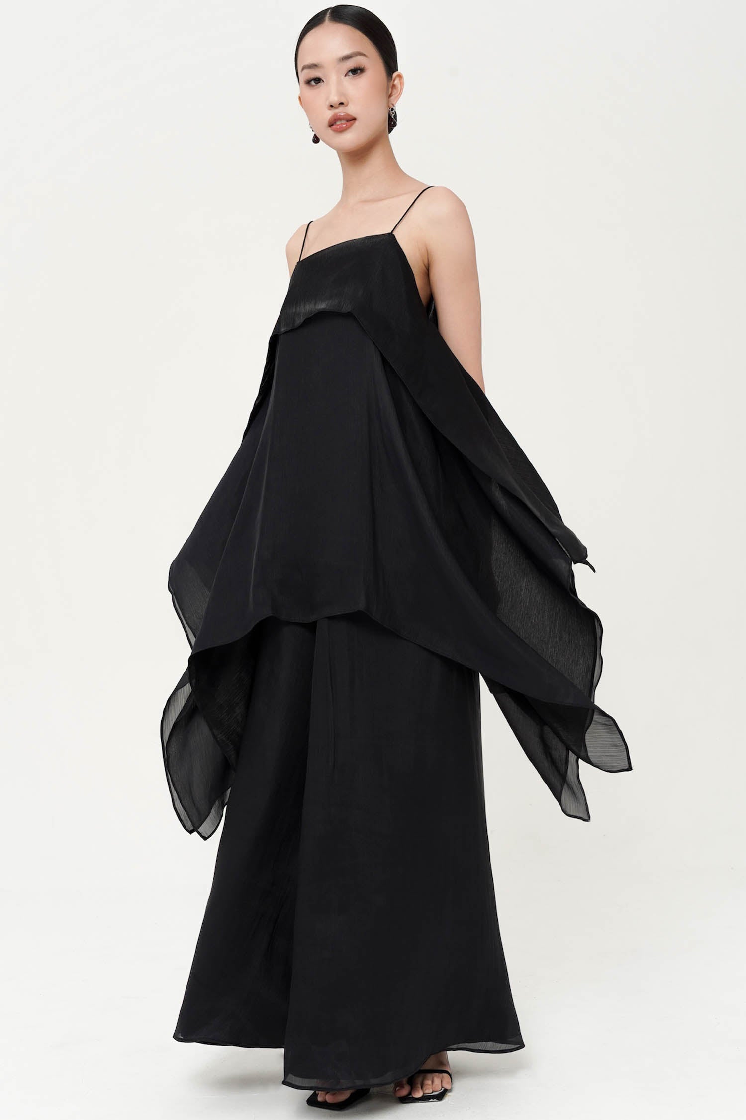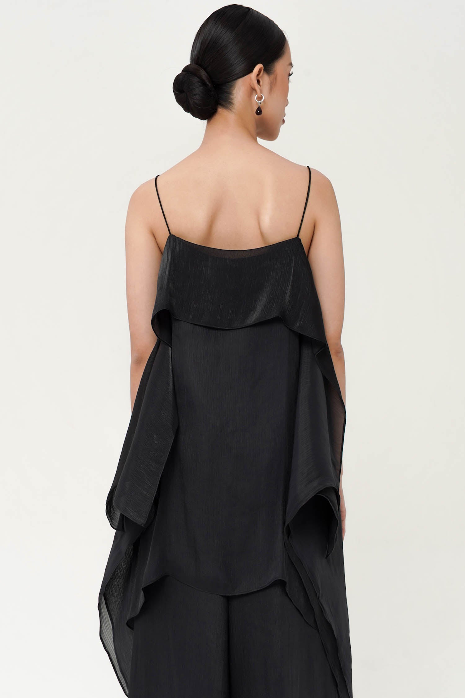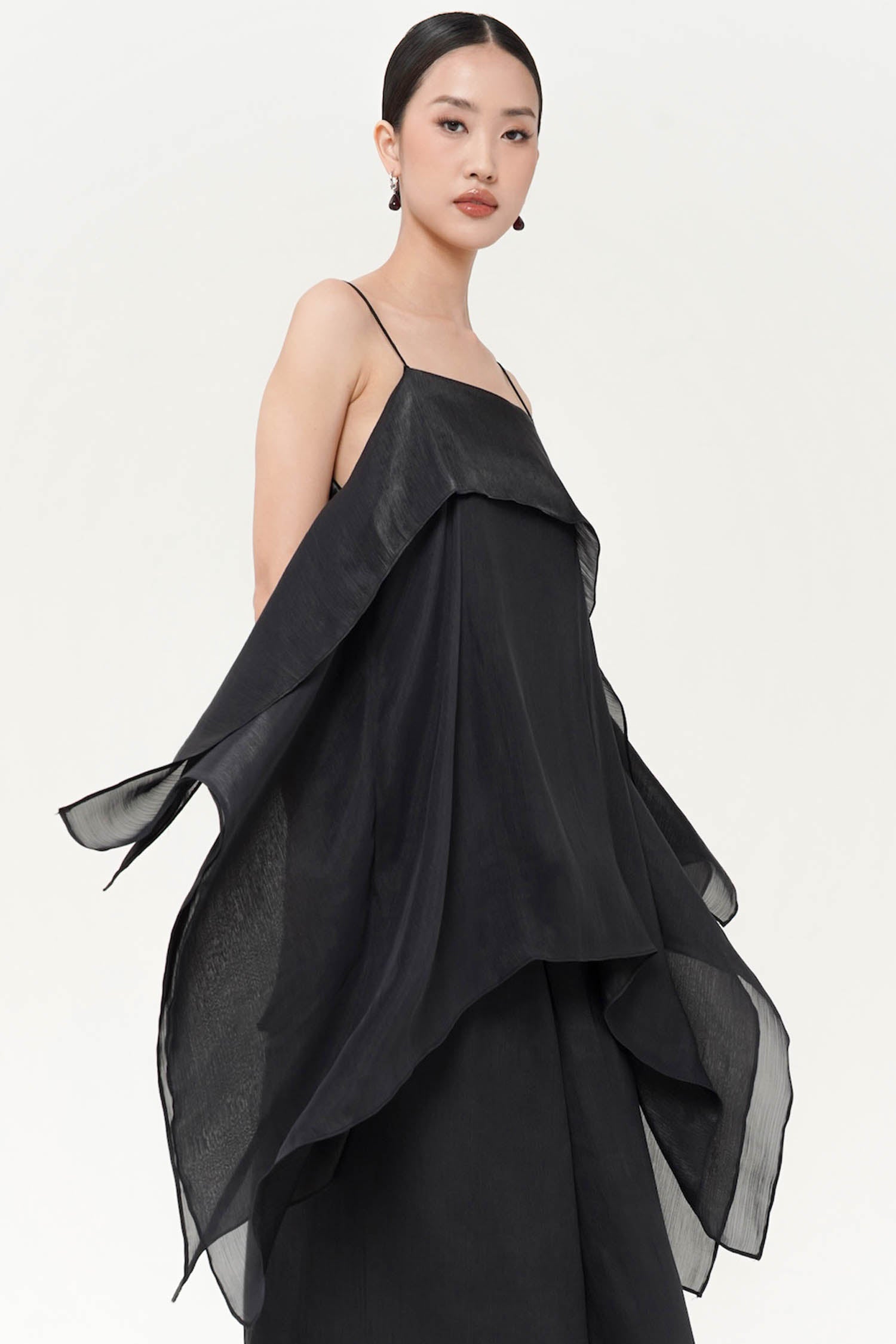 The Estella Handkerchief Top is a fluid statement of modern elegance, crafted from silk shimmer polyester that captures the light with effortless grace. Its flowing handkerchief hem and draped silhouette create a sense of movement, while the delicate spaghetti straps balance the design with a touch of refined minimalism. Ethereal yet contemporary, this piece embodies versatility—equally striking when paired with tailored trousers for a polished ensemble or layered over wide-leg pants for a more relaxed sophistication. Available in timeless Black and romantic Pink, the Estella Handkerchief Top is an elevated essential for those who favor understated glamour.