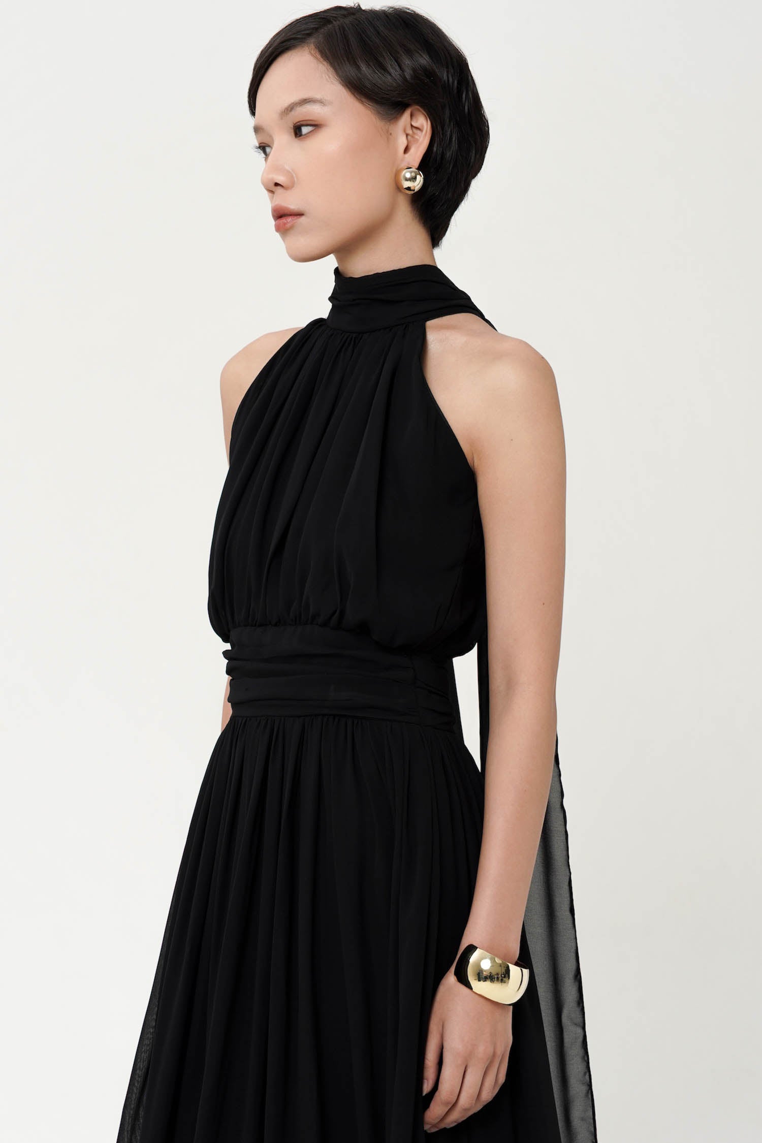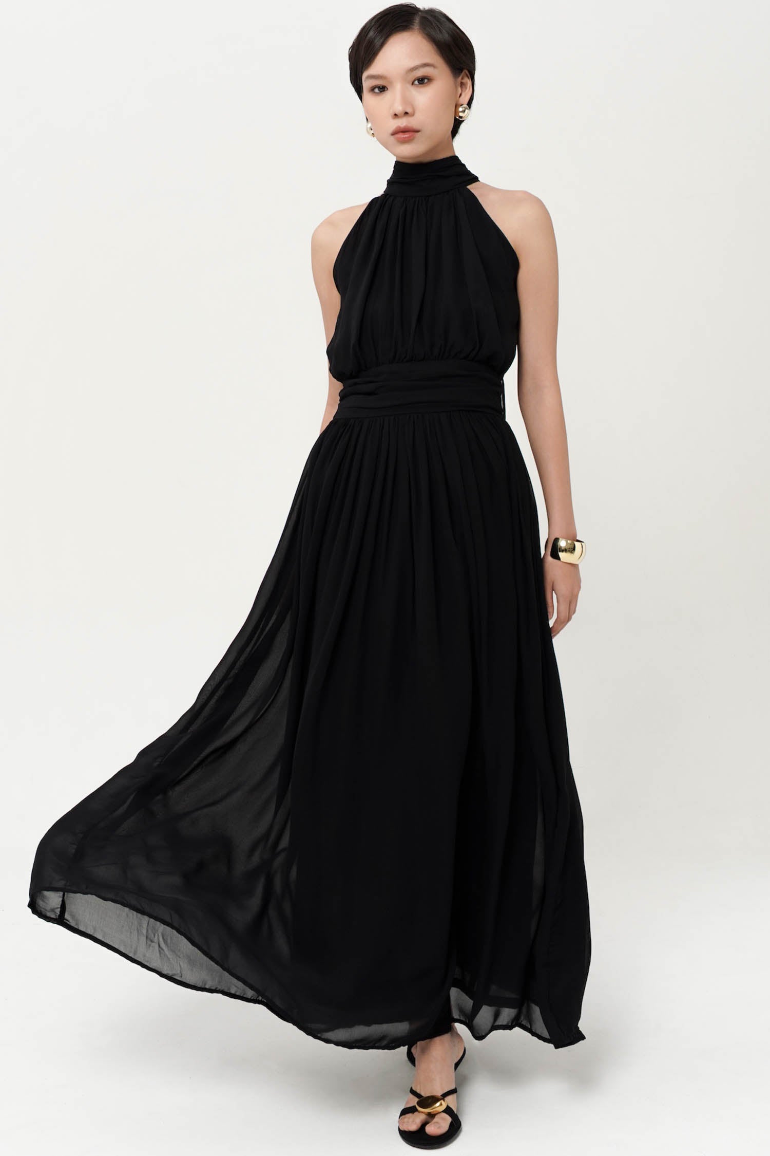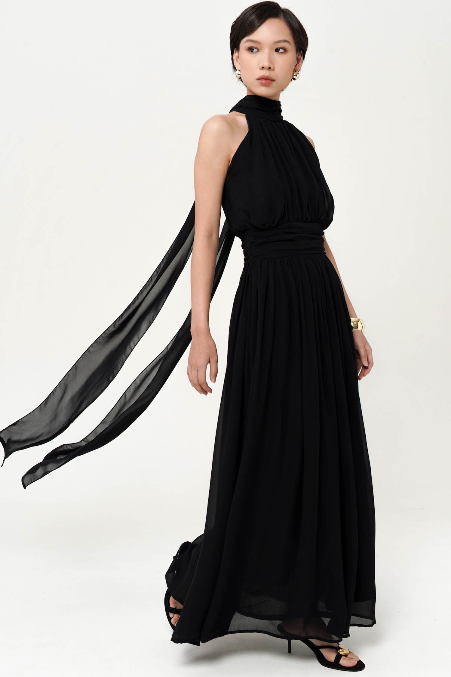 This dress is a floor-length black gown with a graceful and dramatic design. It features a high halter neckline with gathered detailing that creates soft draping across the bodice. The waist is cinched with a wide, ruched waistband, enhancing the silhouette, while the skirt flows into a voluminous, airy shape with elegant movement. At the back, long trailing ties extend from the neckline, adding a sophisticated, flowing accent. The lightweight fabric and fluid cut give the dress a timeless, refined evening look.