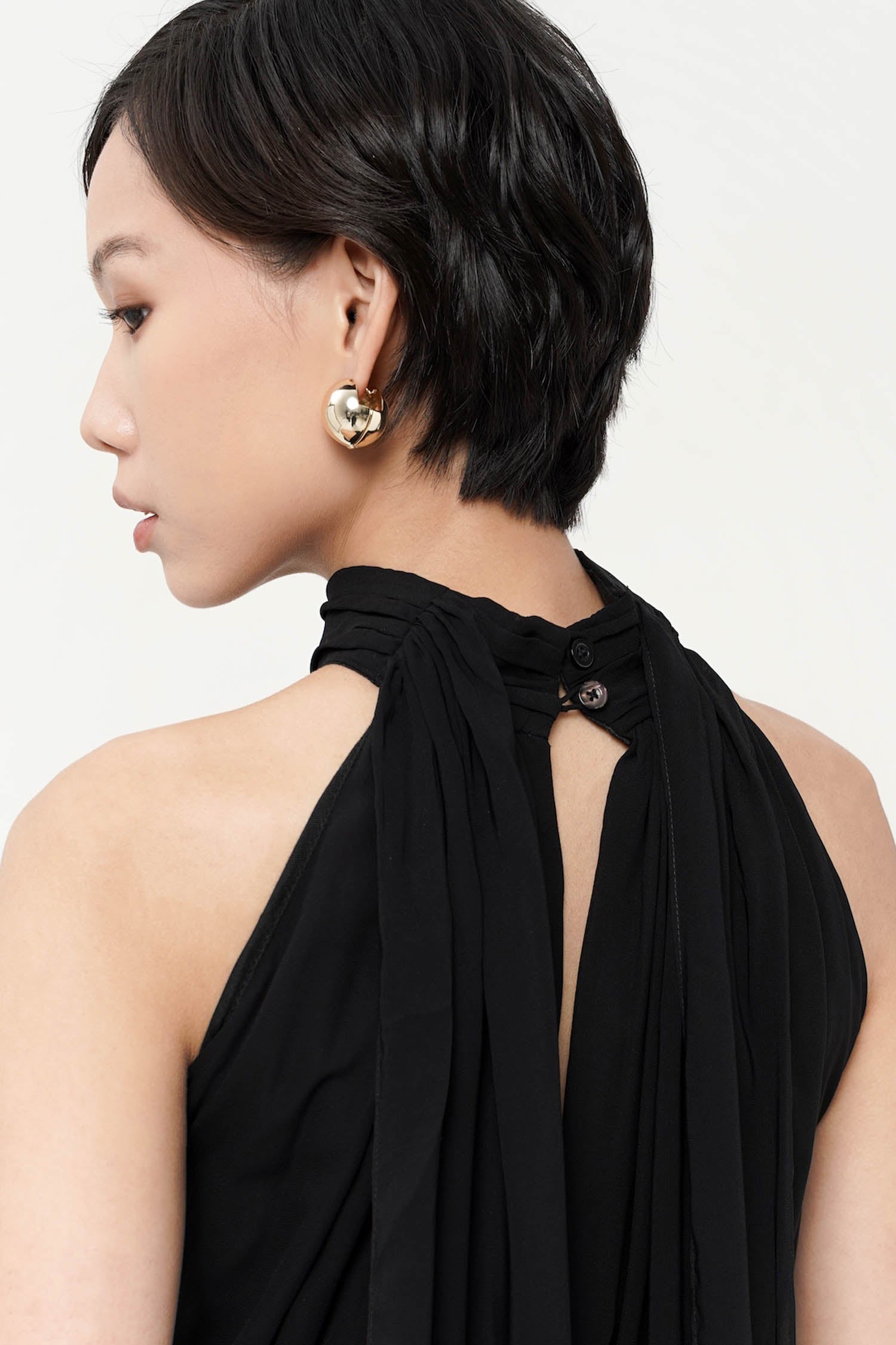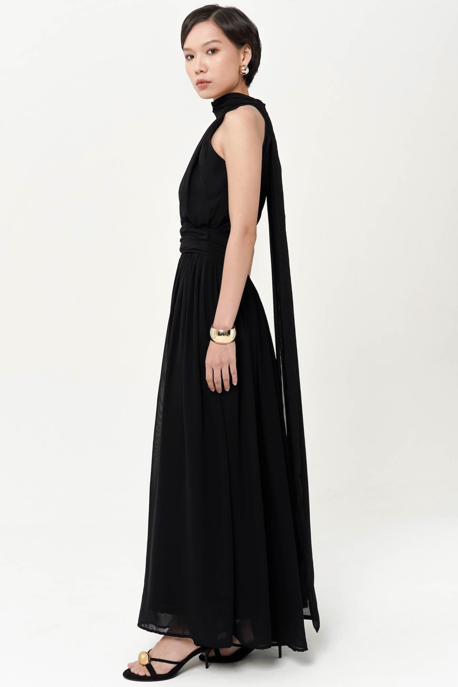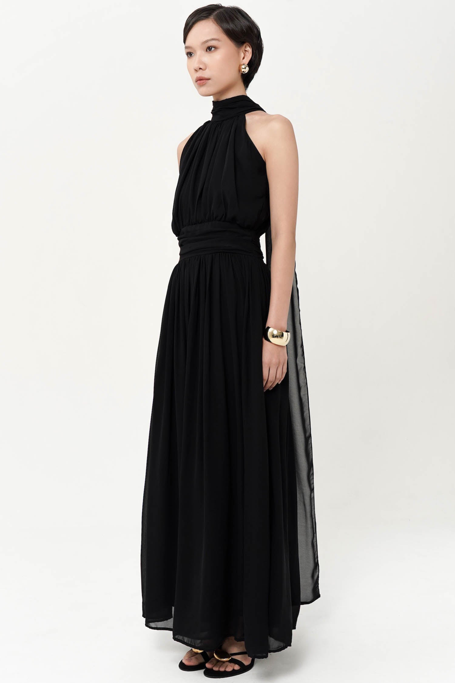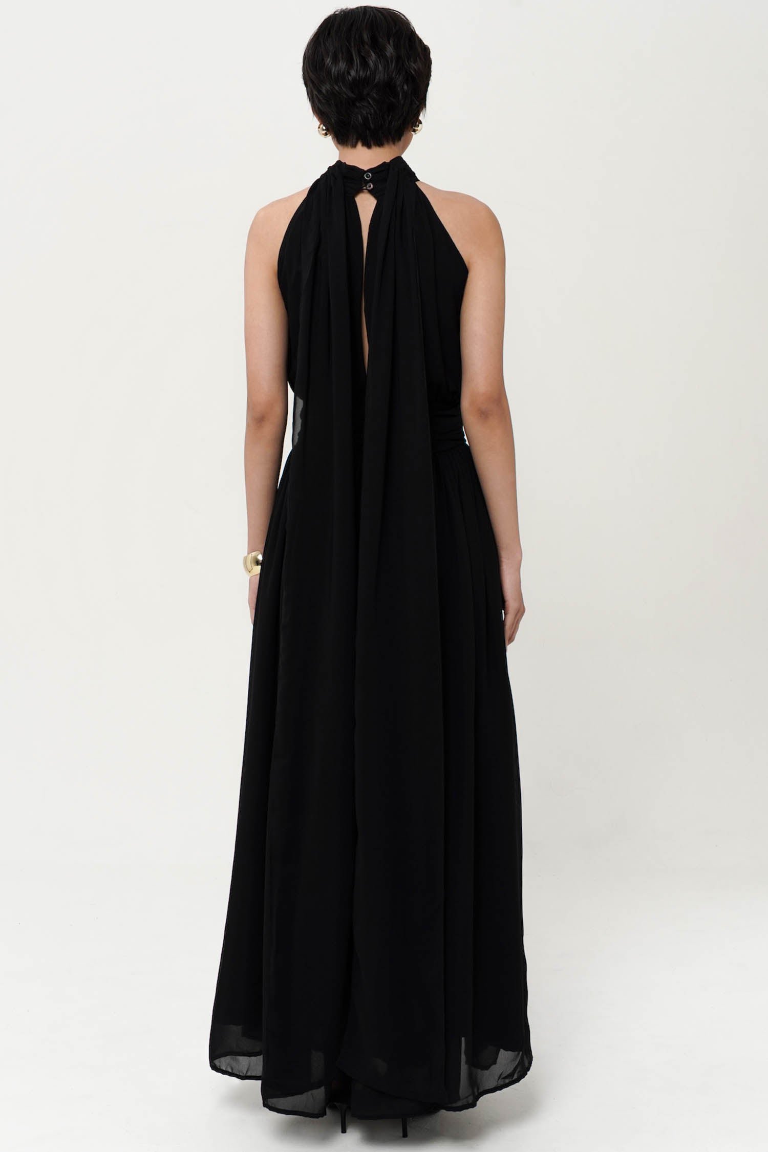 This dress is a floor-length black gown with a graceful and dramatic design. It features a high halter neckline with gathered detailing that creates soft draping across the bodice. The waist is cinched with a wide, ruched waistband, enhancing the silhouette, while the skirt flows into a voluminous, airy shape with elegant movement. At the back, long trailing ties extend from the neckline, adding a sophisticated, flowing accent. The lightweight fabric and fluid cut give the dress a timeless, refined evening look.