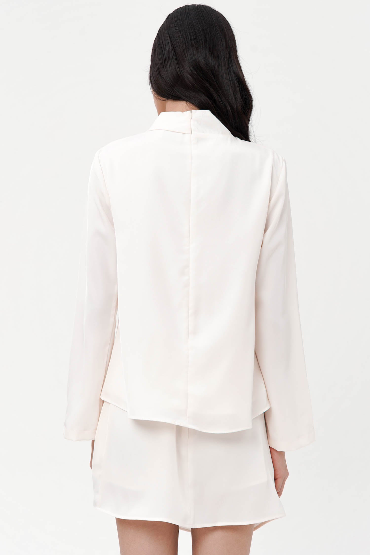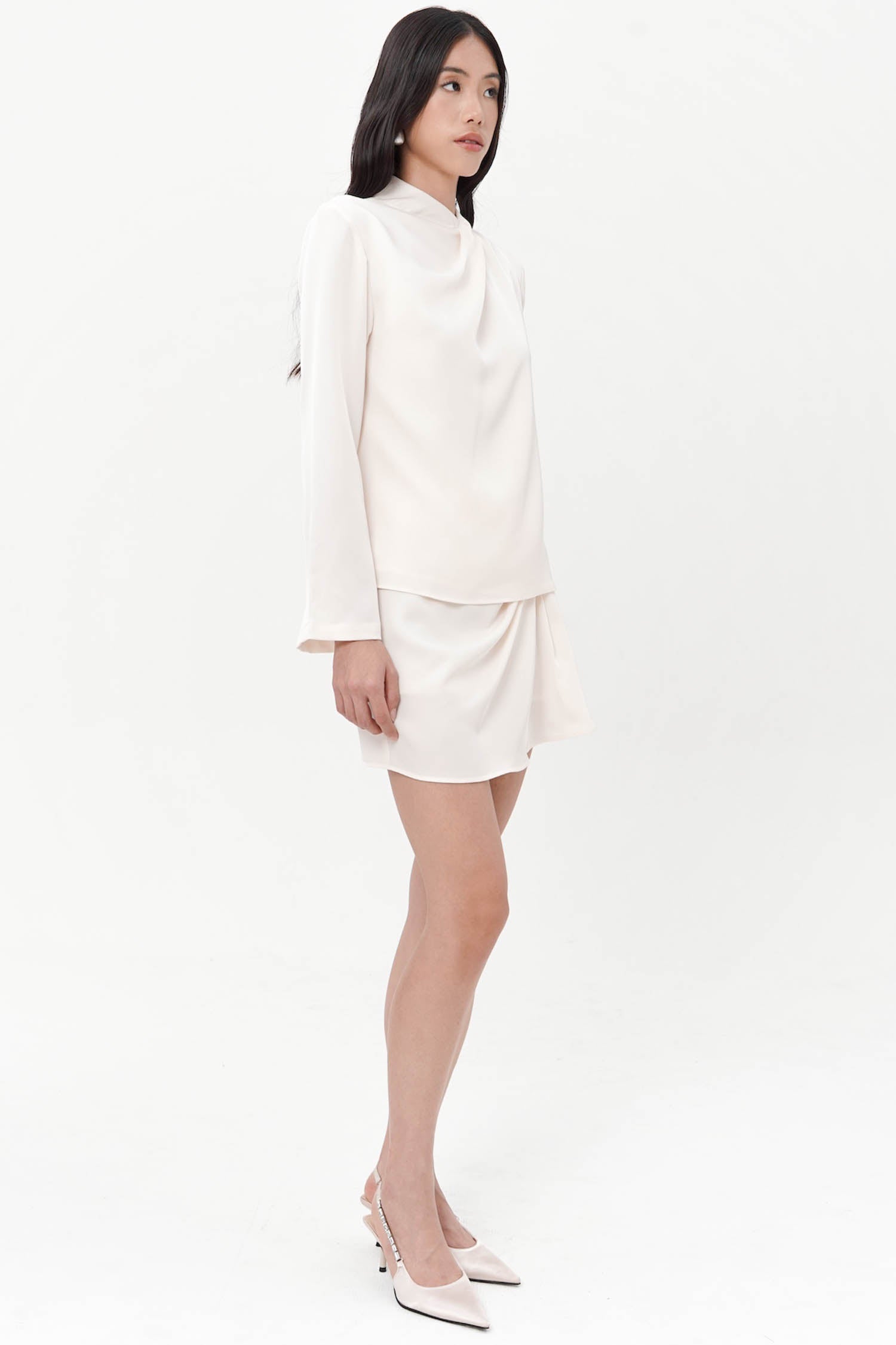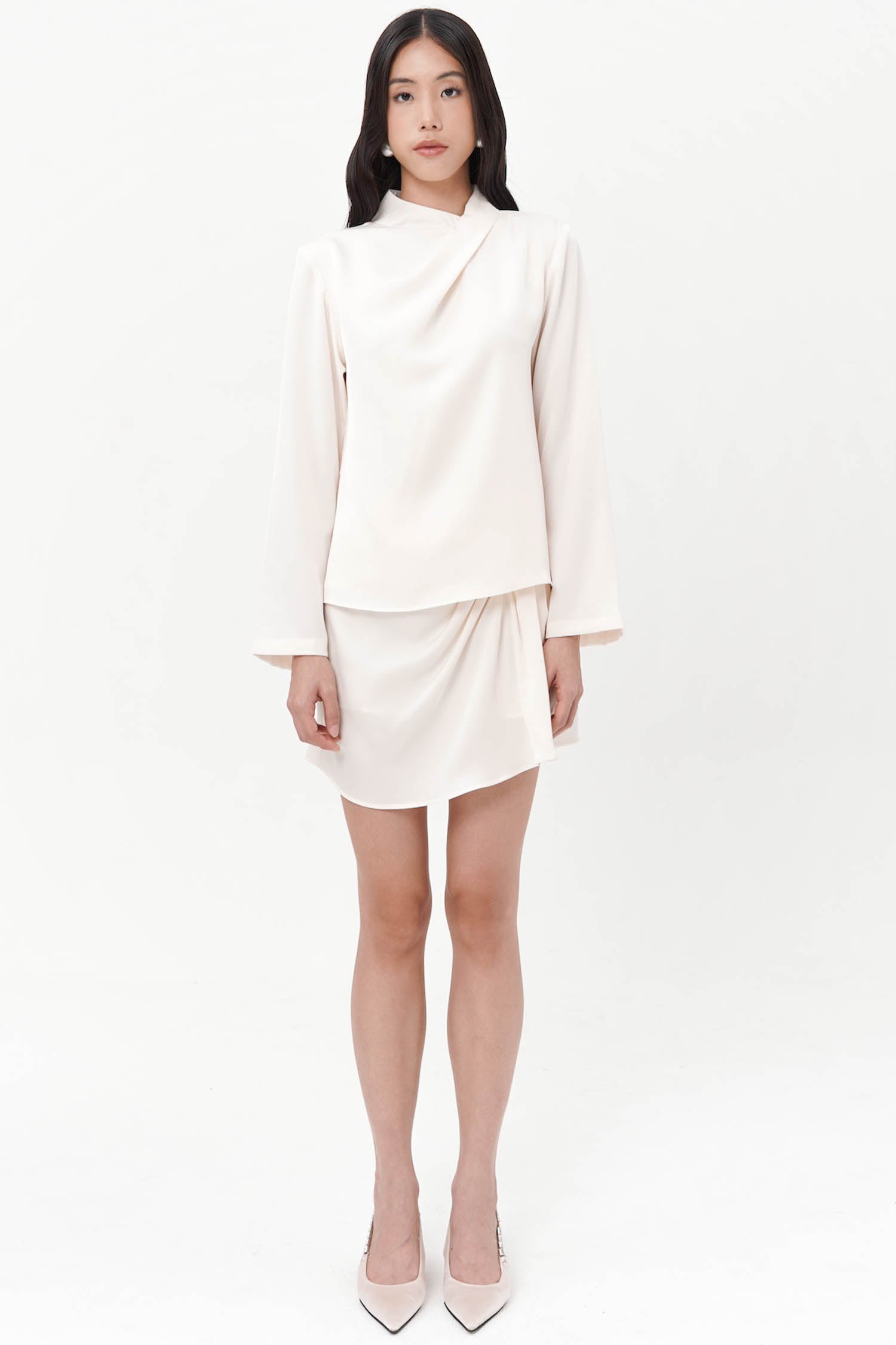 The Gilford Drape Long Sleeve Top captures the essence of refined elegance through its minimalist silhouette and artful draping. Crafted from luxurious twill, this piece exudes a soft luster and fluid movement that enhances its sophisticated form. The asymmetrical fold at the neckline adds a sculptural touch, while the long sleeves and clean lines evoke an air of quiet confidence. Designed to transition effortlessly from day to evening, the Gilford Top embodies timeless sophistication with a contemporary edge. Available in Porcelain and Espresso, it is a study in understated grace and modern femininity.