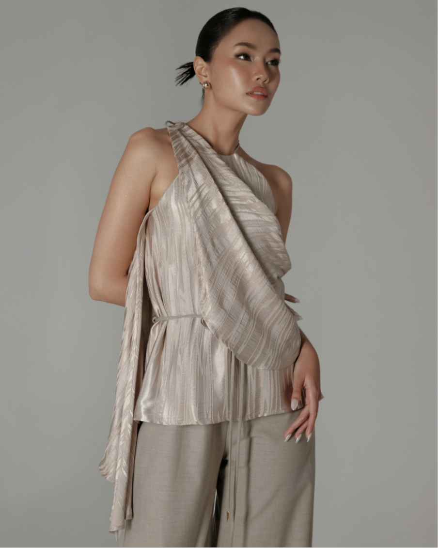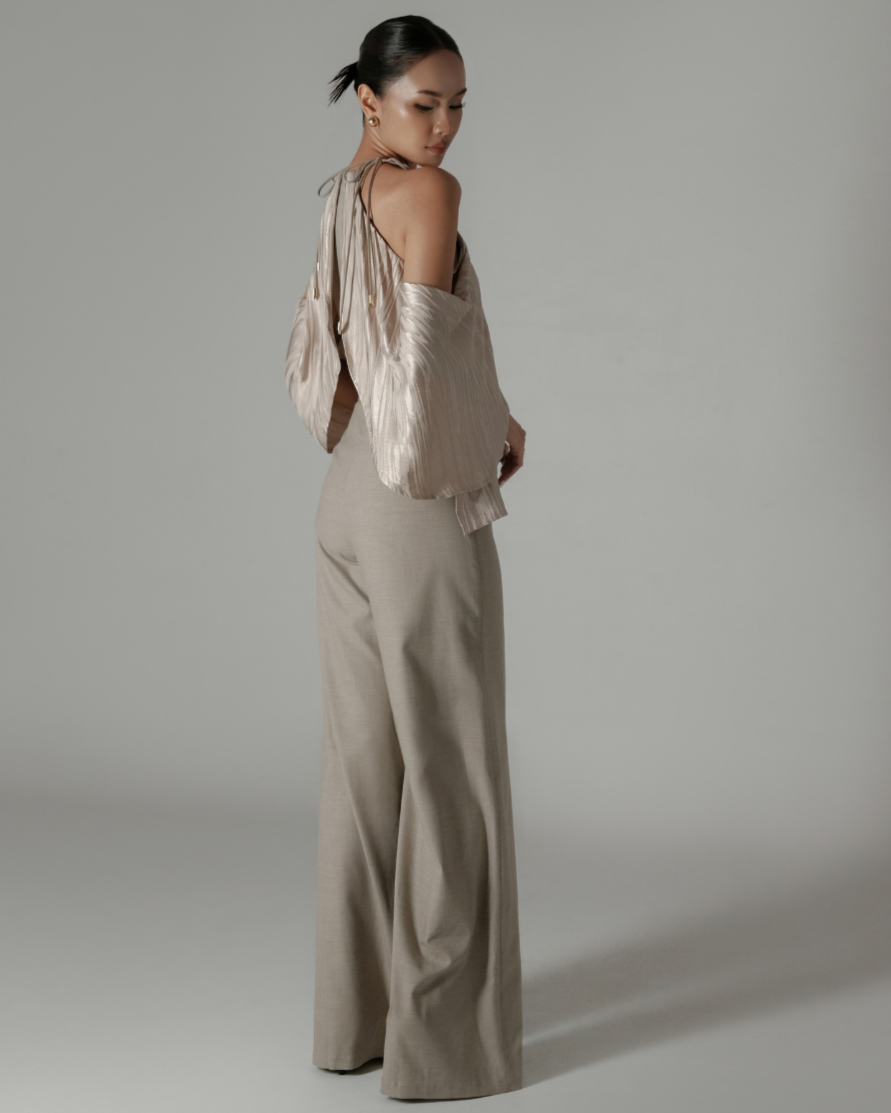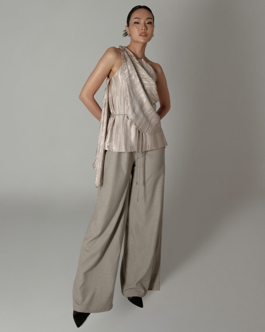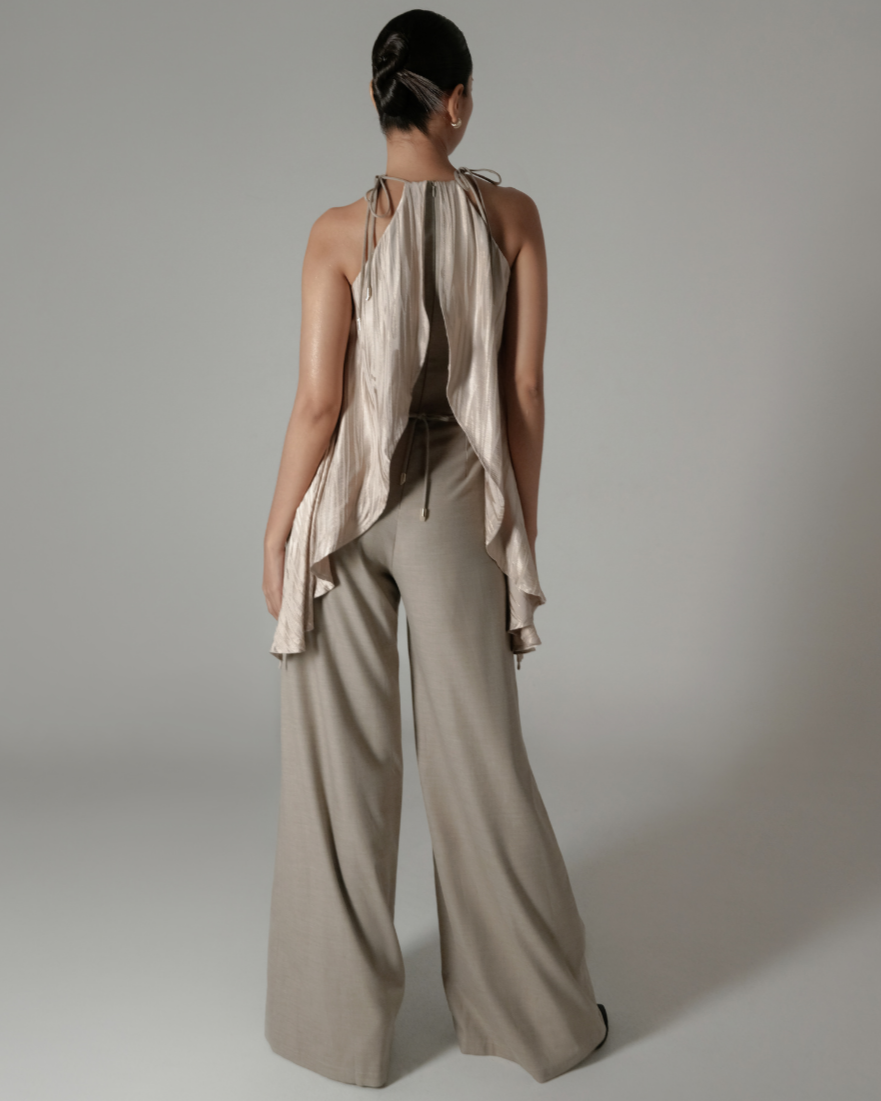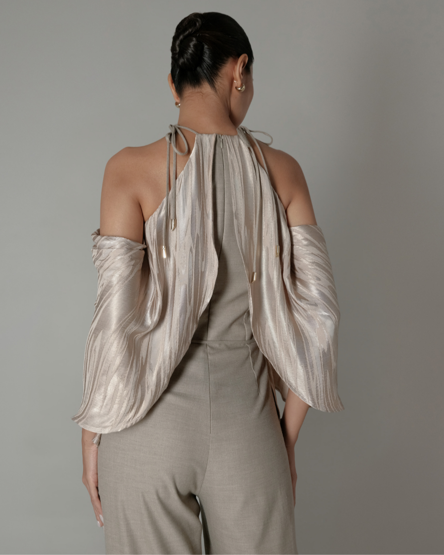 Multistyling halter-neck jumpsuit cut for a loose fit. It's made from satin and semi wool fabric with a draped layers at the back that can be transformed into semi-open sleeves. It also comes with ties to cinch the waist