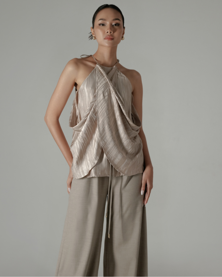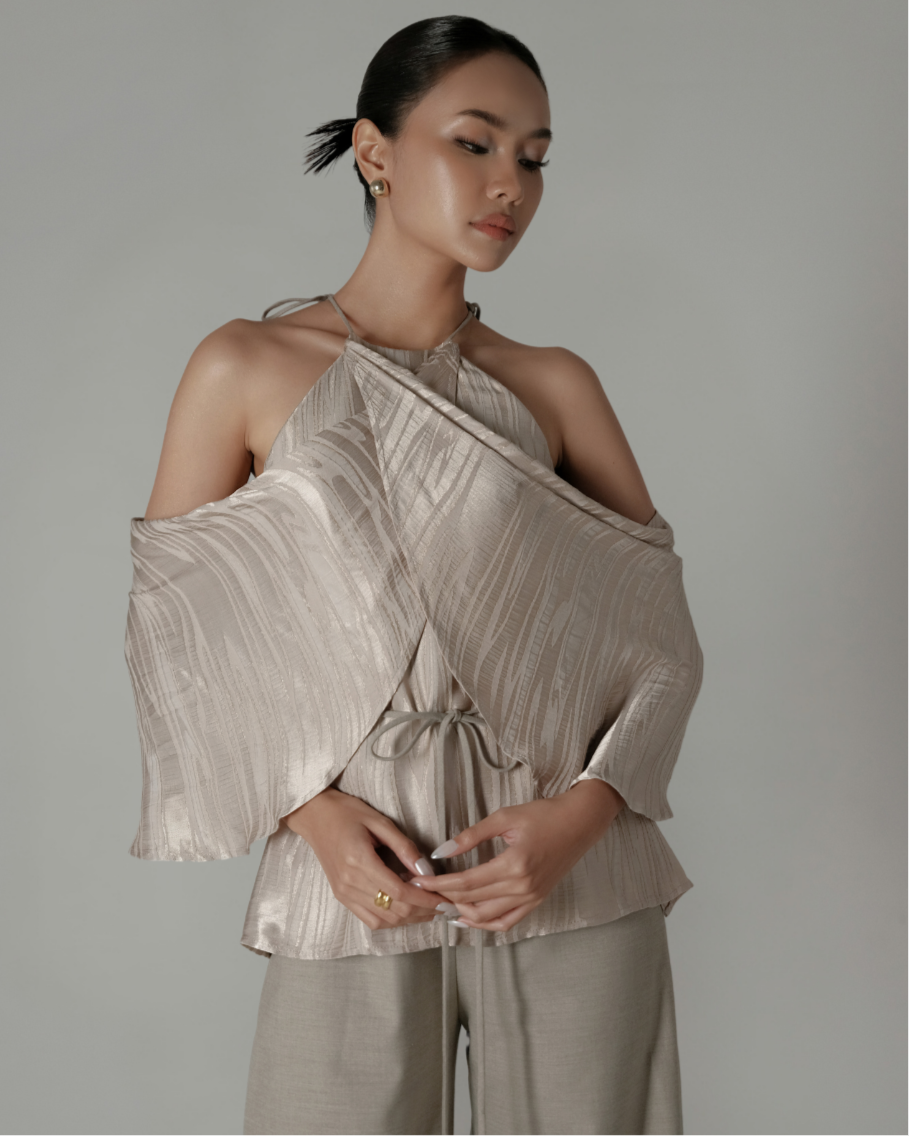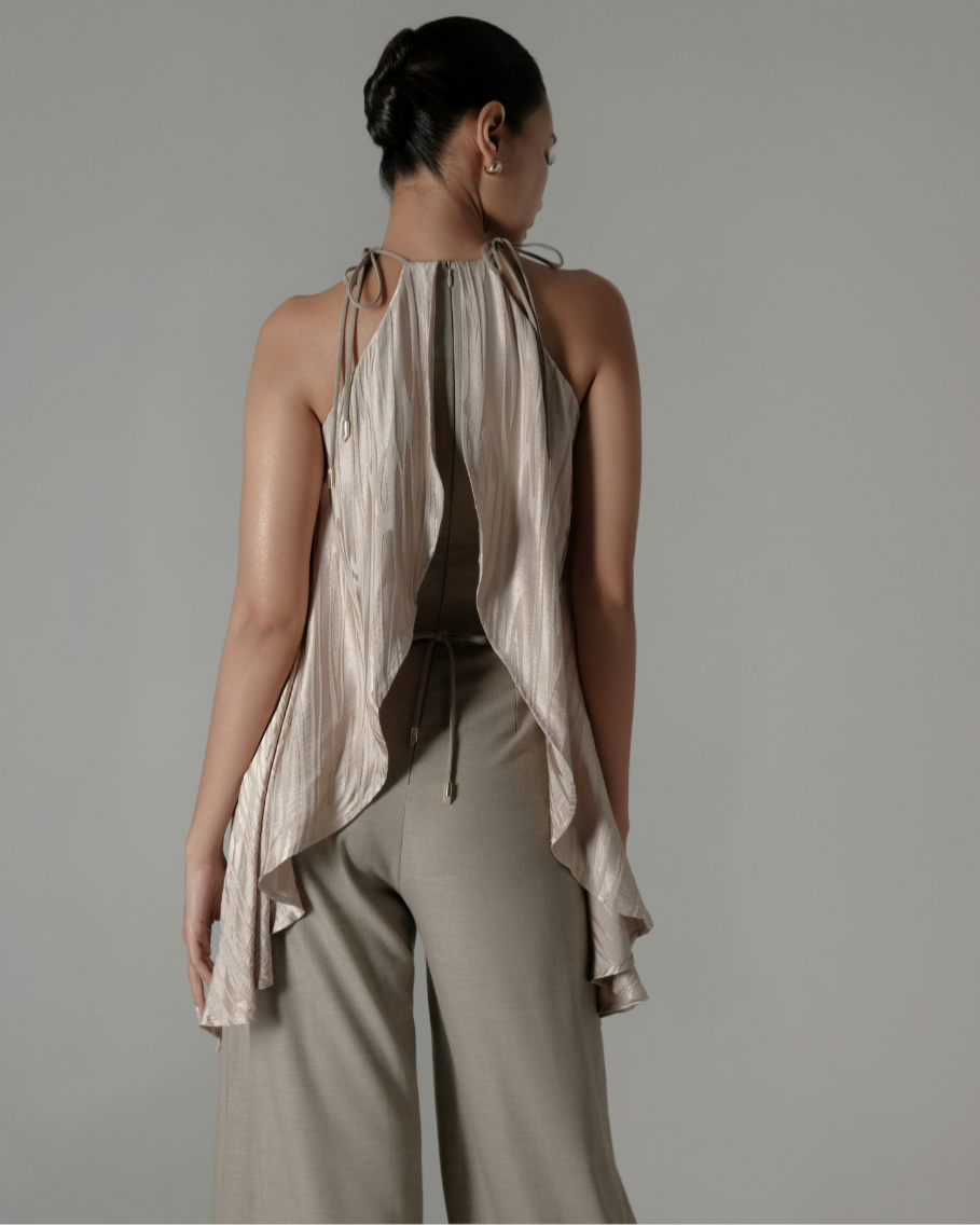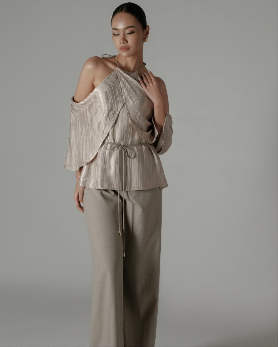 Multistyling halter-neck jumpsuit cut for a loose fit. It's made from satin and semi wool fabric with a draped layers at the back that can be transformed into semi-open sleeves. It also comes with ties to cinch the waist