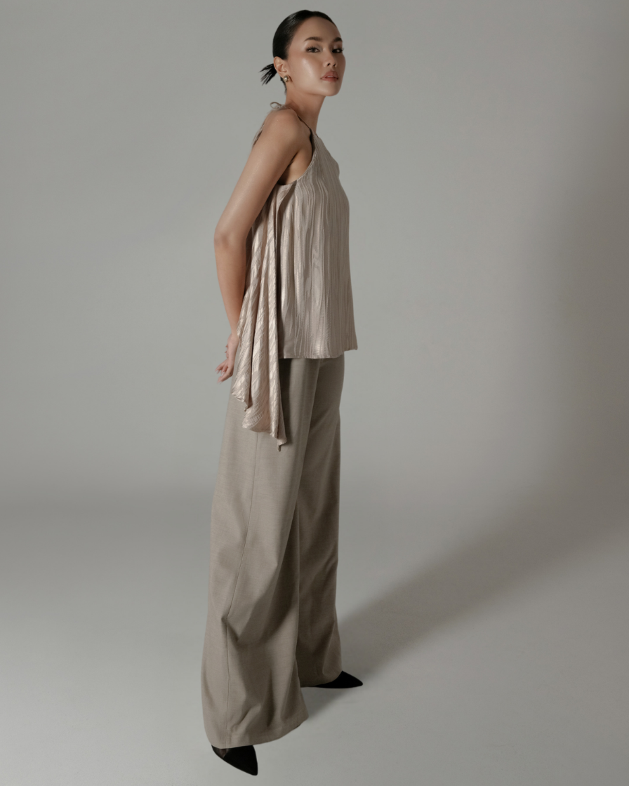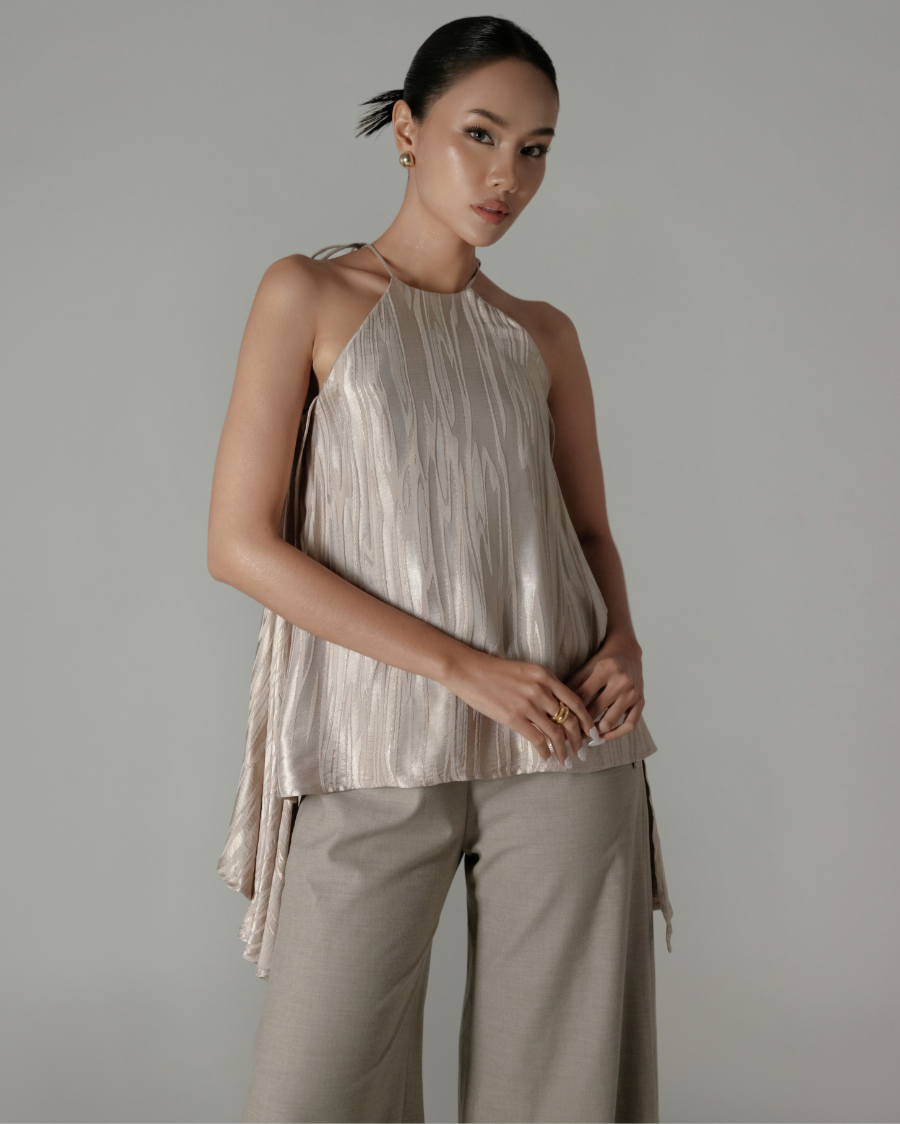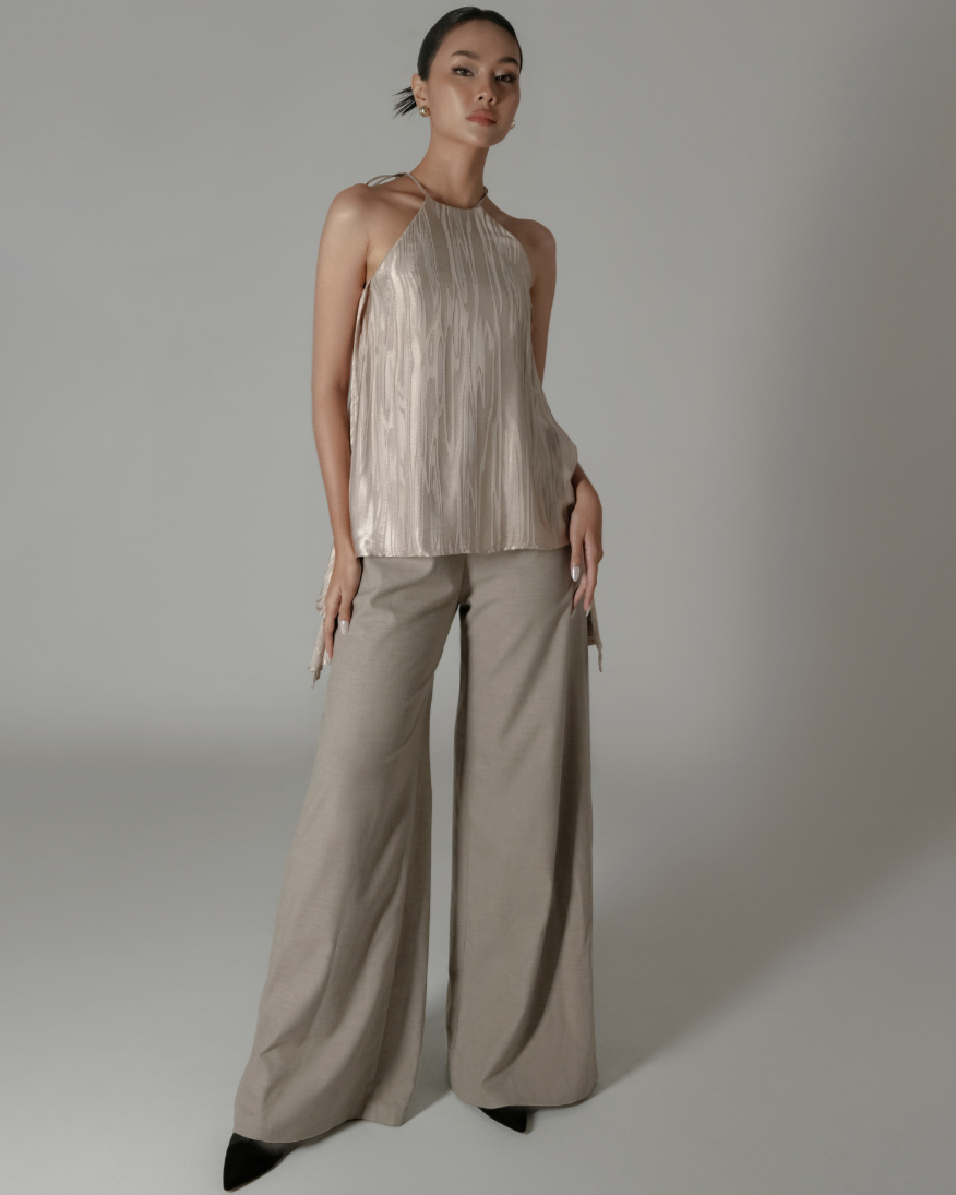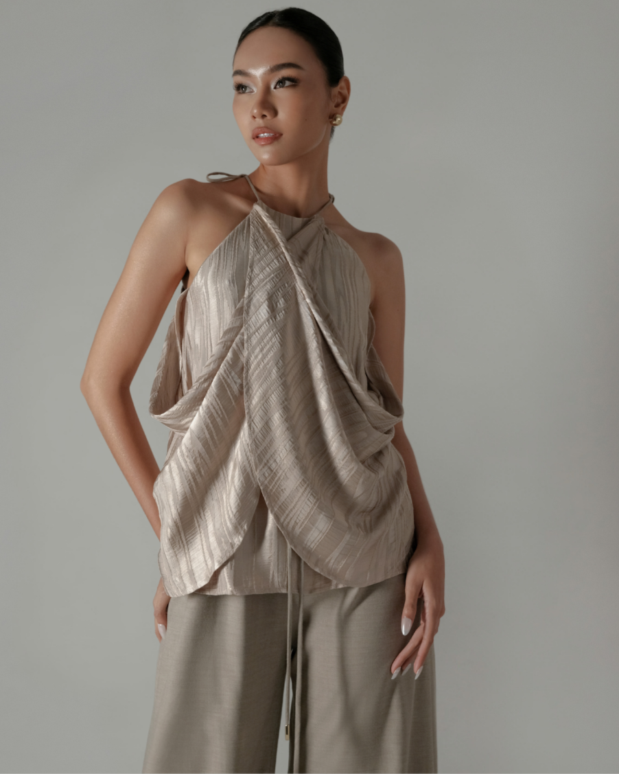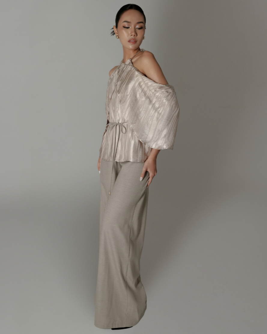 Multistyling halter-neck jumpsuit cut for a loose fit. It's made from satin and semi wool fabric with a draped layers at the back that can be transformed into semi-open sleeves. It also comes with ties to cinch the waist