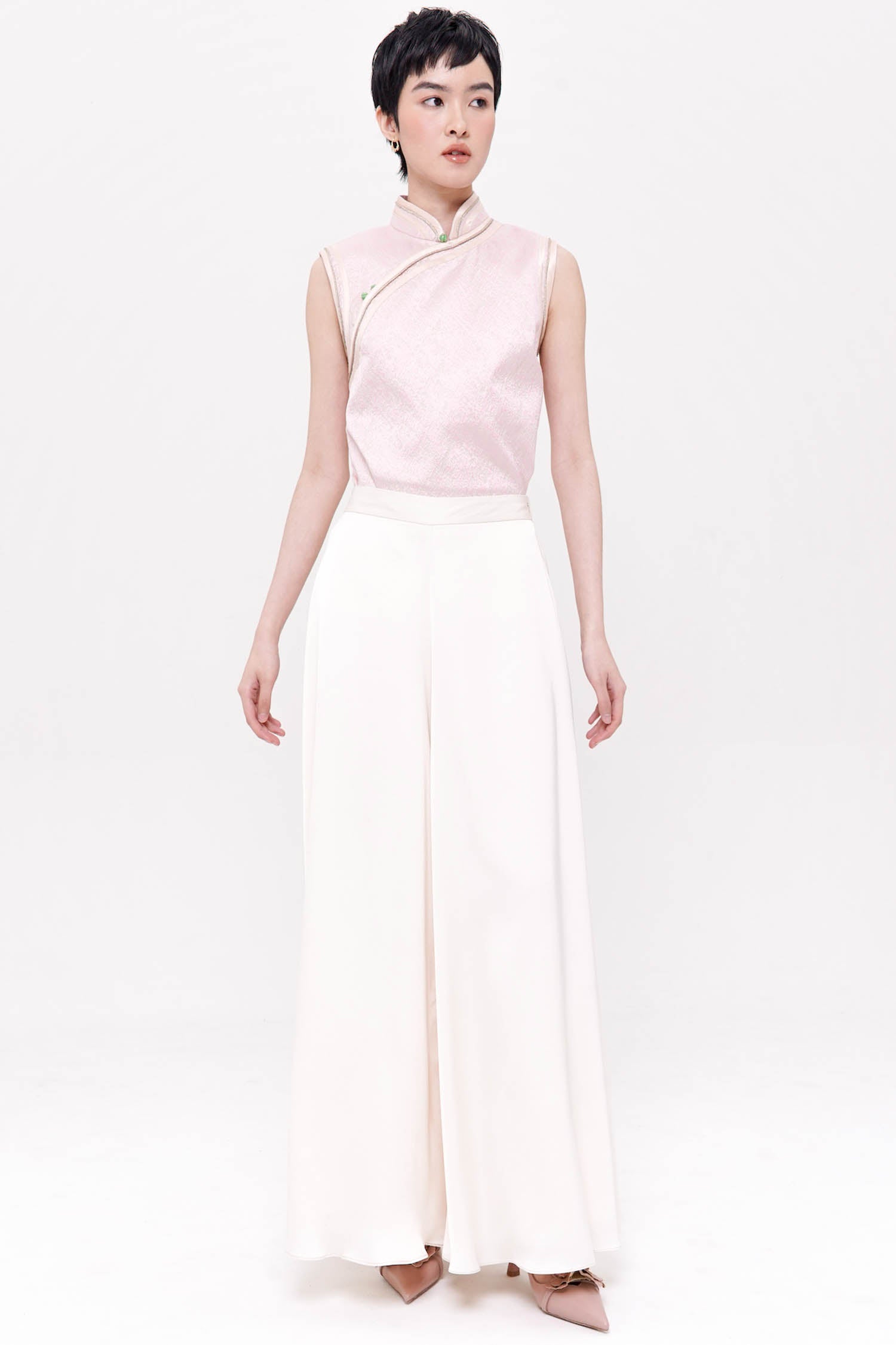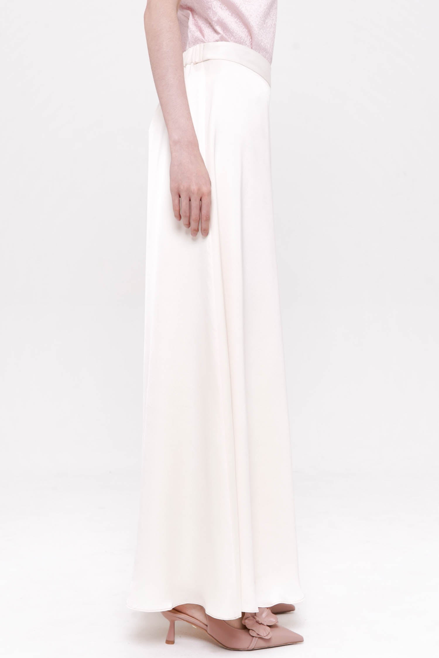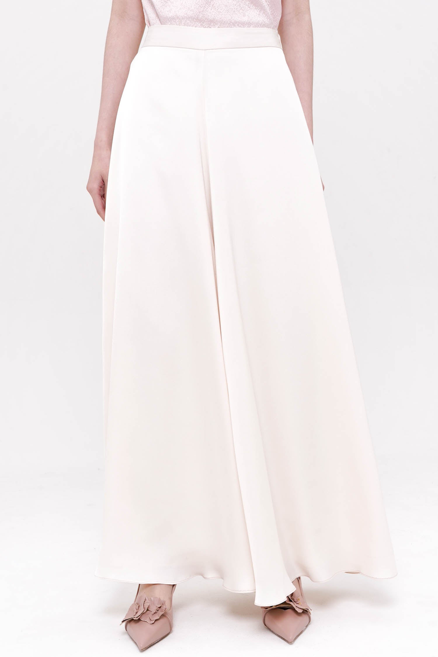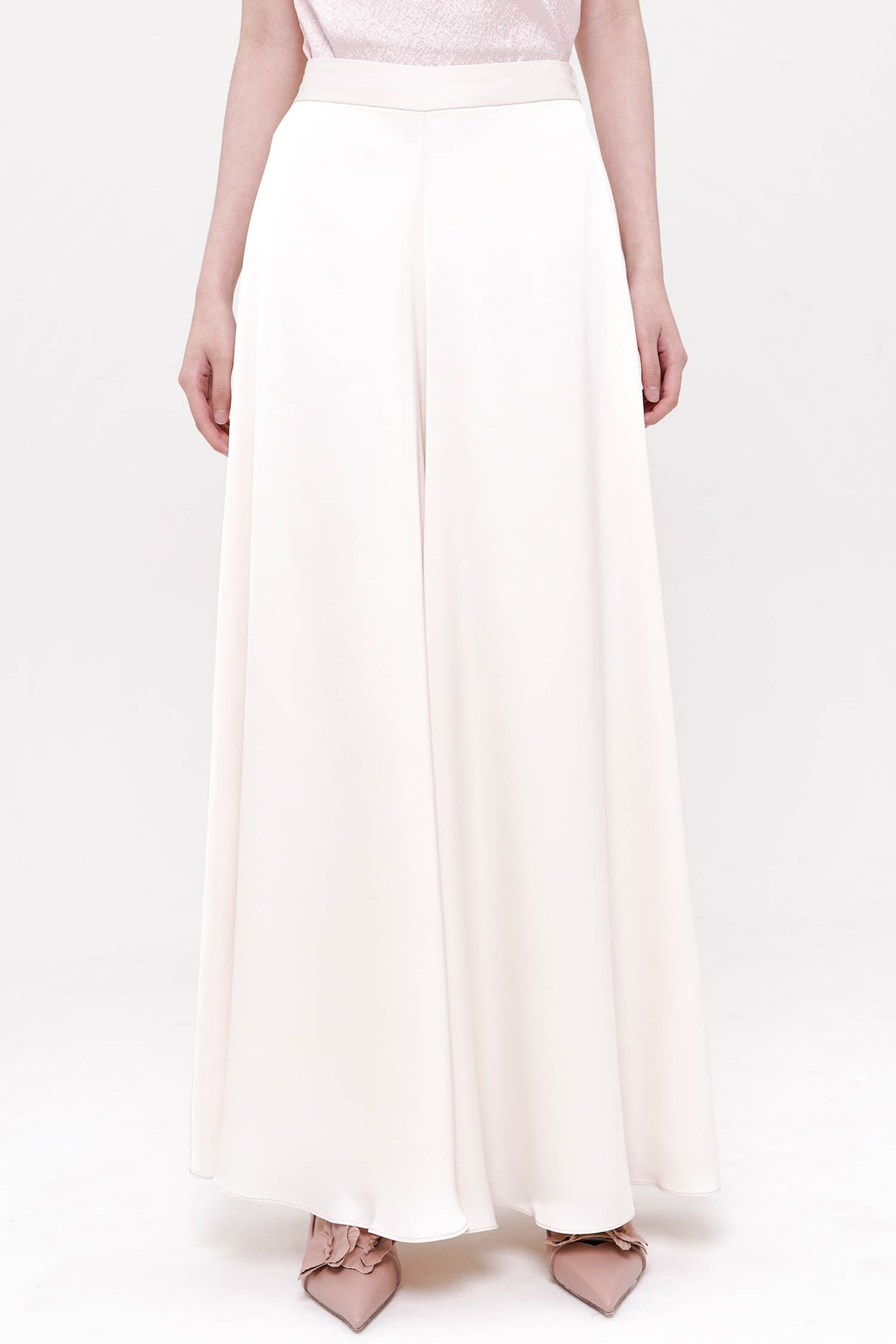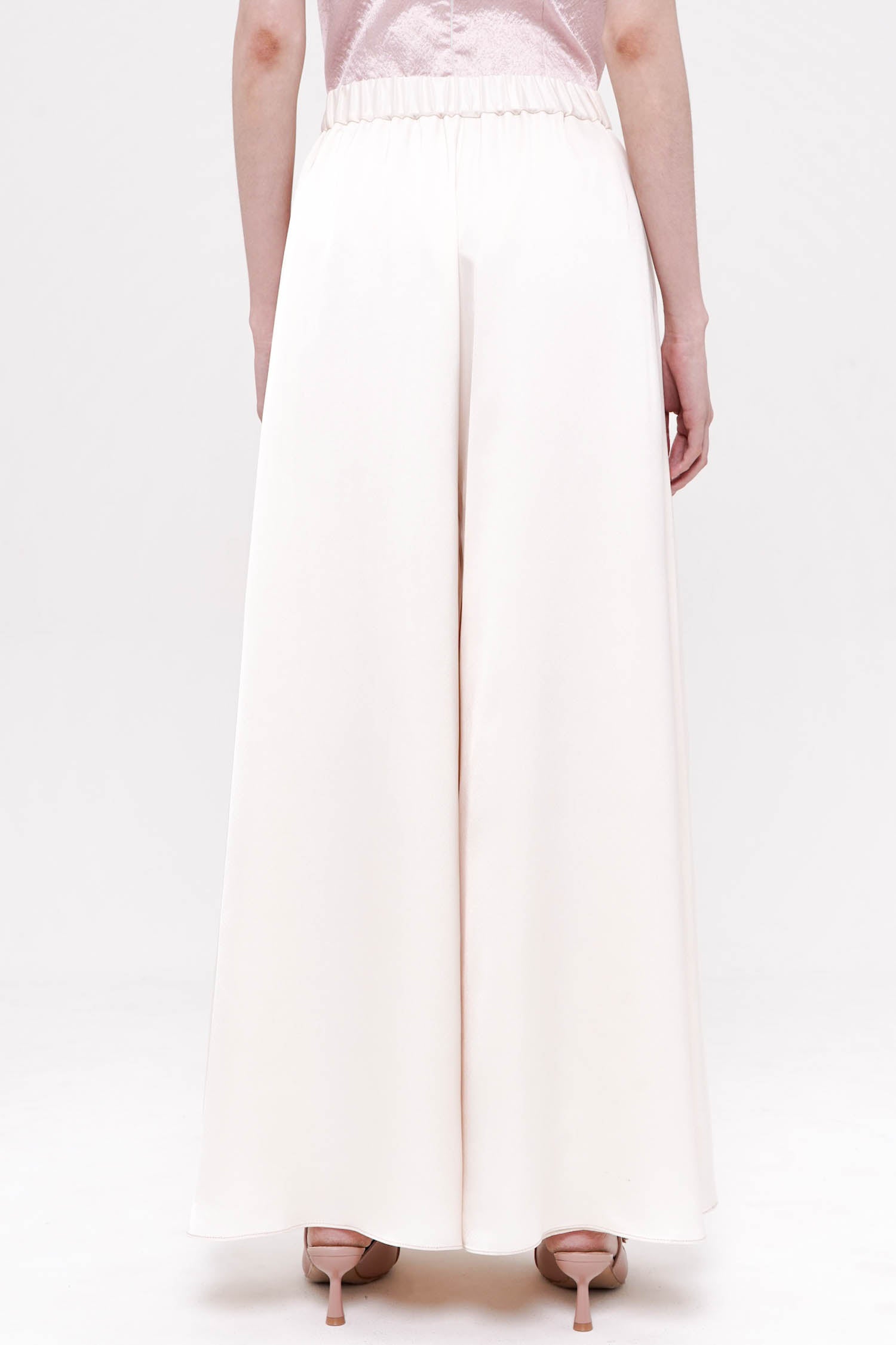 The Jade Trousers in Ivory are an elegant study in fluid minimalism, crafted from lustrous satin that drapes beautifully with every movement. Designed with a flattering high-rise waist and a softly flared wide-leg silhouette, they create a graceful, elongated line while remaining exceptionally lightweight and comfortable. The smooth front is complemented by an elasticized back for ease of wear, ensuring a refined yet effortless fit. Sophisticated, understated, and endlessly versatile, the Jade Trousers bring a serene sense of luxury to both day and evening dressing.