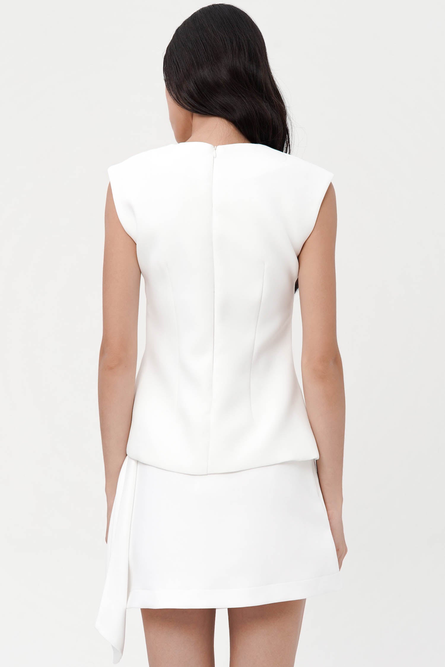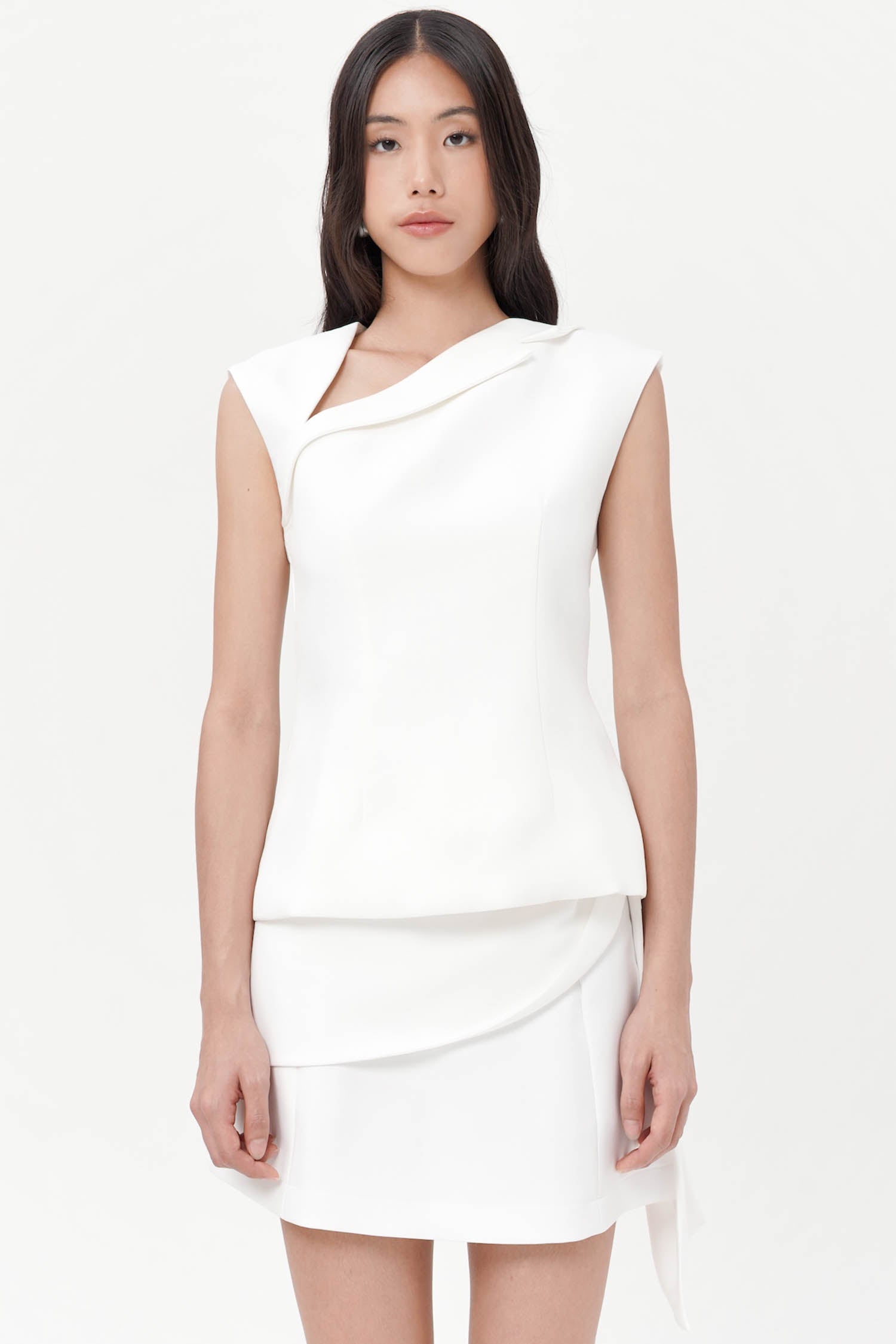 Exuding a quiet confidence, the Jaq Asymmetric Top redefines modern tailoring through its sculptural silhouette and refined minimalism. Crafted from premium semi wool, this sleeveless piece features a distinctive asymmetric neckline that frames the collarbone with subtle sophistication. Its structured form is balanced by fluid lines, creating an elegant drape that flatters the figure from every angle. A concealed back closure ensures a seamless finish, making it a timeless statement for both day and evening ensembles. Available in broken white and black.