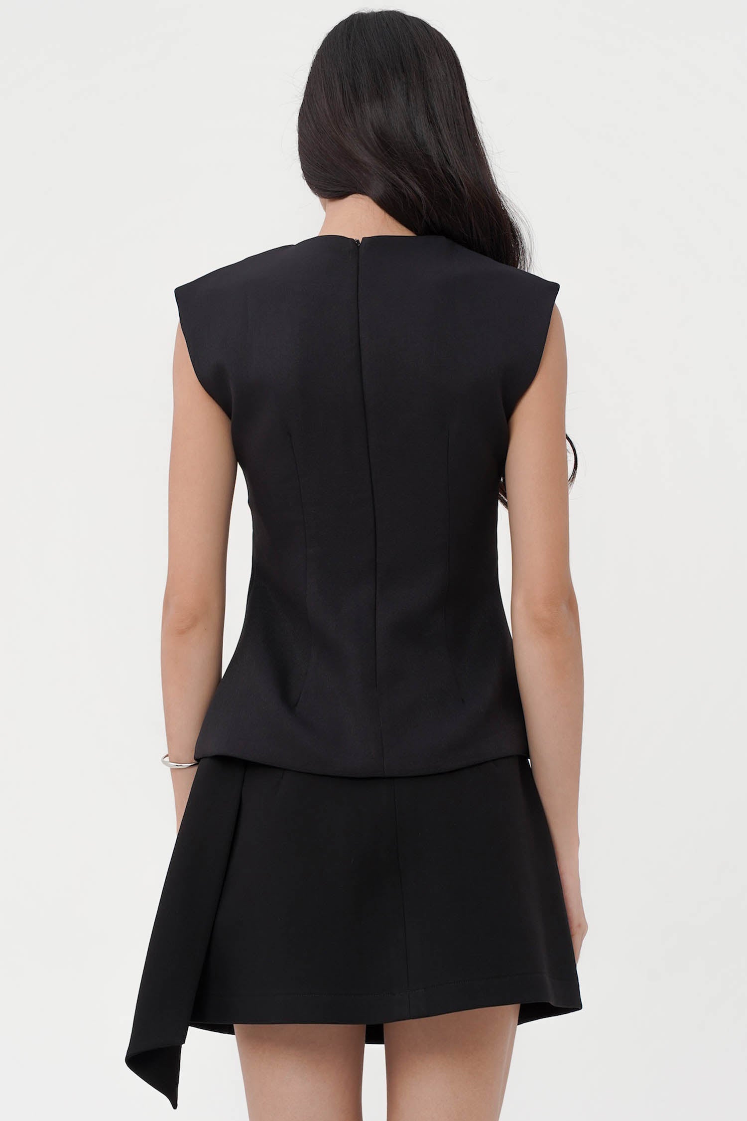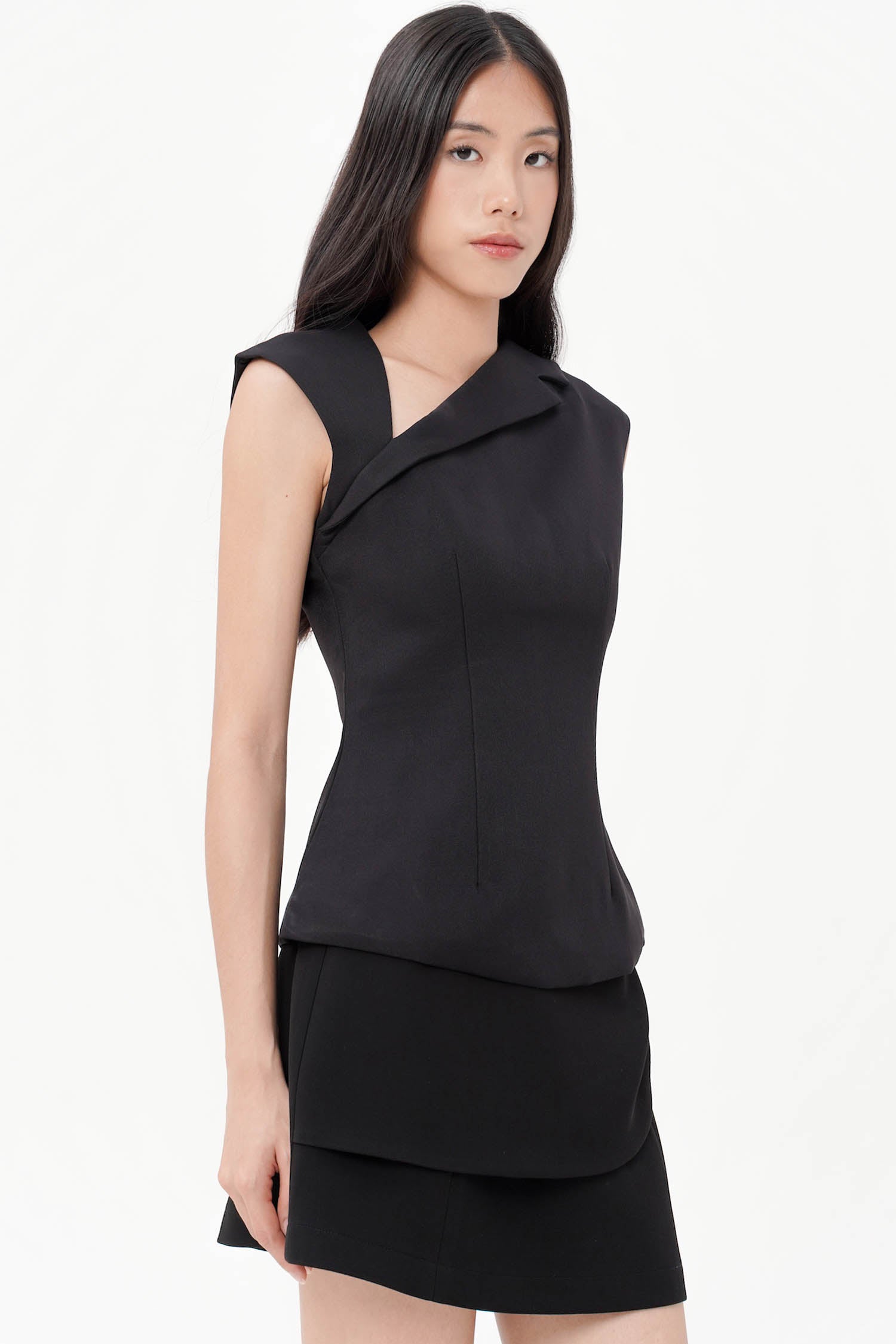 Exuding a quiet confidence, the Jaq Asymmetric Top redefines modern tailoring through its sculptural silhouette and refined minimalism. Crafted from premium semi wool, this sleeveless piece features a distinctive asymmetric neckline that frames the collarbone with subtle sophistication. Its structured form is balanced by fluid lines, creating an elegant drape that flatters the figure from every angle. A concealed back closure ensures a seamless finish, making it a timeless statement for both day and evening ensembles. Available in broken white and black.