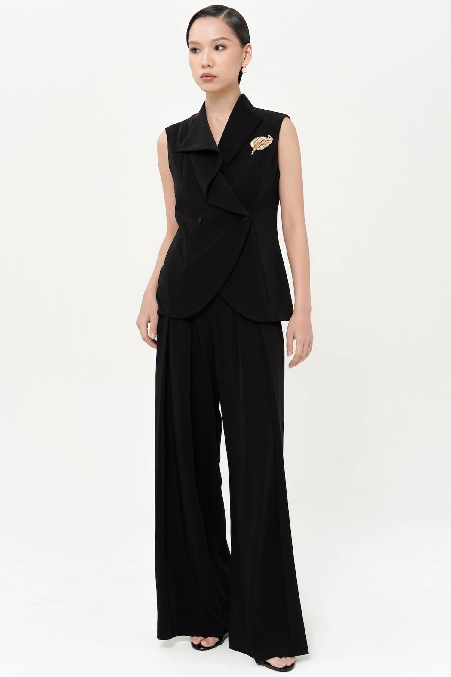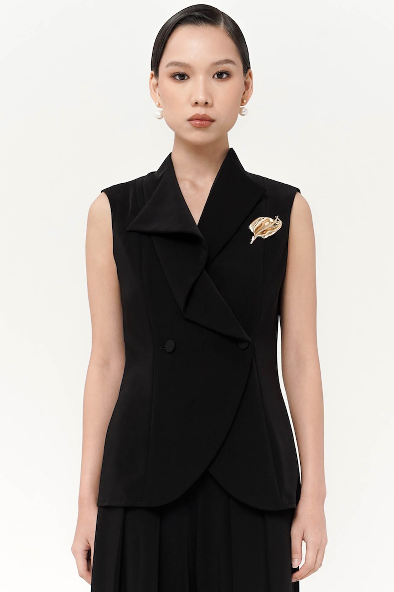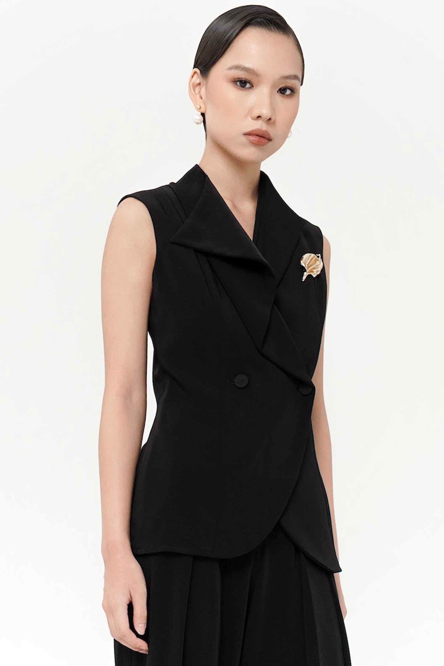 The Kairo Vest features a double-breasted front with draped lapels and a curved hem for a modern, tailored finish. Brooch is included.