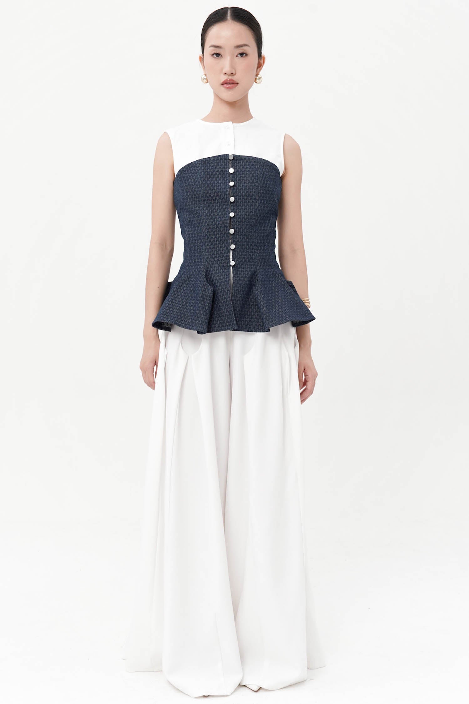 Krilo pants are crafted from a wool blend, featuring a flowing and voluminous silhouette that is accentuated by 3D panels running from the hips to the hem. Designed with a high waist for added comfort, these pants pair beautifully with either a cropped or fitted top. They also come with adjustable thin straps at the waist for a personalized fit.