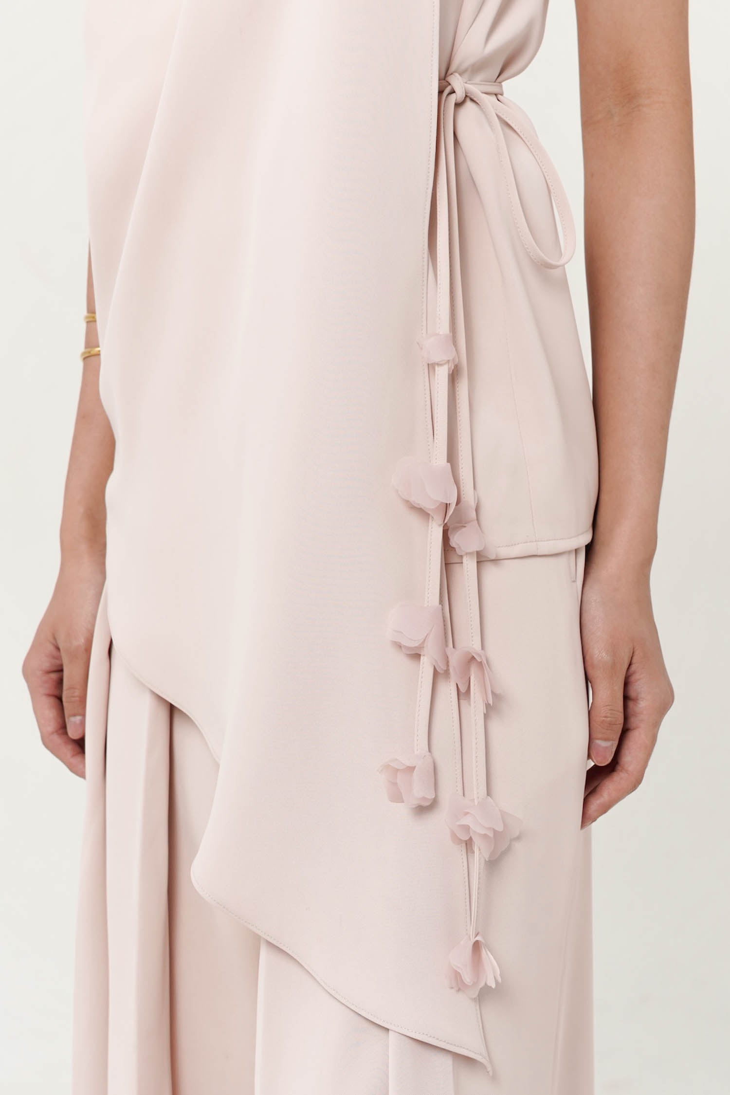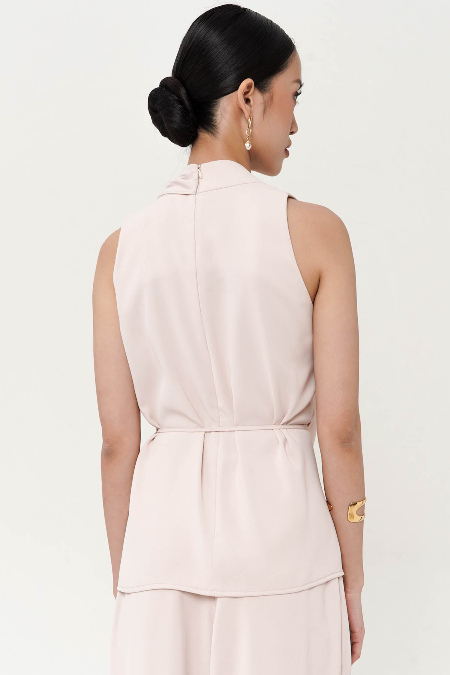 The Kyra Top features asymmetric draping and a fluid angled hemline in soft ivory. Designed with a detachable belt, it can be worn cinched or loose for versatile styling. Belt is included