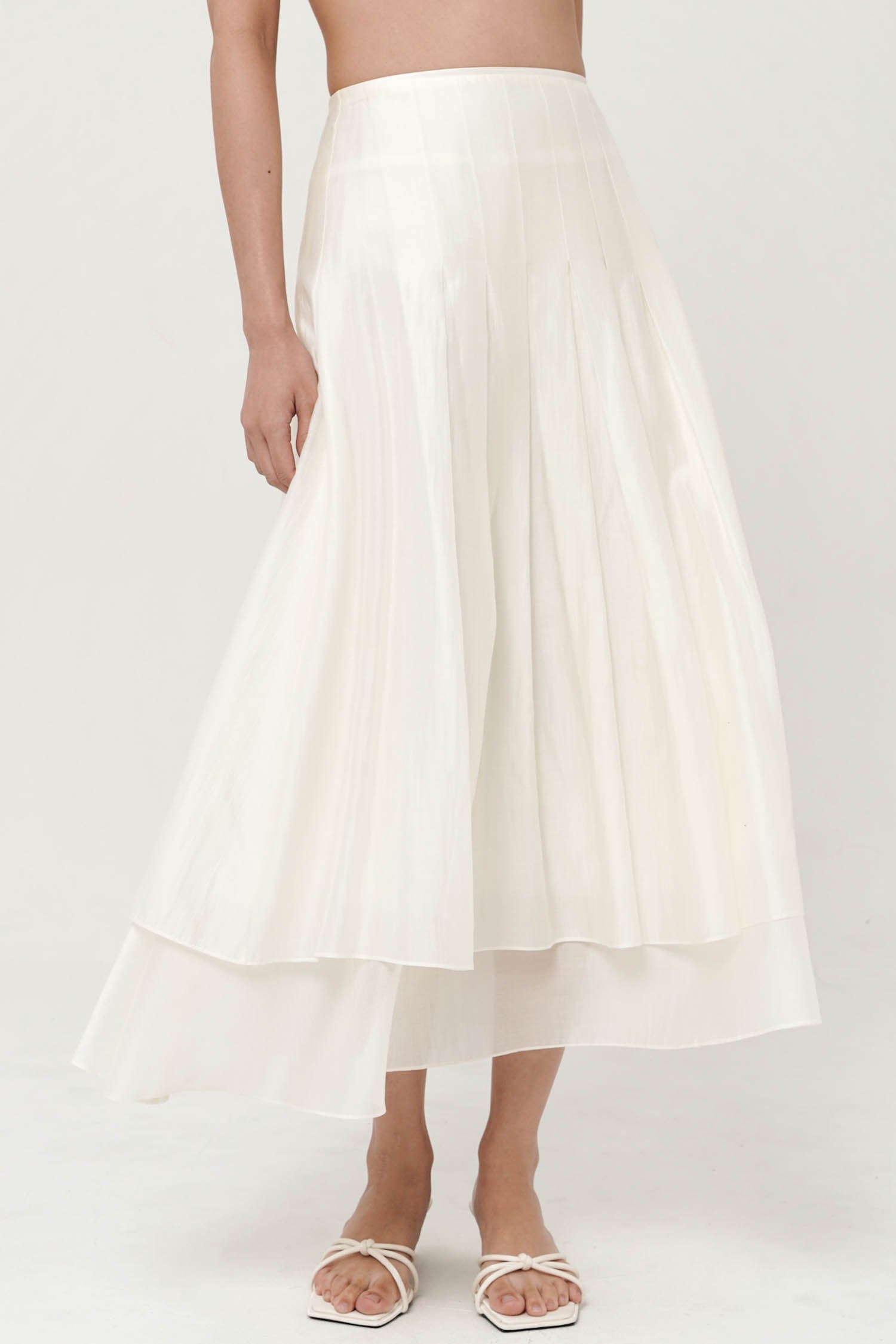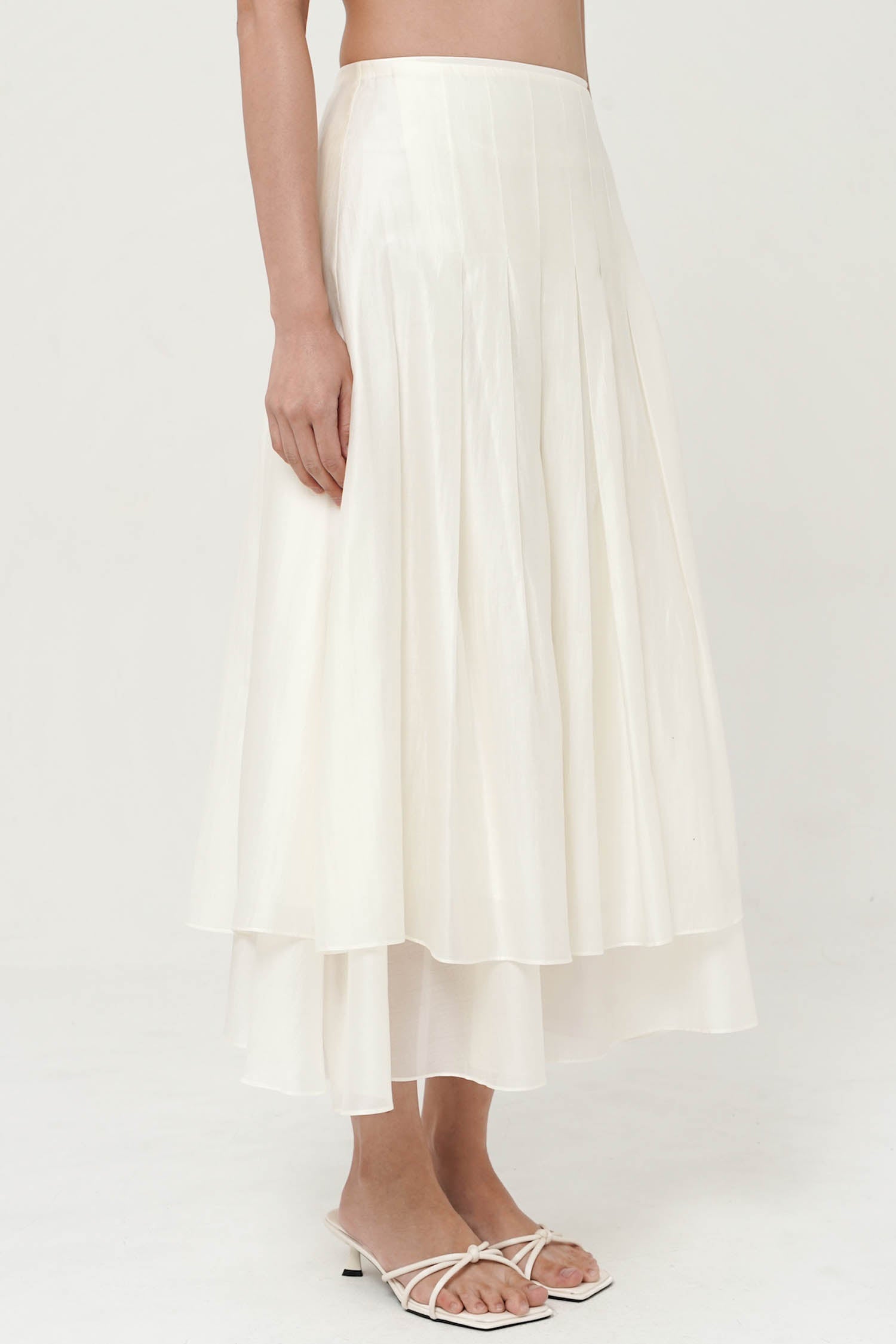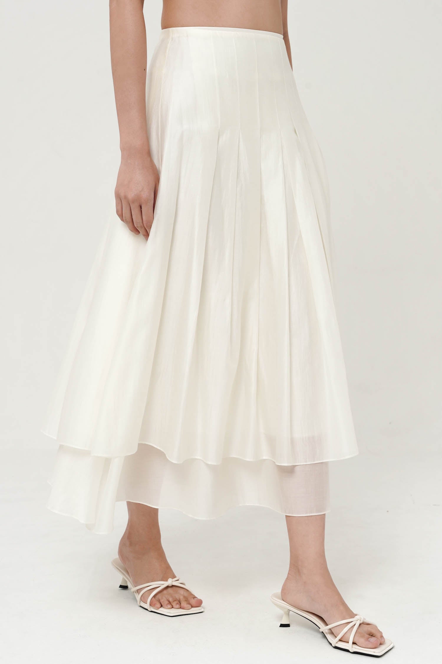 This skirt is a white, high-waisted midi design with a soft, flowing silhouette. It features a layered construction with a slightly shorter top layer over a longer underlayer, creating depth and dimension. Gentle pleating from the waistband adds volume and movement, giving it an airy and elegant feel. The lightweight fabric enhances its graceful drape, making it versatile for both casual and refined looks.
