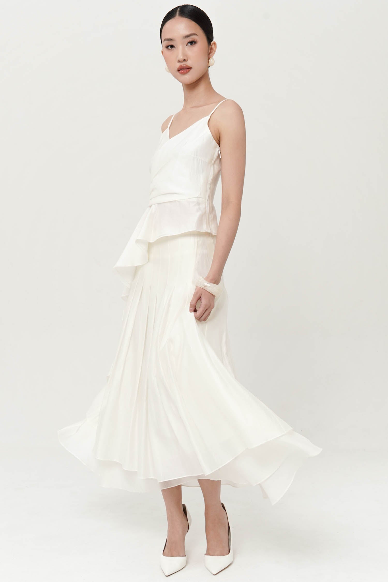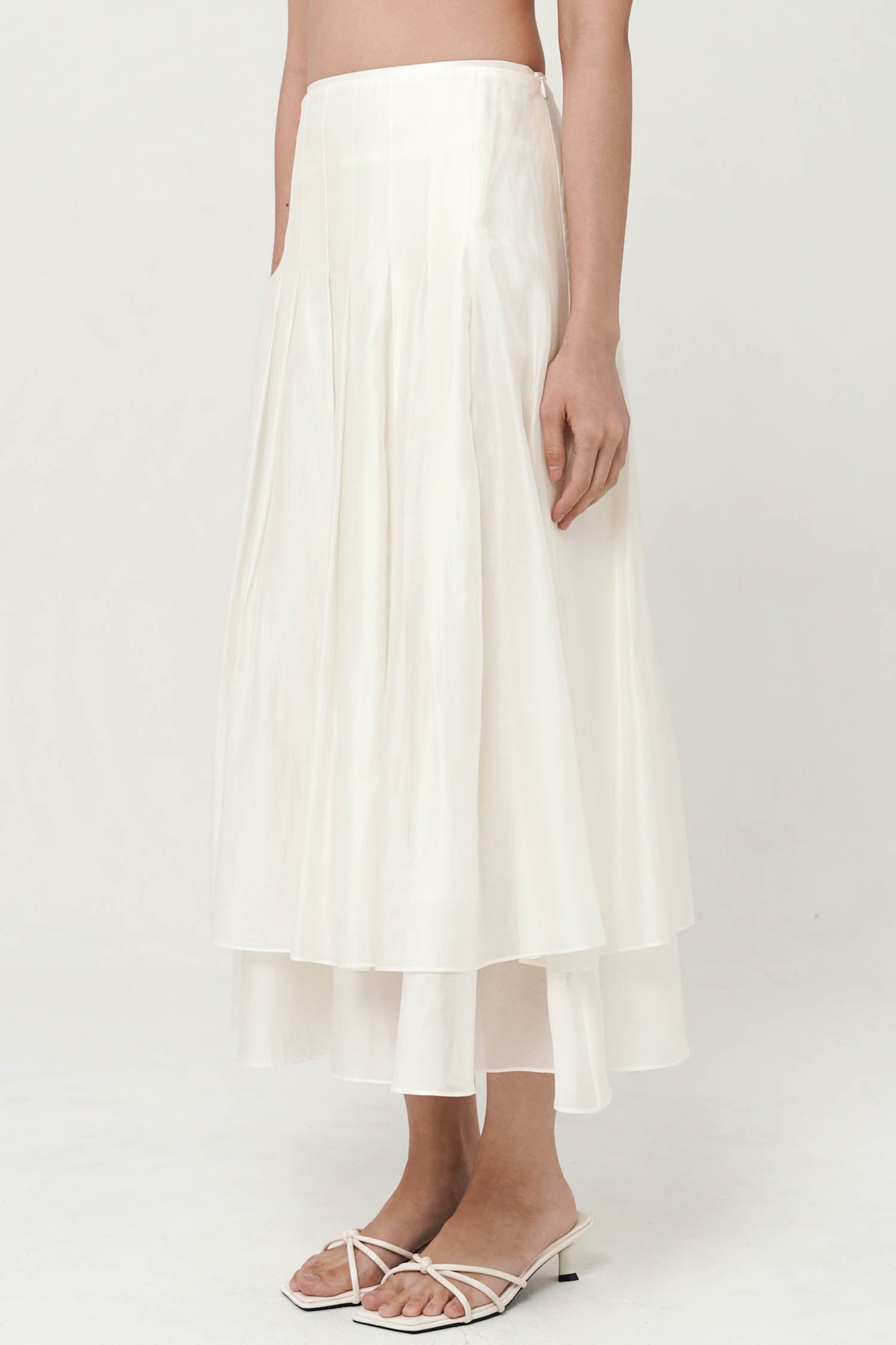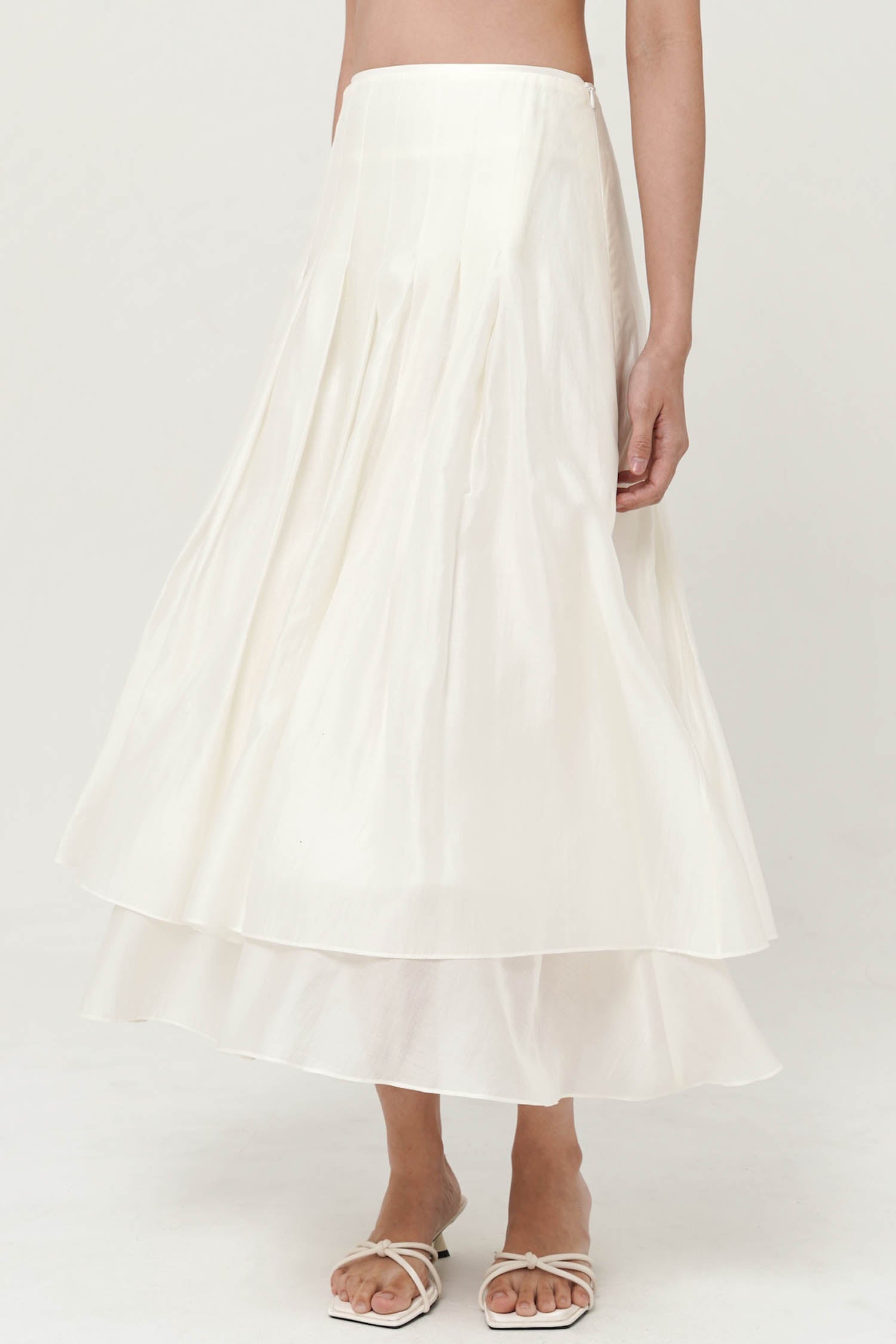 This skirt is a white, high-waisted midi design with a soft, flowing silhouette. It features a layered construction with a slightly shorter top layer over a longer underlayer, creating depth and dimension. Gentle pleating from the waistband adds volume and movement, giving it an airy and elegant feel. The lightweight fabric enhances its graceful drape, making it versatile for both casual and refined looks.