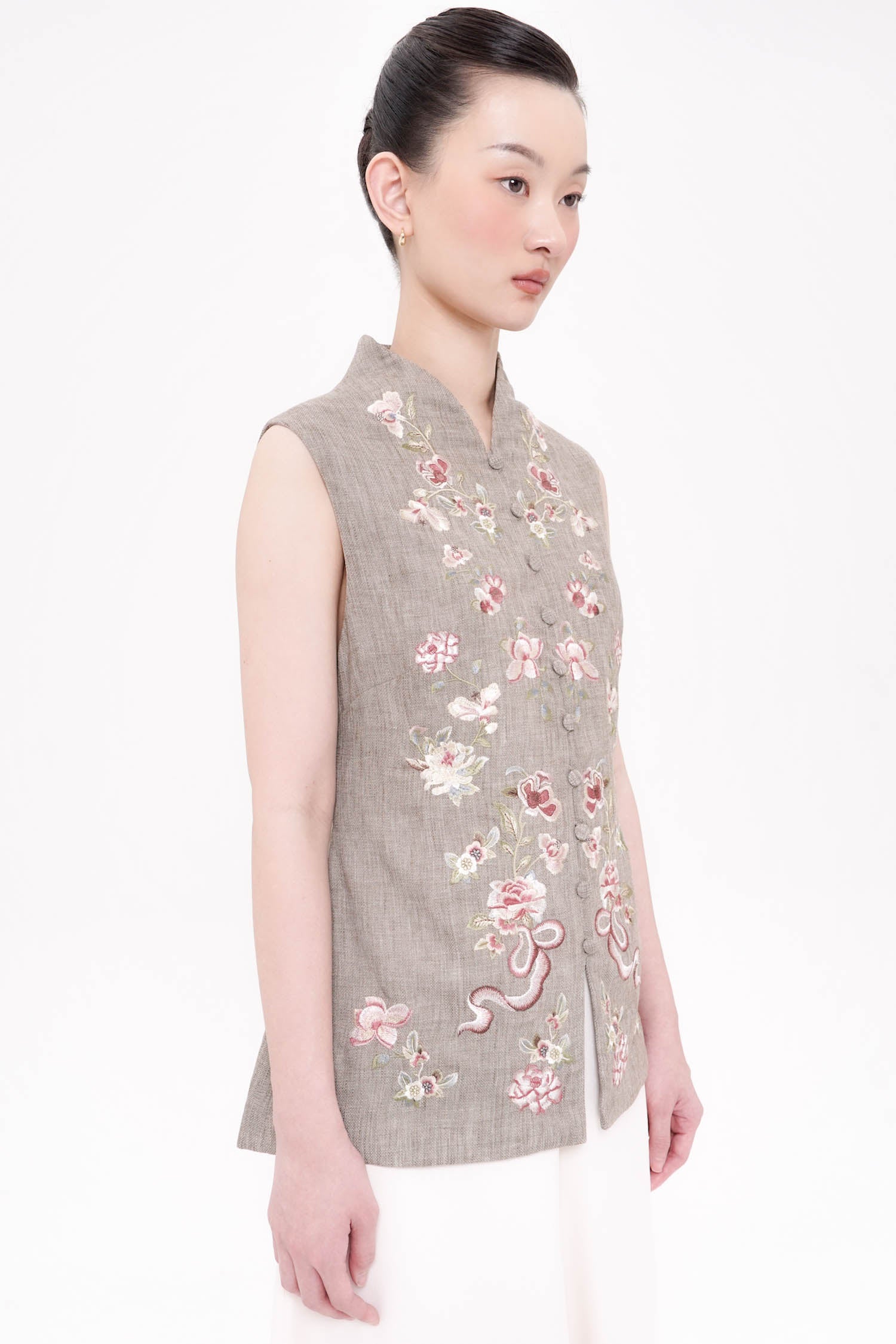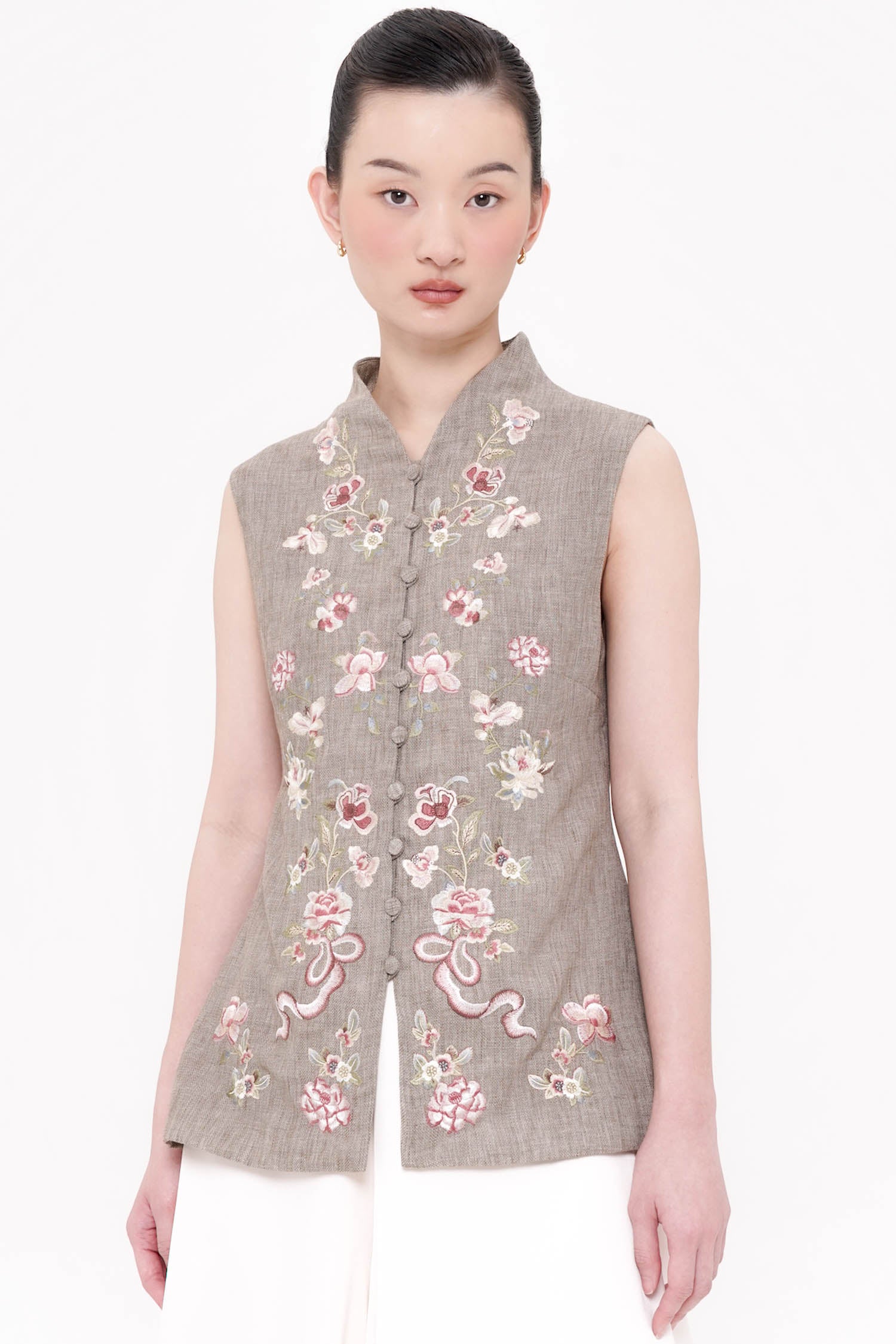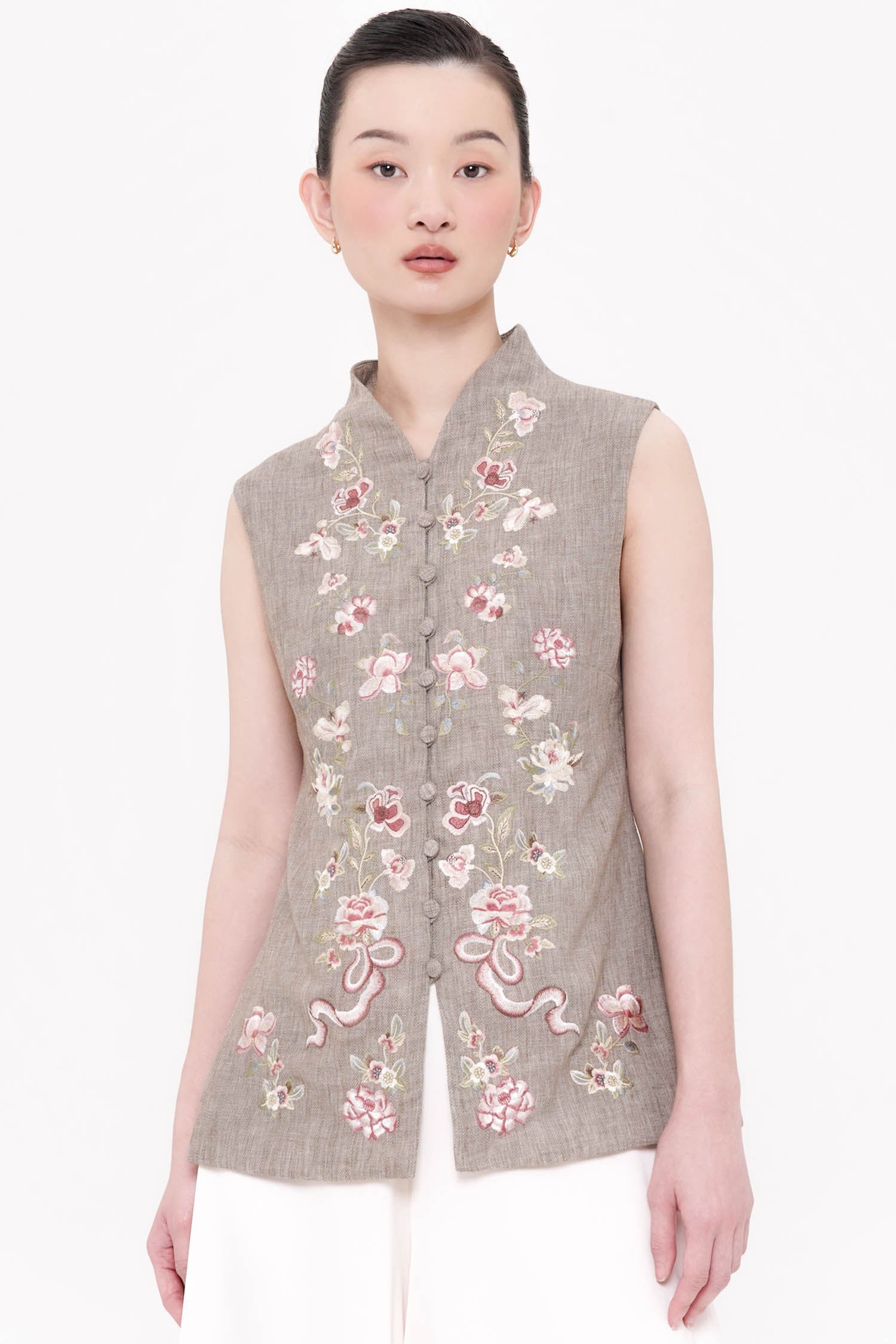 The Lian Embroidered Top is a sophisticated reinterpretation of traditional cheongsam tailoring, crafted from breathable linen with a refined, structured silhouette. Delicate floral embroidery adorns the front, thoughtfully arranged to create balance and visual elegance while reflecting heritage-inspired symbolism of grace and continuity. The sleeveless cut and clean mandarin collar lend a modern lightness, making it both polished and versatile for layered or standalone styling. Finished with fabric-covered buttons and precise detailing, this top offers a timeless elegance that transitions seamlessly from daytime gatherings to refined festive occasions. Available in Oat and Ash Brown.