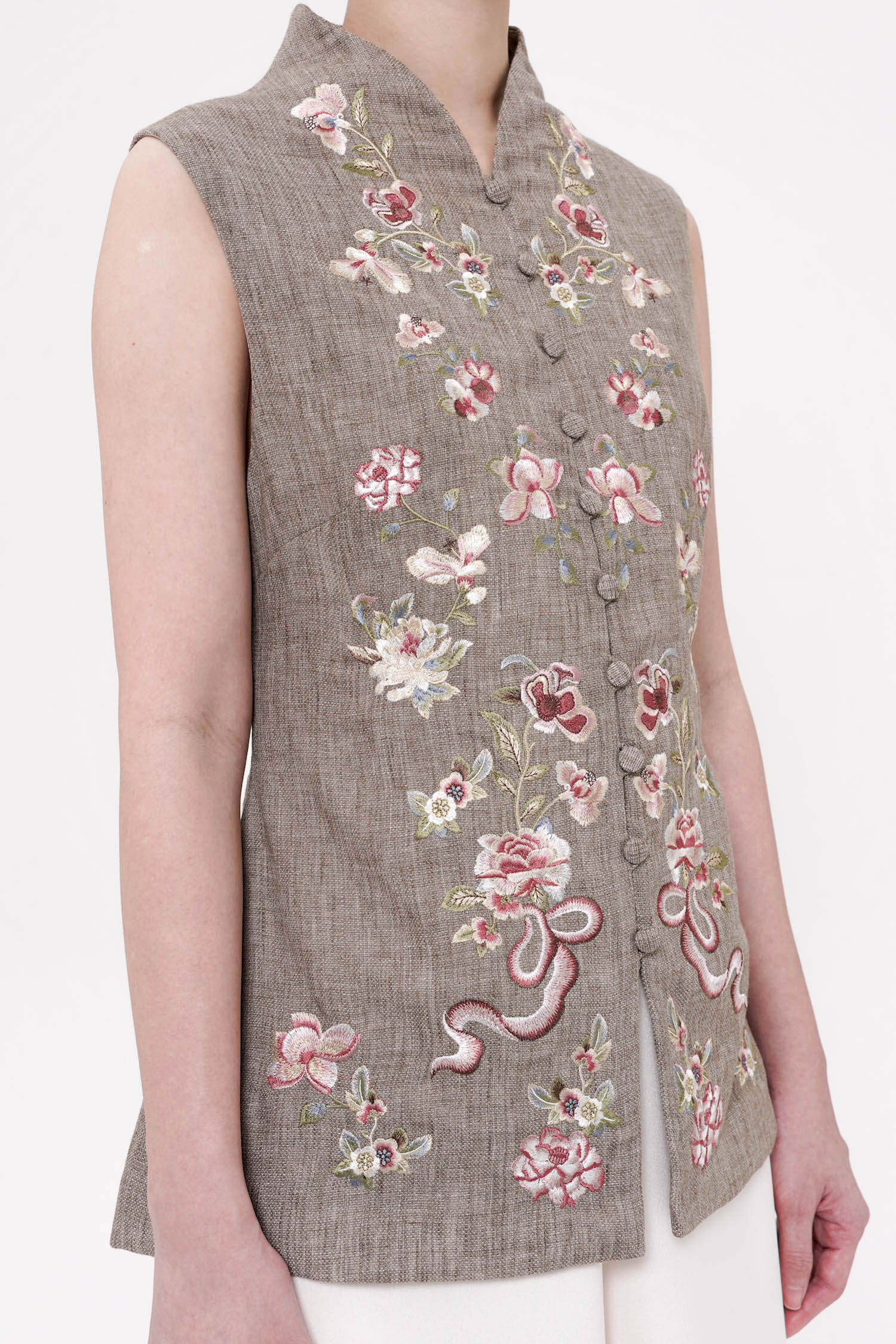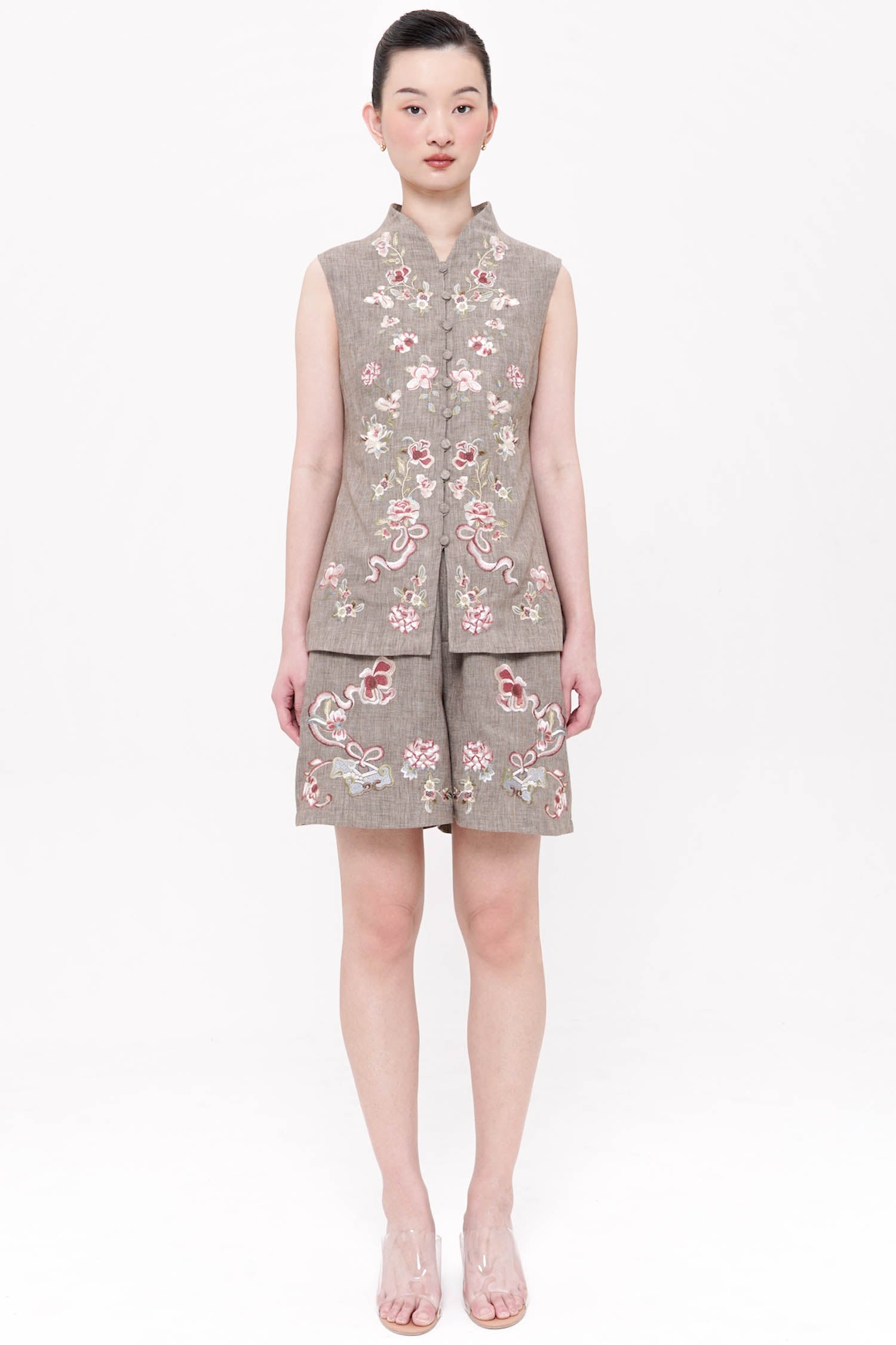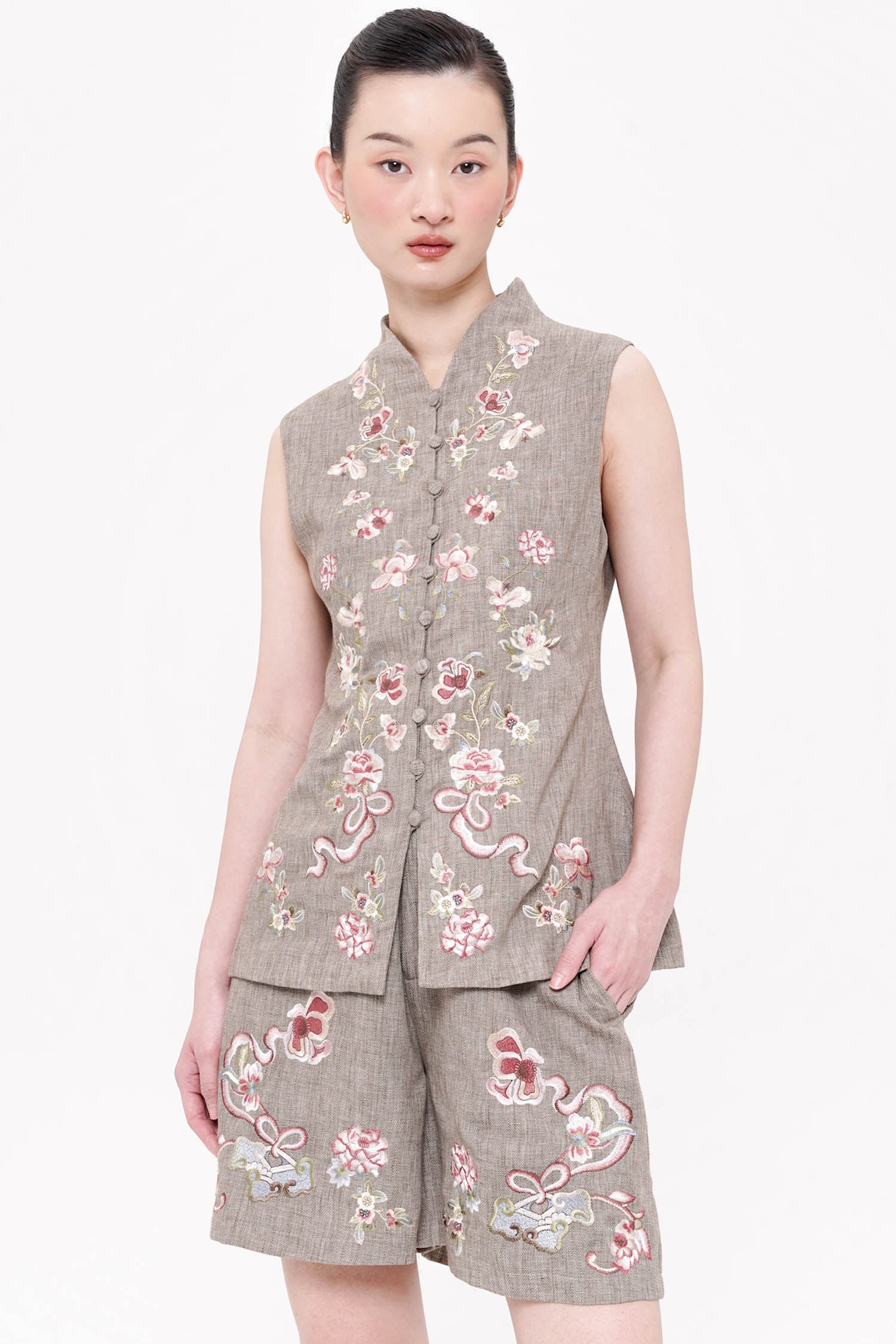 The Lian Embroidered Top is a sophisticated reinterpretation of traditional cheongsam tailoring, crafted from breathable linen with a refined, structured silhouette. Delicate floral embroidery adorns the front, thoughtfully arranged to create balance and visual elegance while reflecting heritage-inspired symbolism of grace and continuity. The sleeveless cut and clean mandarin collar lend a modern lightness, making it both polished and versatile for layered or standalone styling. Finished with fabric-covered buttons and precise detailing, this top offers a timeless elegance that transitions seamlessly from daytime gatherings to refined festive occasions. Available in Oat and Ash Brown.