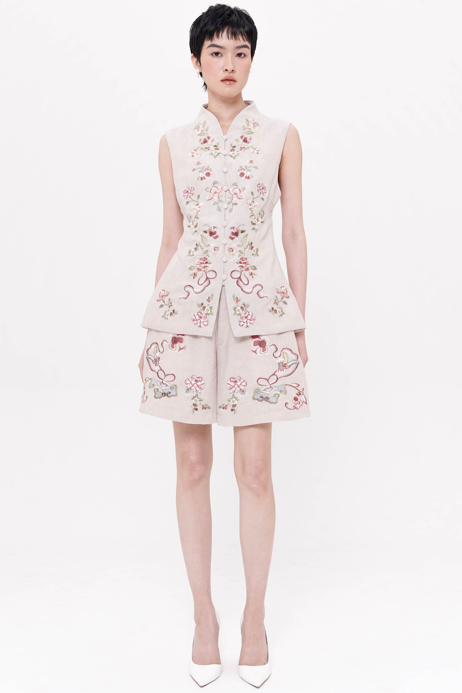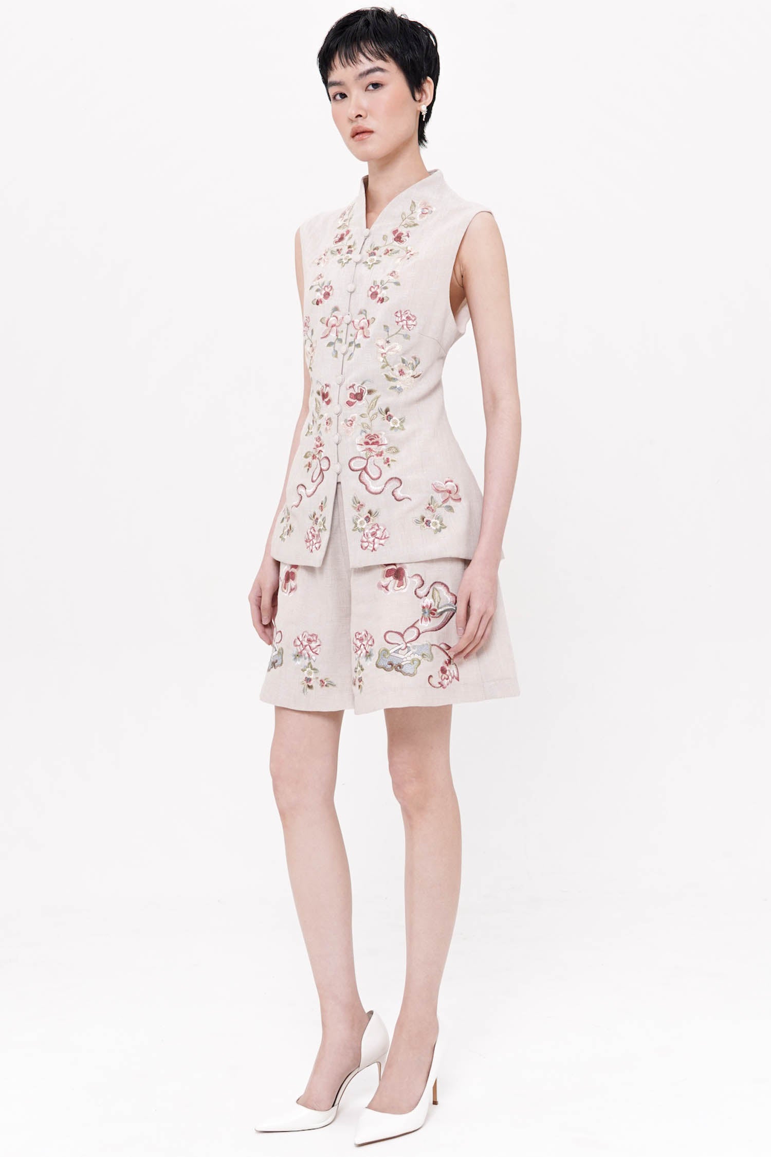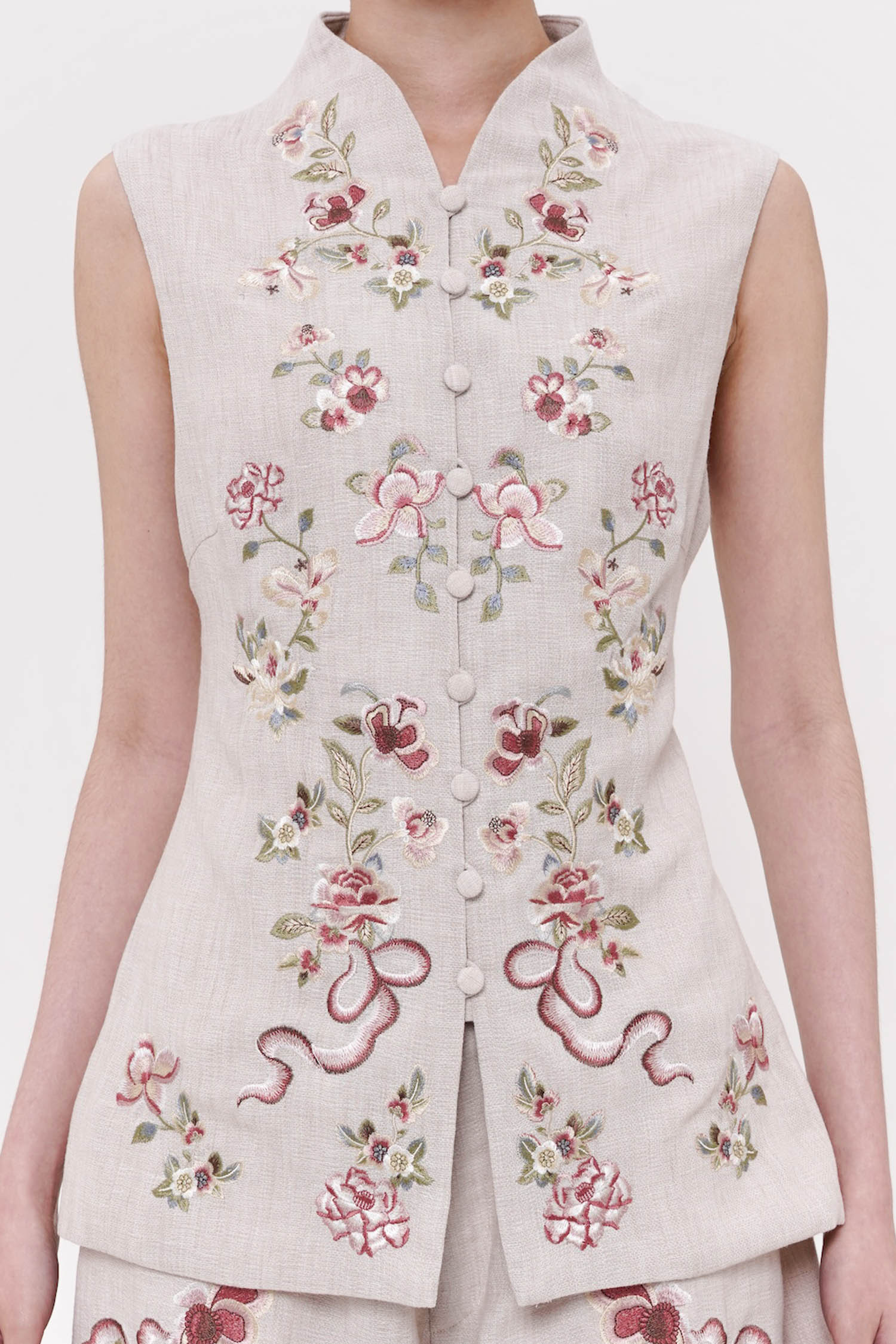 The Lian Embroidered Top is a sophisticated reinterpretation of traditional cheongsam tailoring, crafted from breathable linen with a refined, structured silhouette. Delicate floral embroidery adorns the front, thoughtfully arranged to create balance and visual elegance while reflecting heritage-inspired symbolism of grace and continuity. The sleeveless cut and clean mandarin collar lend a modern lightness, making it both polished and versatile for layered or standalone styling. Finished with fabric-covered buttons and precise detailing, this top offers a timeless elegance that transitions seamlessly from daytime gatherings to refined festive occasions. Available in Oat and Ash Brown.