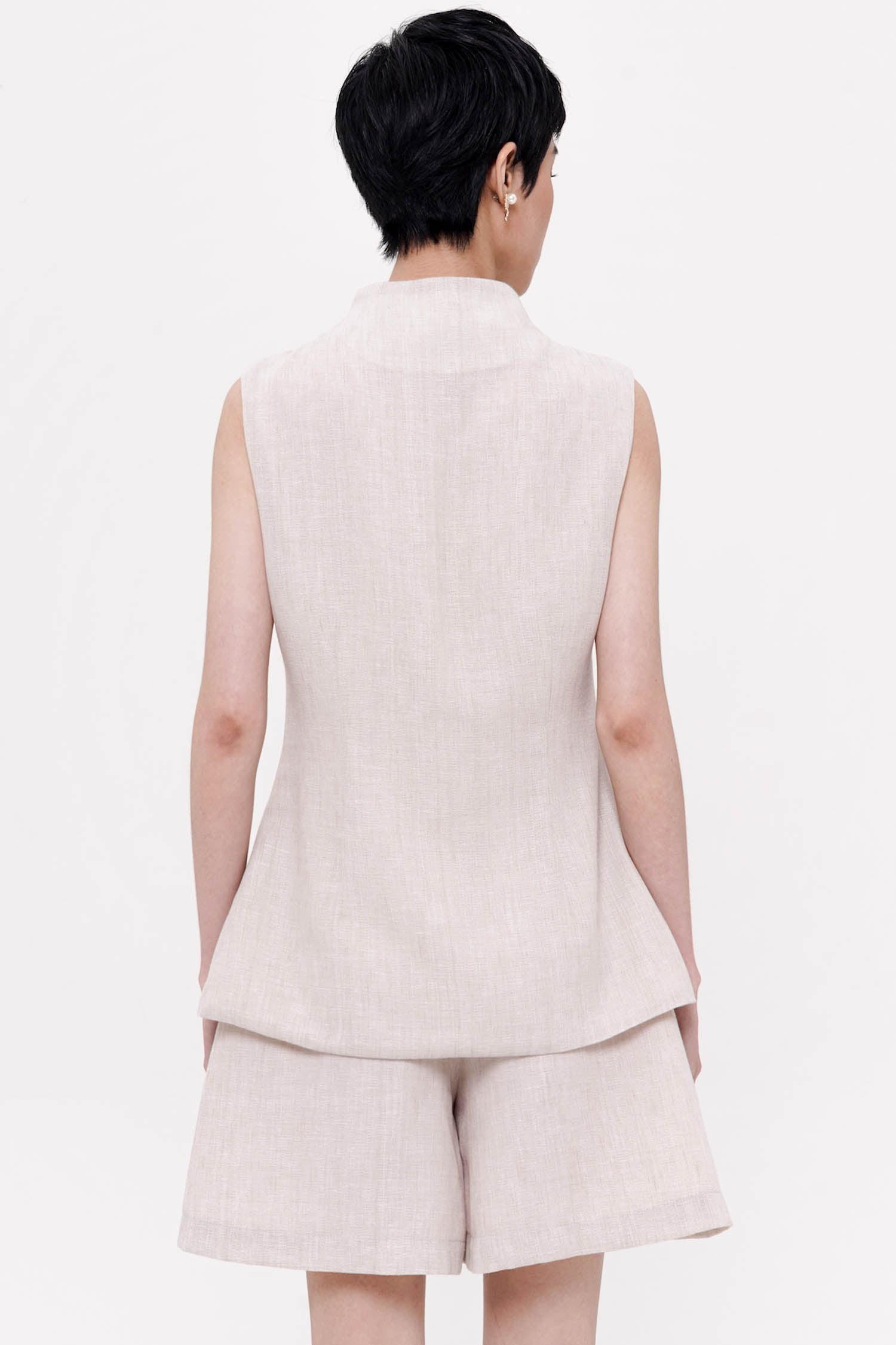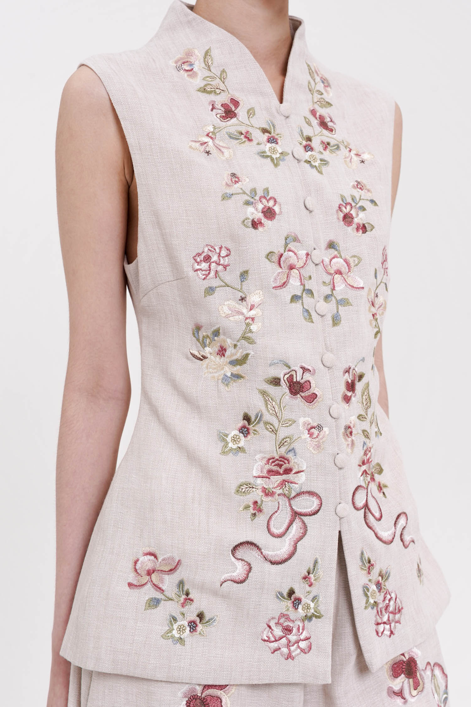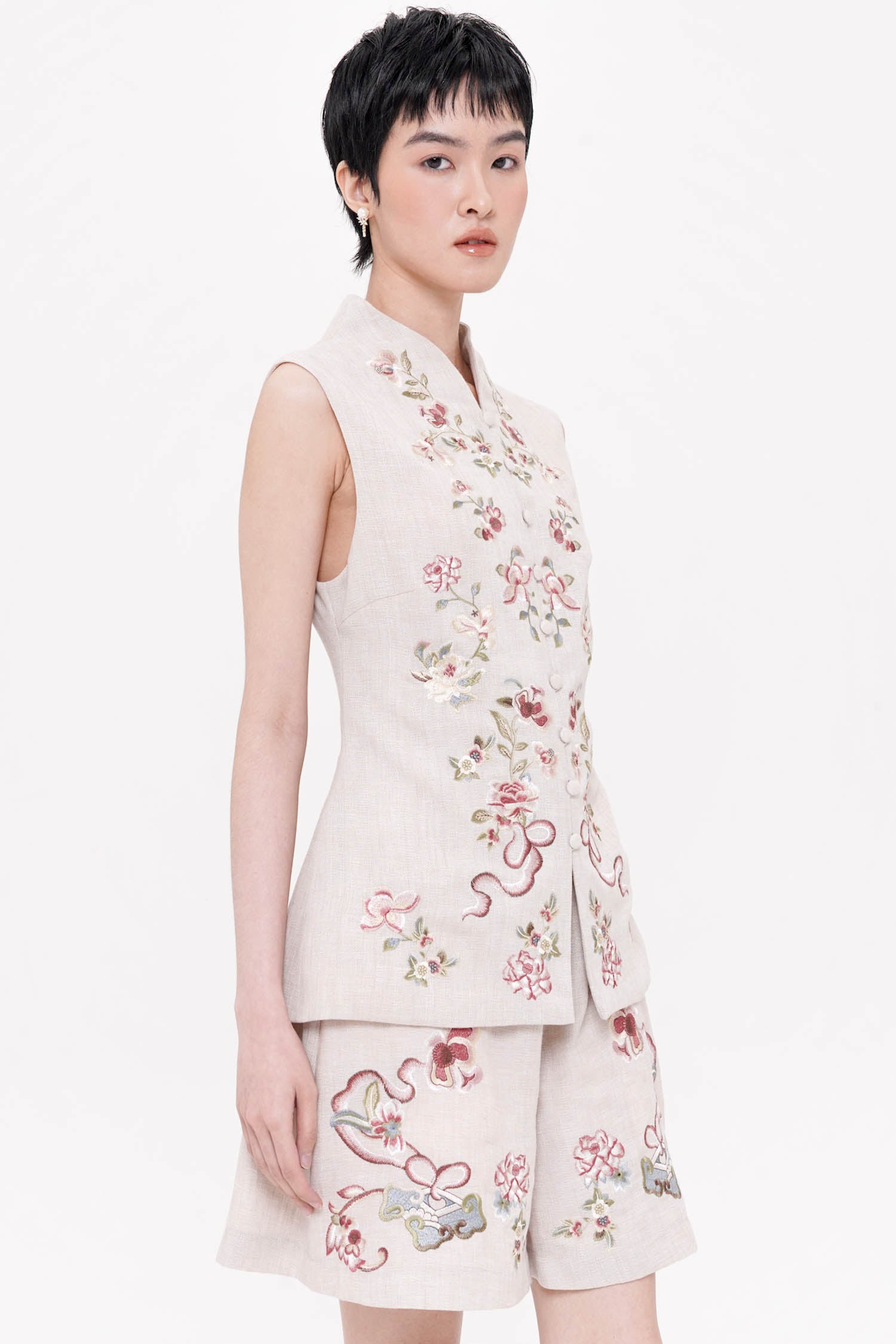 The Lian Embroidered Top is a sophisticated reinterpretation of traditional cheongsam tailoring, crafted from breathable linen with a refined, structured silhouette. Delicate floral embroidery adorns the front, thoughtfully arranged to create balance and visual elegance while reflecting heritage-inspired symbolism of grace and continuity. The sleeveless cut and clean mandarin collar lend a modern lightness, making it both polished and versatile for layered or standalone styling. Finished with fabric-covered buttons and precise detailing, this top offers a timeless elegance that transitions seamlessly from daytime gatherings to refined festive occasions. Available in Oat and Ash Brown.