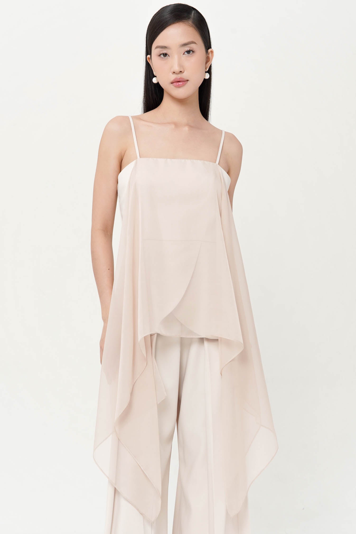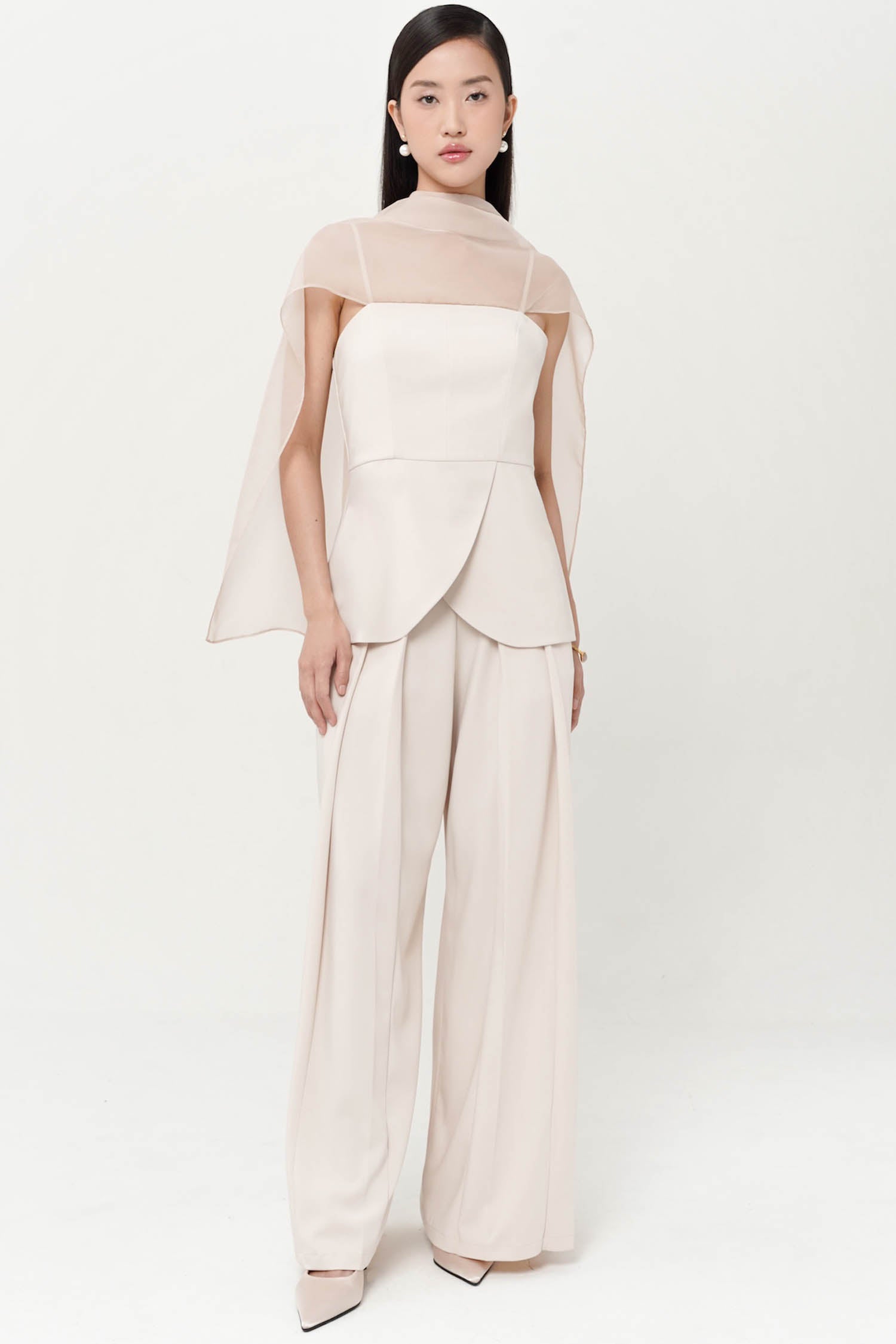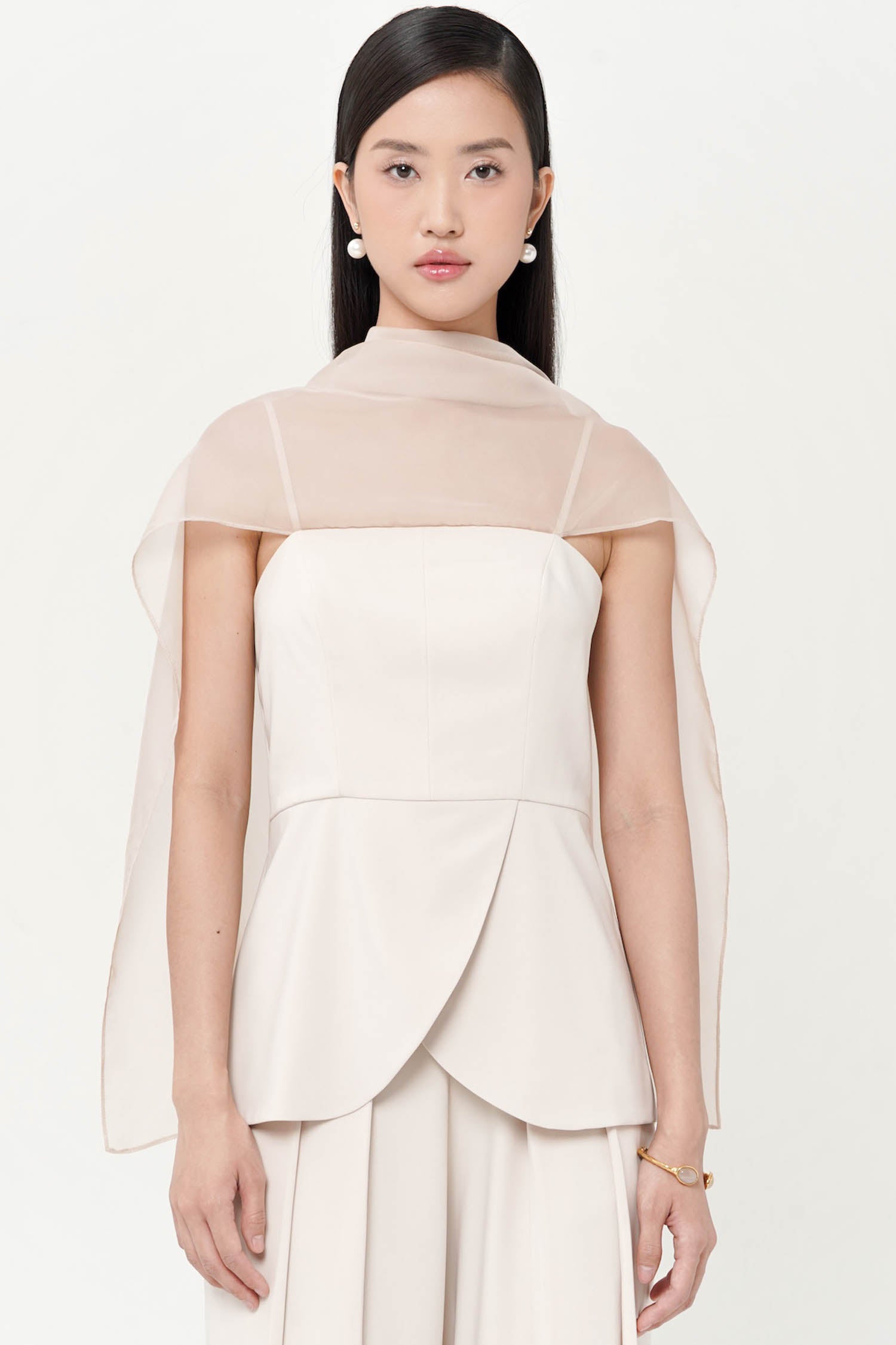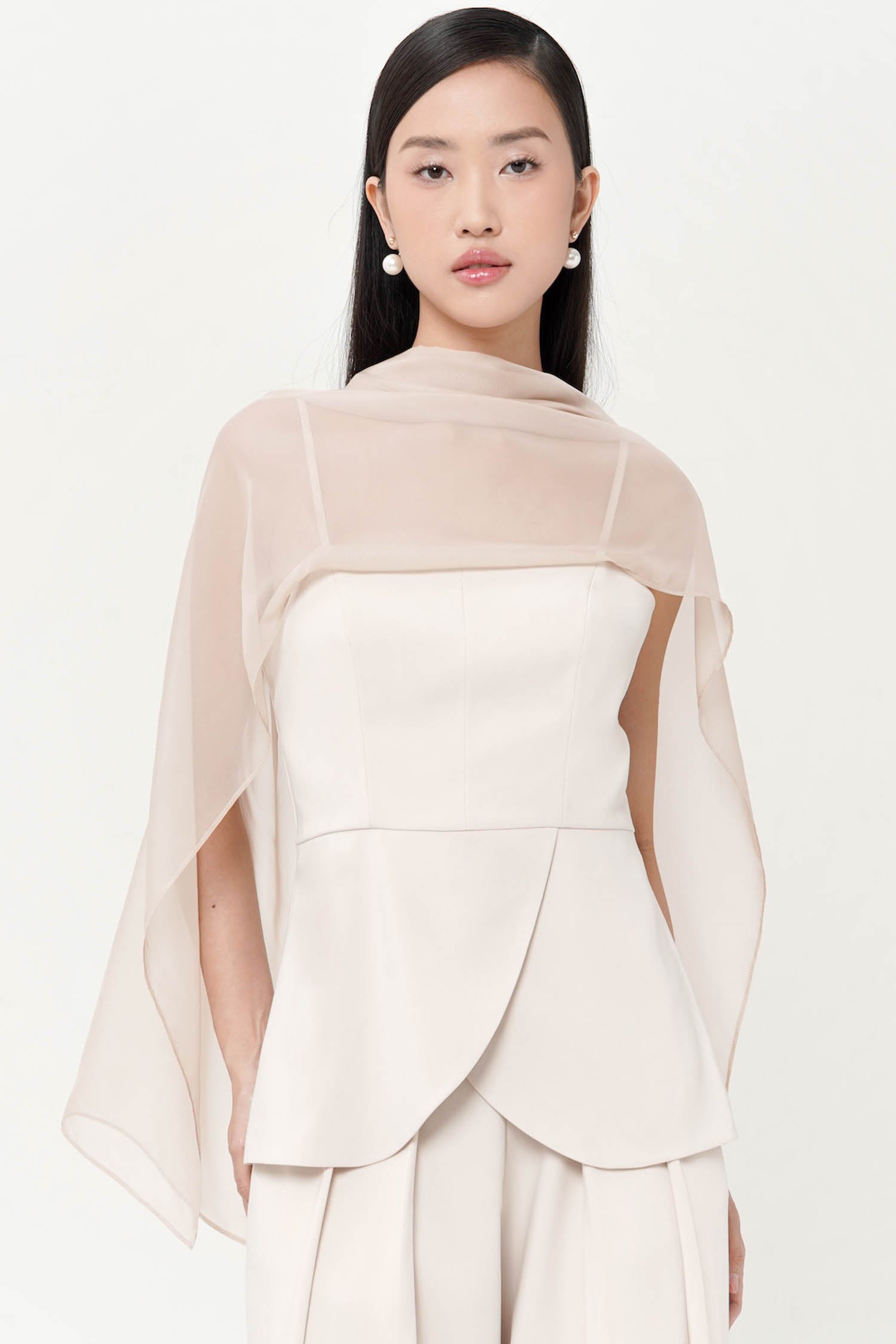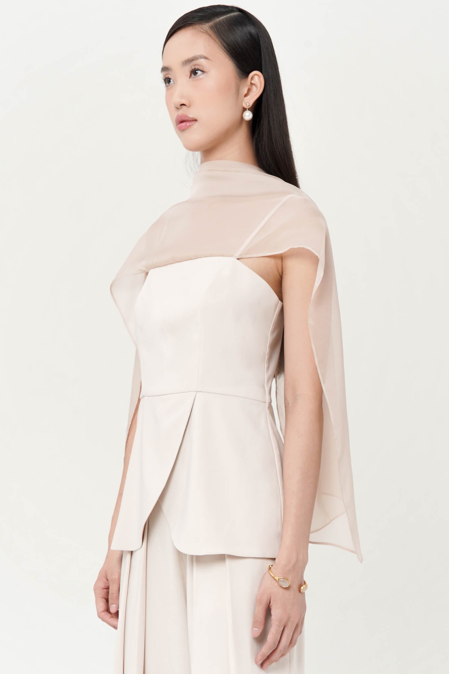 The Lume Top combines a structured bustier with a curved peplum hem and an attached chiffon overlay. Designed to drape across the shoulders like a shawl, it brings a soft, elegant finish to the tailored silhouette.