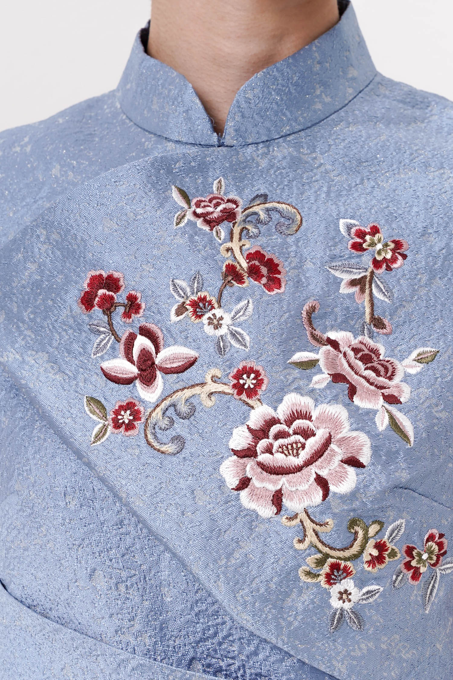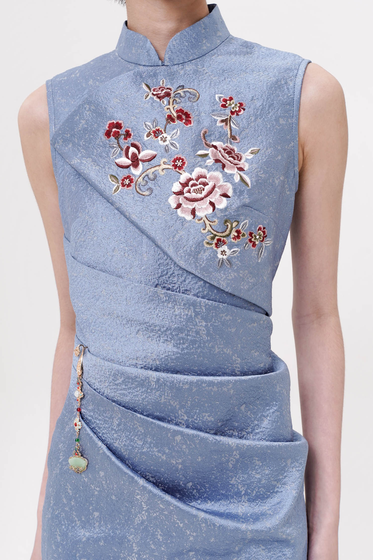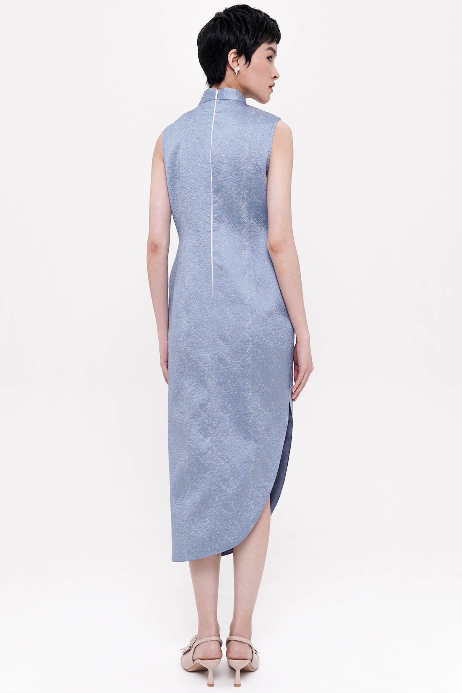 The Lunara Midi Draped Dress is an exquisite expression of timeless elegance, crafted from richly textured jacquard that lends depth and subtle sheen to its refined silhouette. Designed with a sculptural draped bodice and a sleek mandarin-inspired neckline, the dress contours the figure with graceful folds that flow seamlessly into a softly asymmetrical midi hem, creating a poised and elongating effect. Delicate embroidered detailing and an ornamental side accent add a touch of artisanal sophistication, elevating the design with understated opulence. Available in Beige, Blue, and Maroon, this piece is a distinguished choice for formal occasions, offering a harmonious balance of classic refinement and contemporary allure.