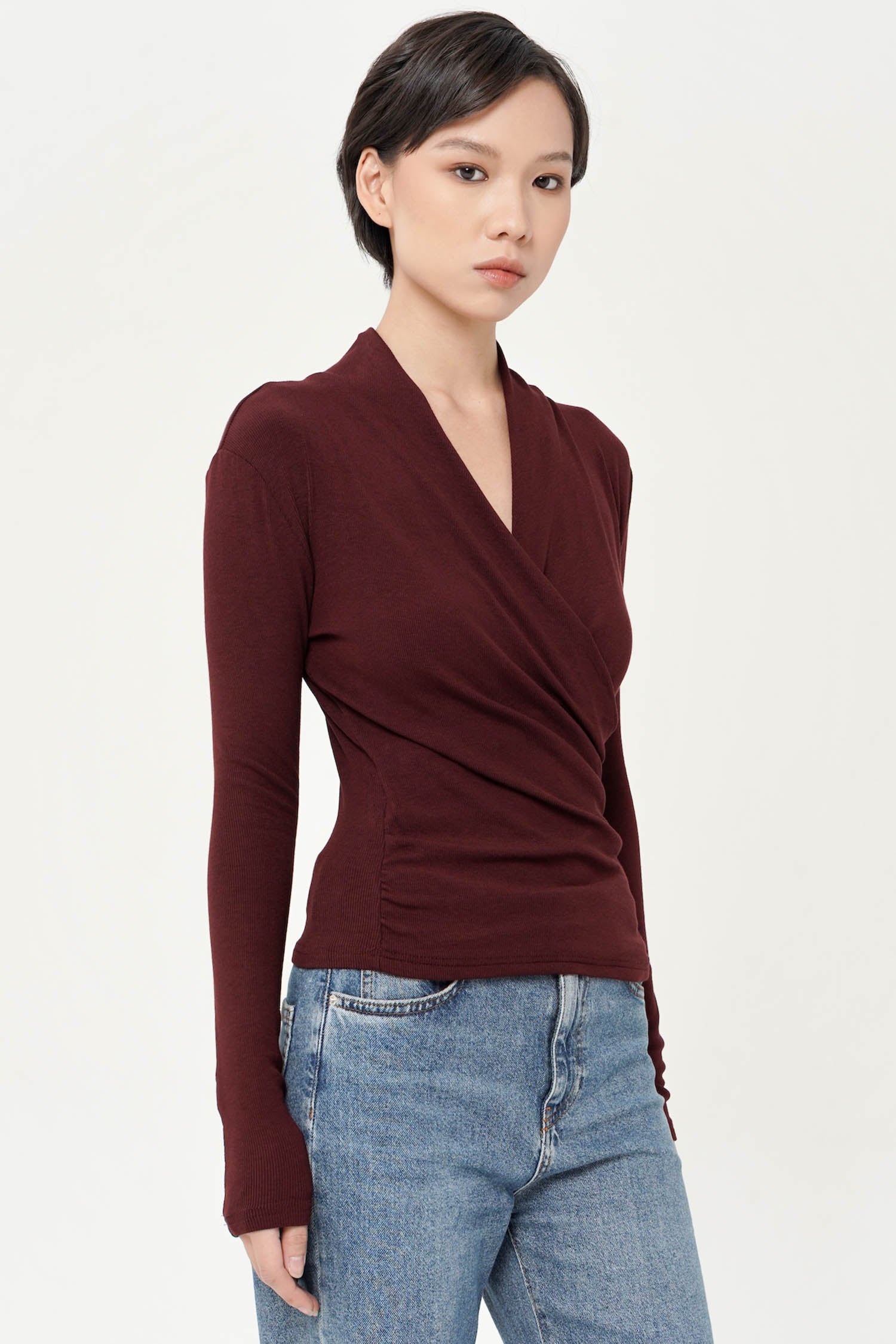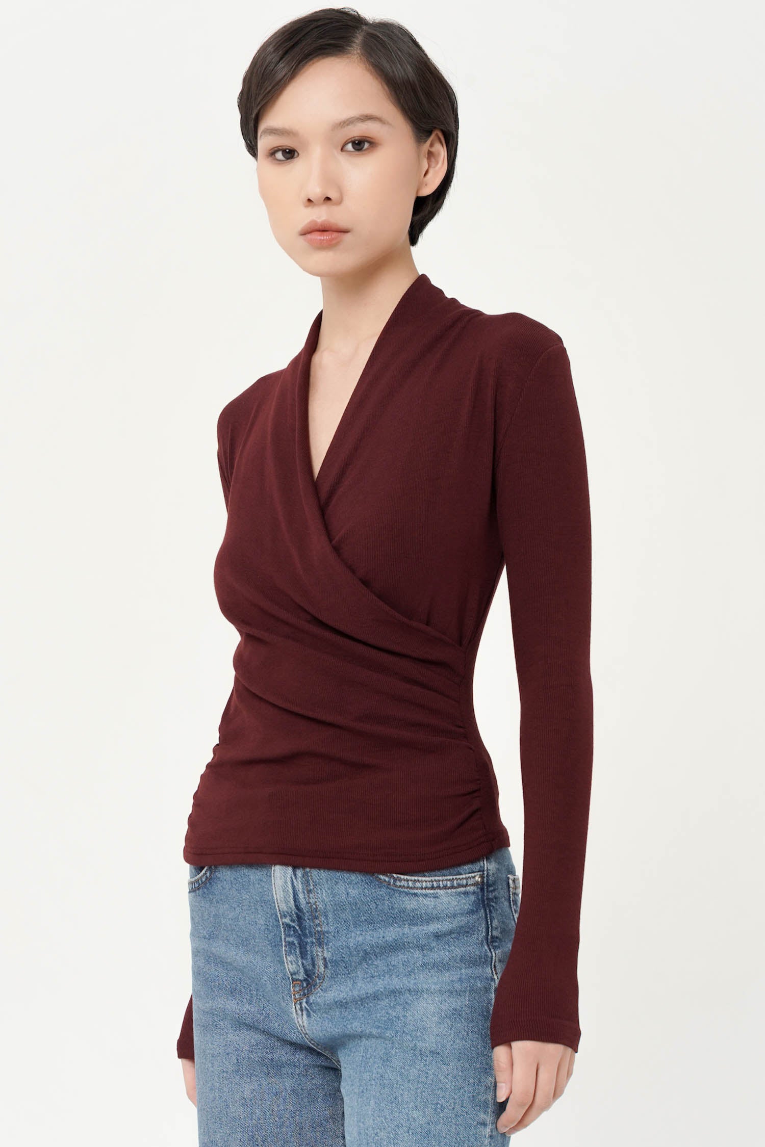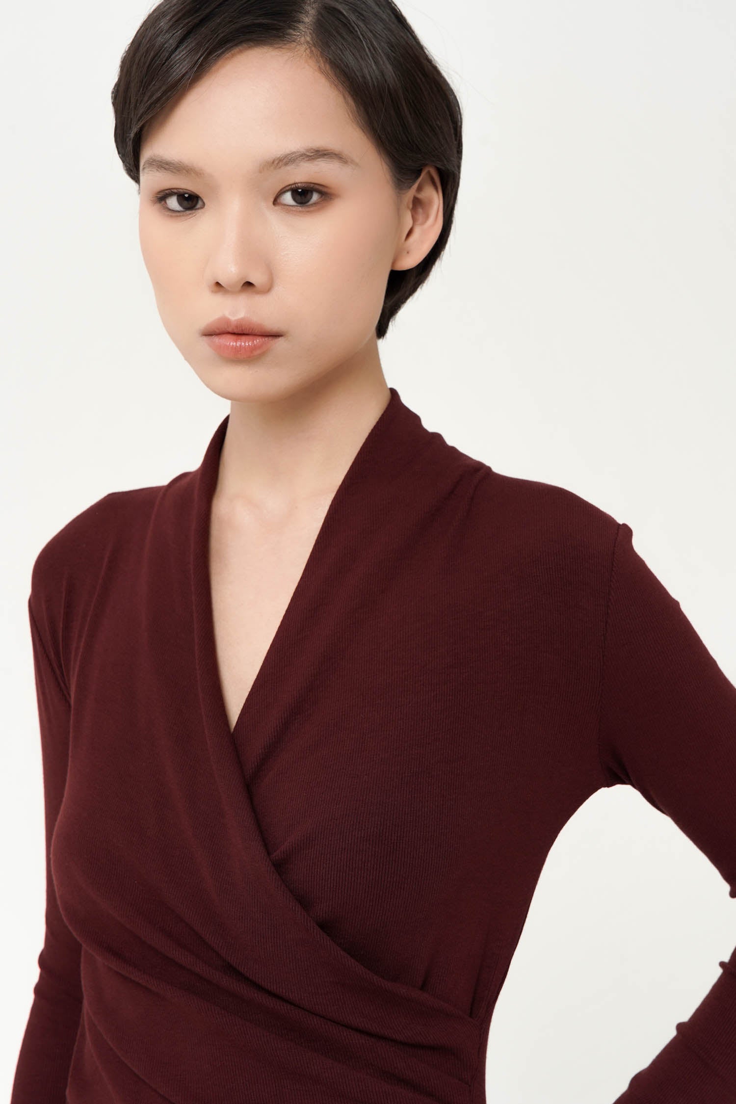 The Magda Draped Wrap Blouse is a refined essential that combines understated elegance with modern femininity. Crafted from soft polyester, this blouse is designed with a flattering wrap silhouette that gently drapes across the body, enhanced by subtle ruching at the sides to create a gracefully contoured fit. The long sleeves and clean neckline add a touch of sophistication, making it versatile enough for both polished office ensembles and elevated casual wear. Available in Dark Grey, Black, and Wine, this timeless piece offers effortless refinement in every shade.