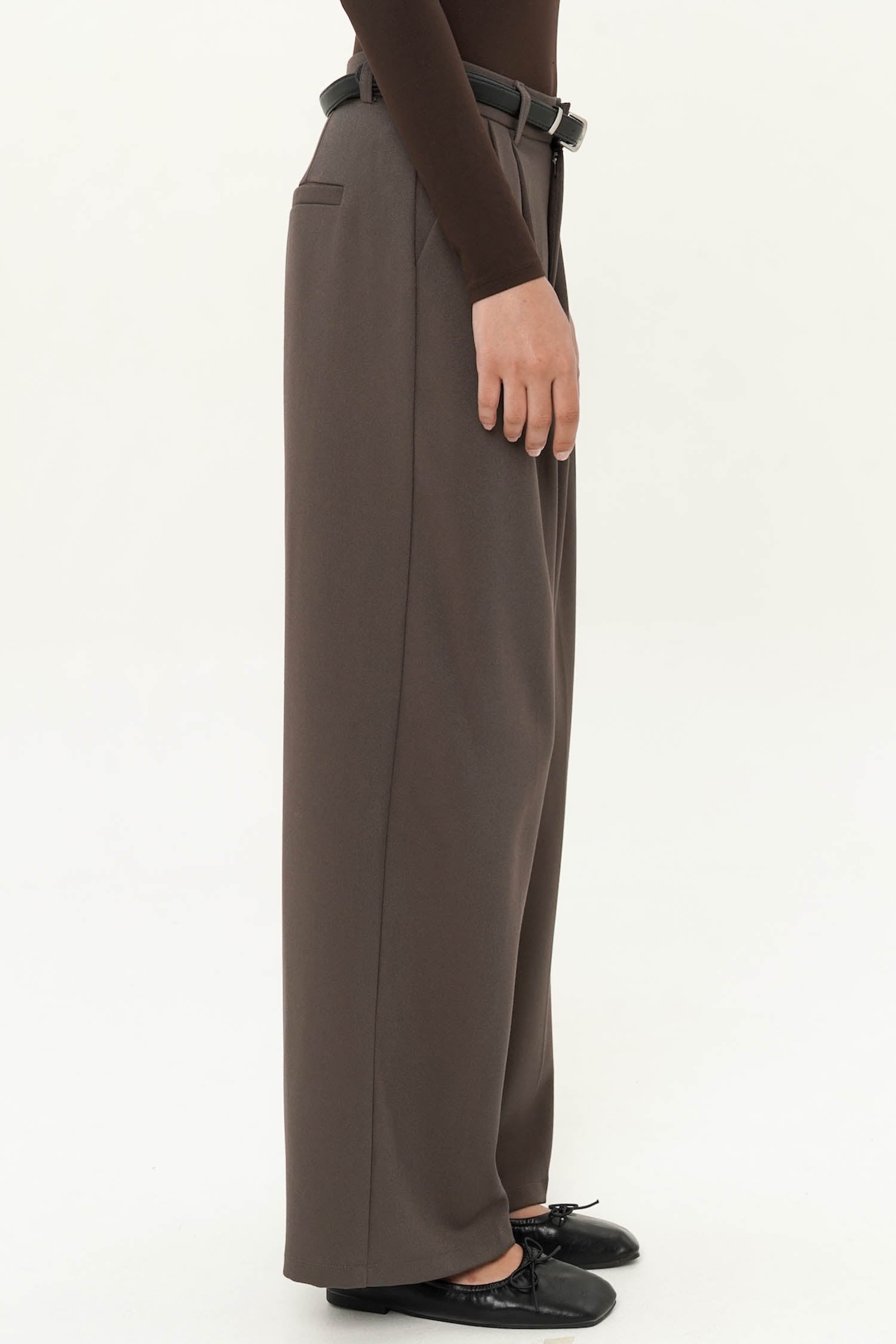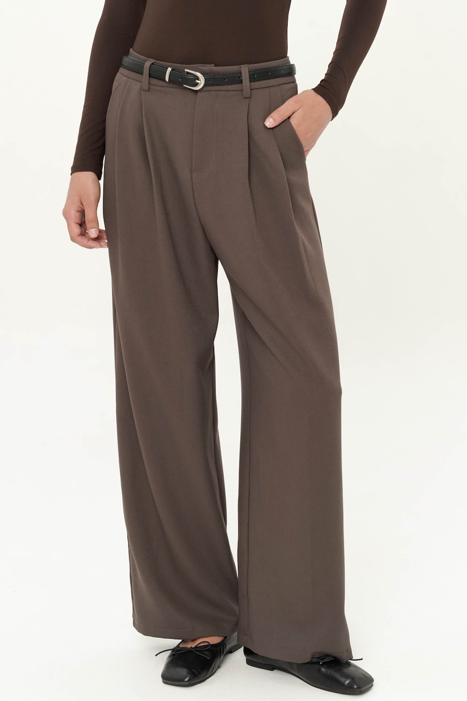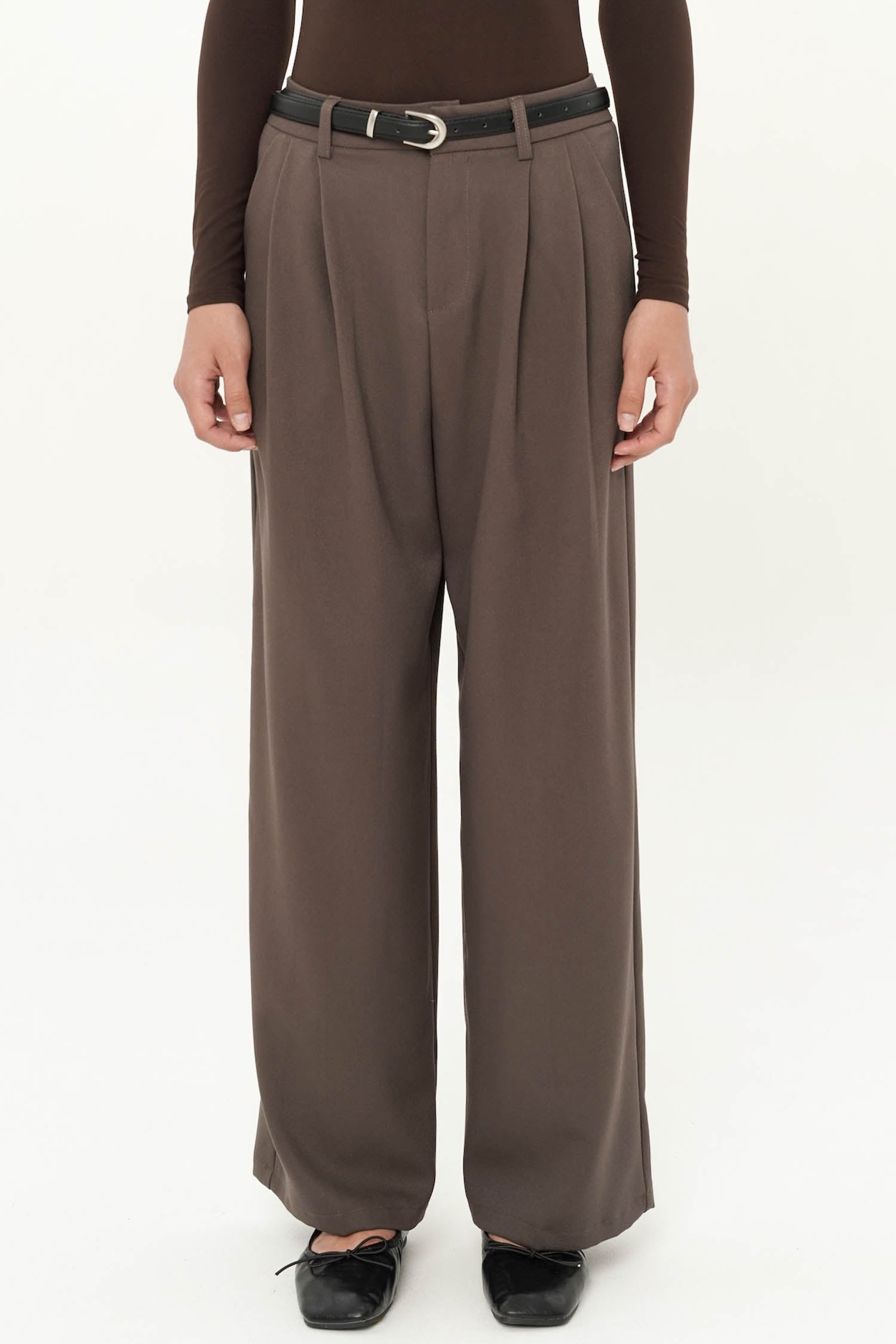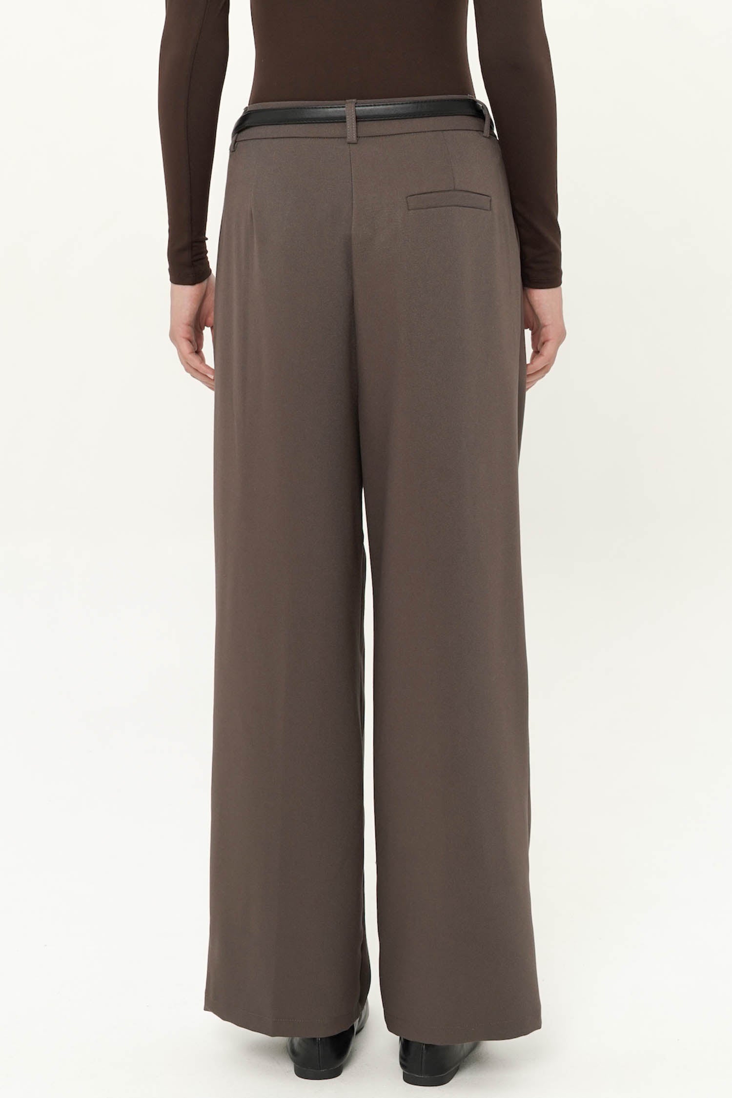 The Majorie Belted Trouser is a refined wardrobe essential, tailored to perfection in smooth polyester for a polished yet effortless look. Featuring a high-waist silhouette with soft pleats and a detachable belt that defines the waistline, these trousers balance structure with fluidity, creating an elongated and elegant shape. The wide-leg cut lends a contemporary edge while ensuring comfort and ease of movement, making it a versatile piece for both professional settings and elevated everyday wear. Available in Dark Brown, White, Navy, and Dark Grey, the Majorie Belted Trouser offers timeless sophistication with modern versatility.