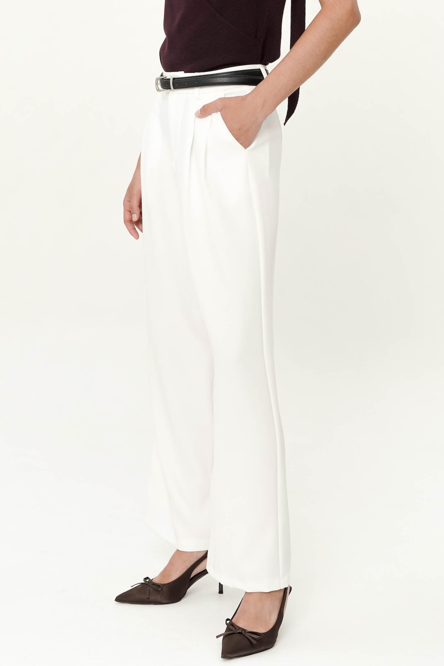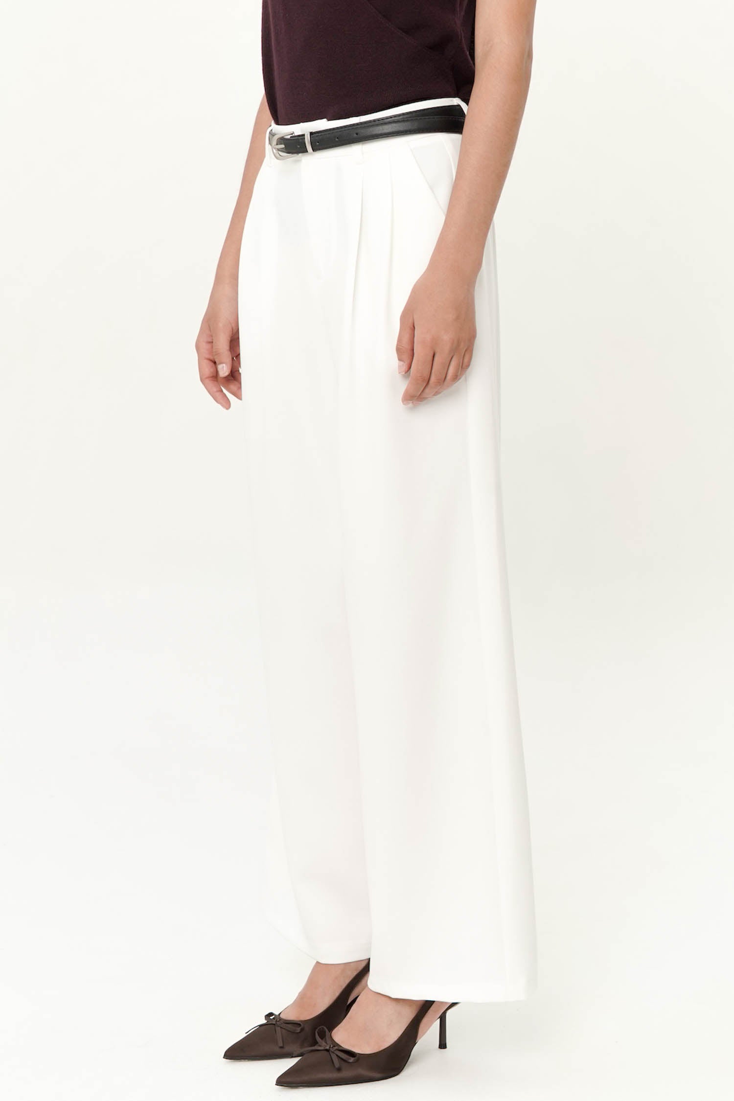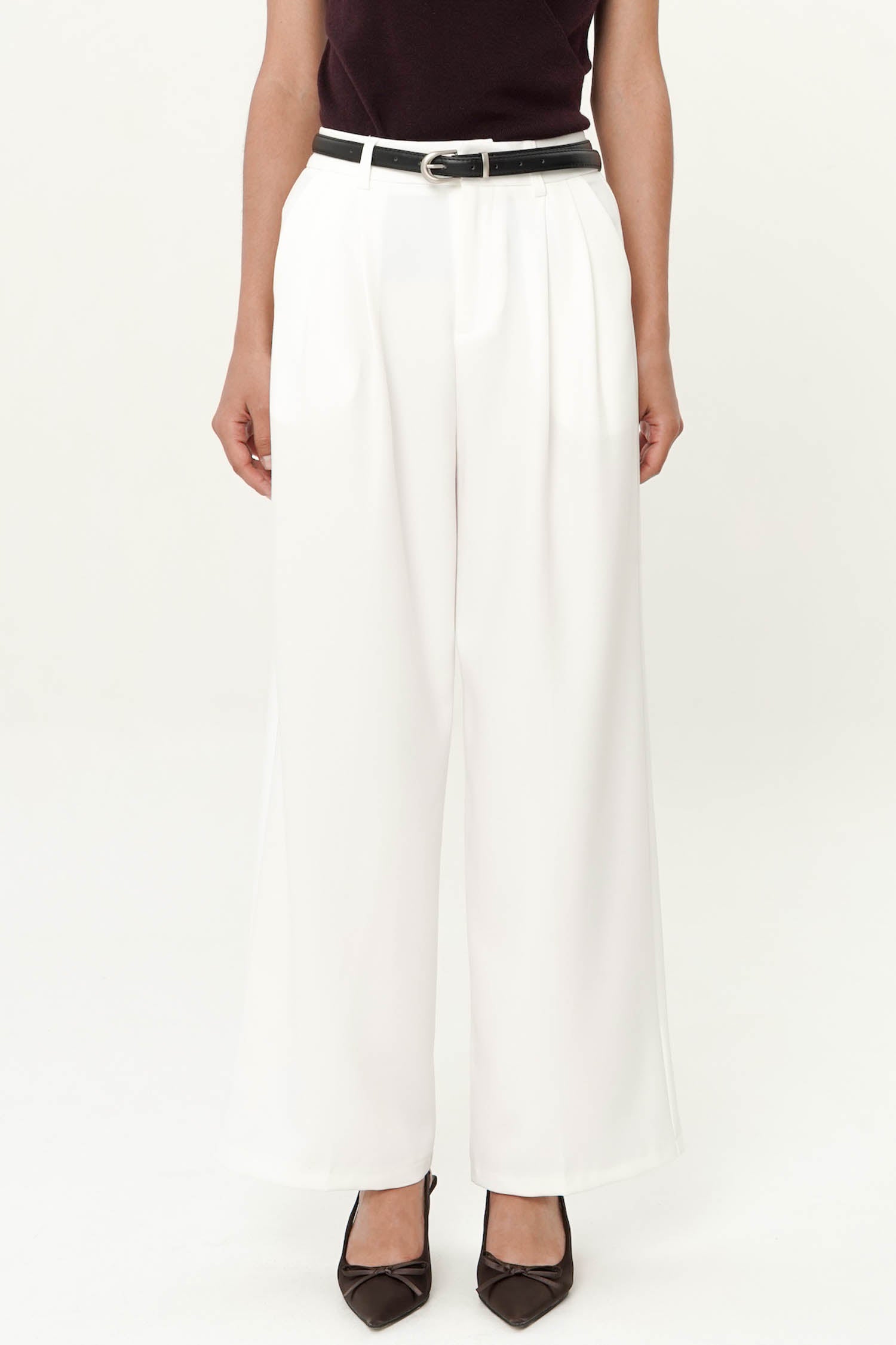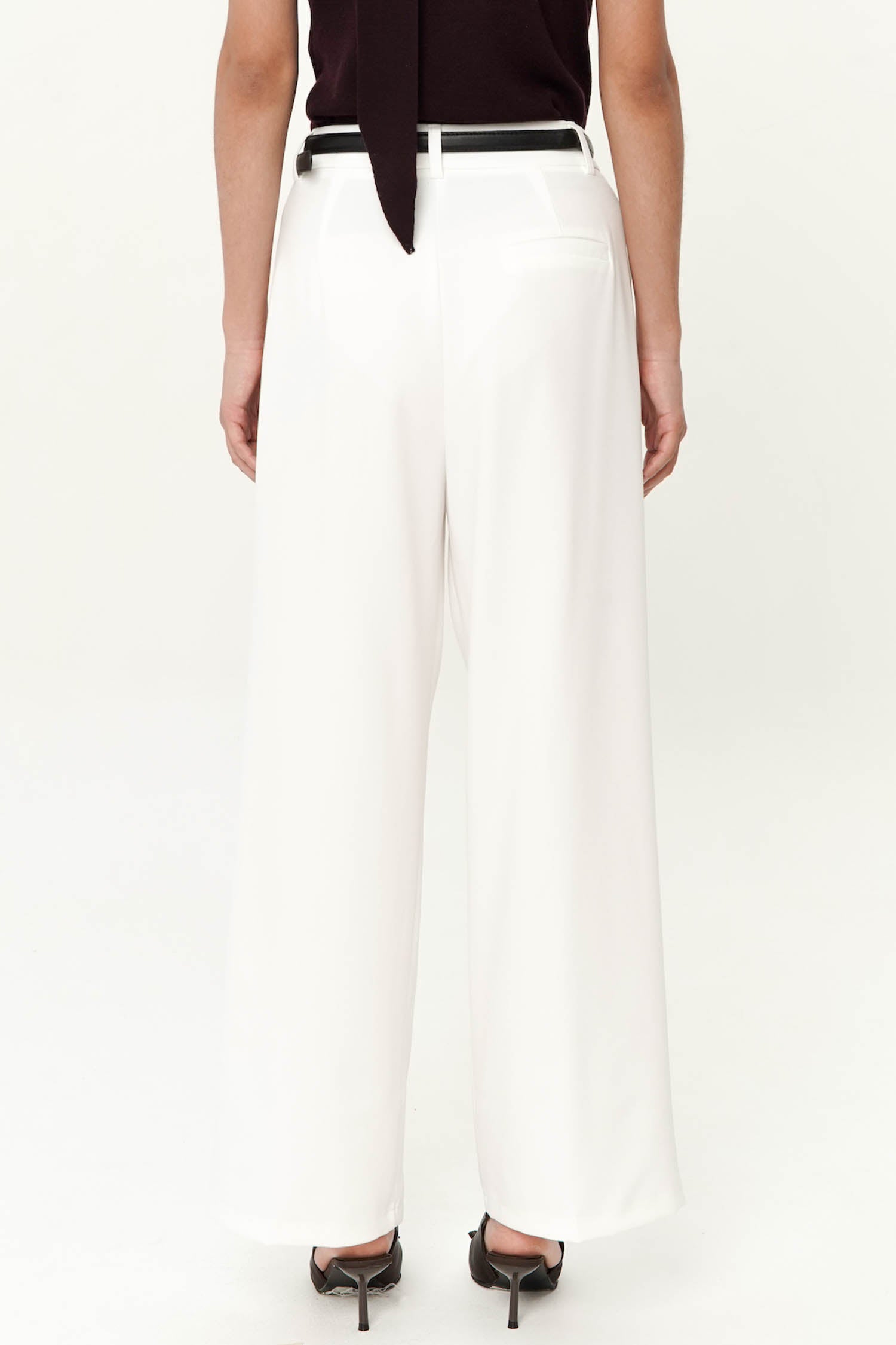 The Majorie Belted Trouser is a refined wardrobe essential, tailored to perfection in smooth polyester for a polished yet effortless look. Featuring a high-waist silhouette with soft pleats and a detachable belt that defines the waistline, these trousers balance structure with fluidity, creating an elongated and elegant shape. The wide-leg cut lends a contemporary edge while ensuring comfort and ease of movement, making it a versatile piece for both professional settings and elevated everyday wear. Available in Dark Brown, White, Navy, and Dark Grey, the Majorie Belted Trouser offers timeless sophistication with modern versatility.