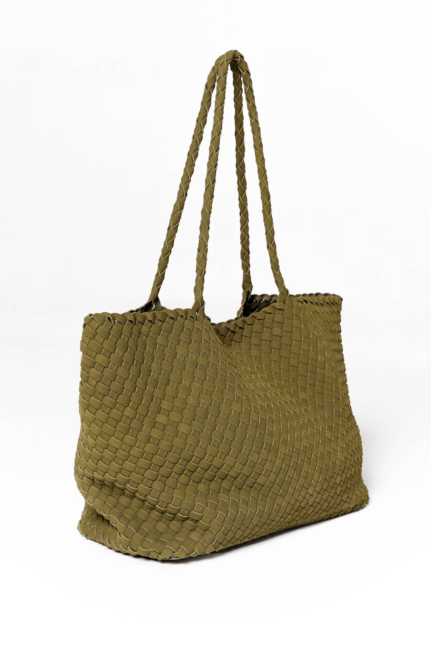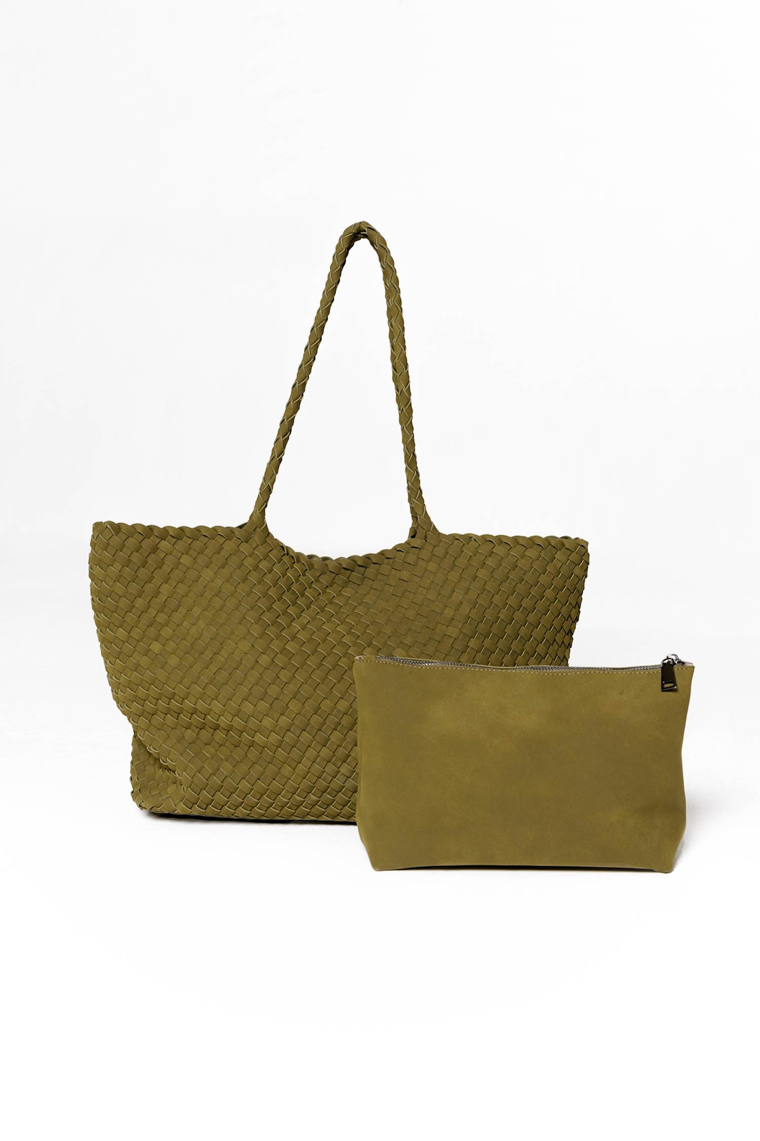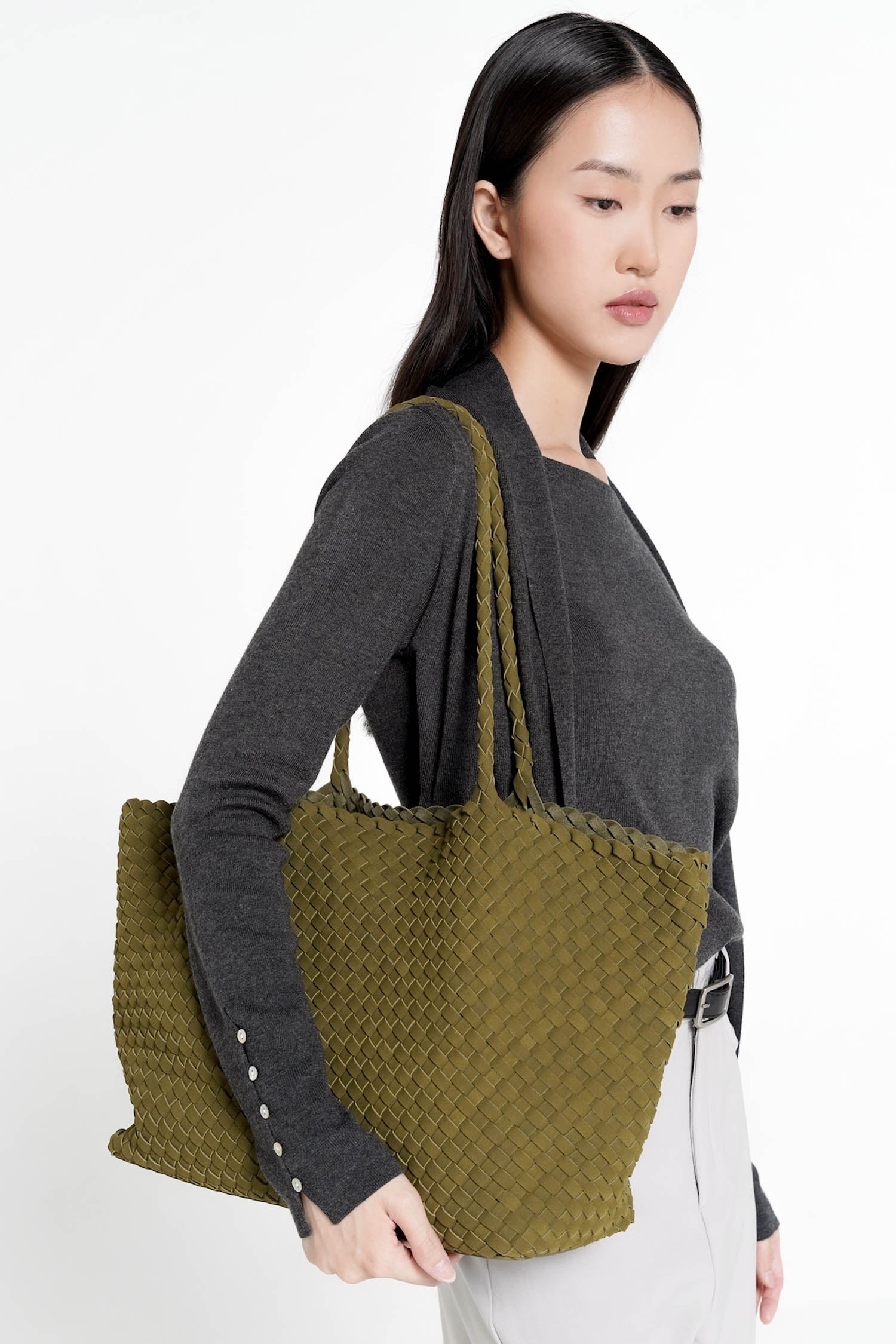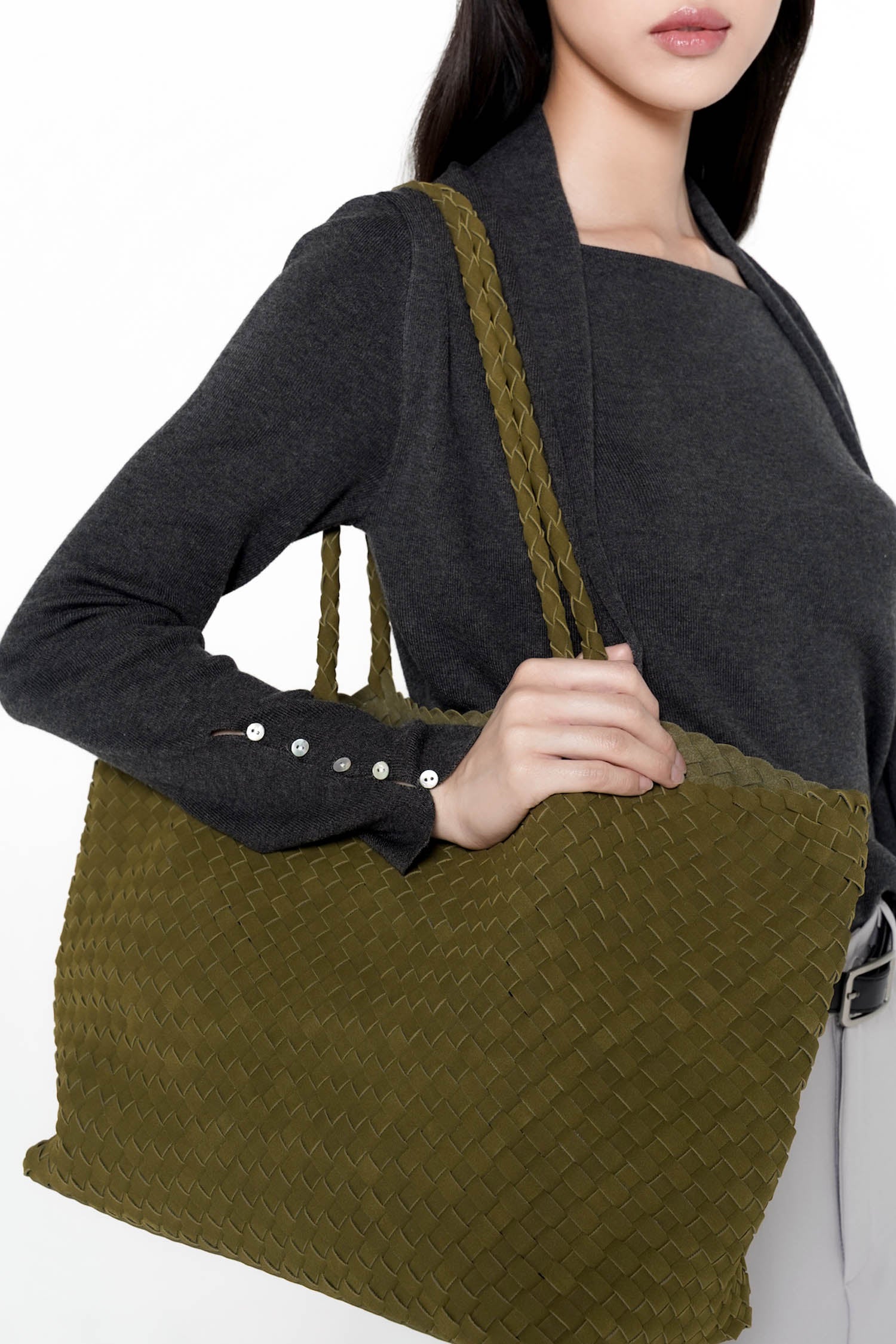 MALENE TOTE BAG The Malene Tote Bag is a refined statement of modern elegance, crafted from matte, suede-like faux leather with a beautifully woven texture. Designed for both style and practicality, it features a spacious main compartment complemented by a detachable inner pouch to keep essentials neatly organized. Its relaxed yet structured silhouette is paired with a comfortable shoulder handle, allowing effortless transition from workday sophistication to weekend ease. Available in burgundy, olive, and khaki, the Malene Tote Bag offers timeless versatility with a polished, understated finish.