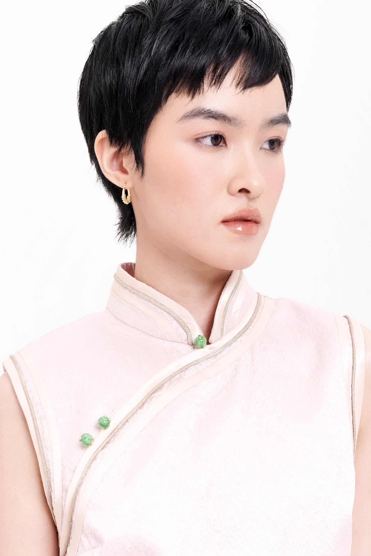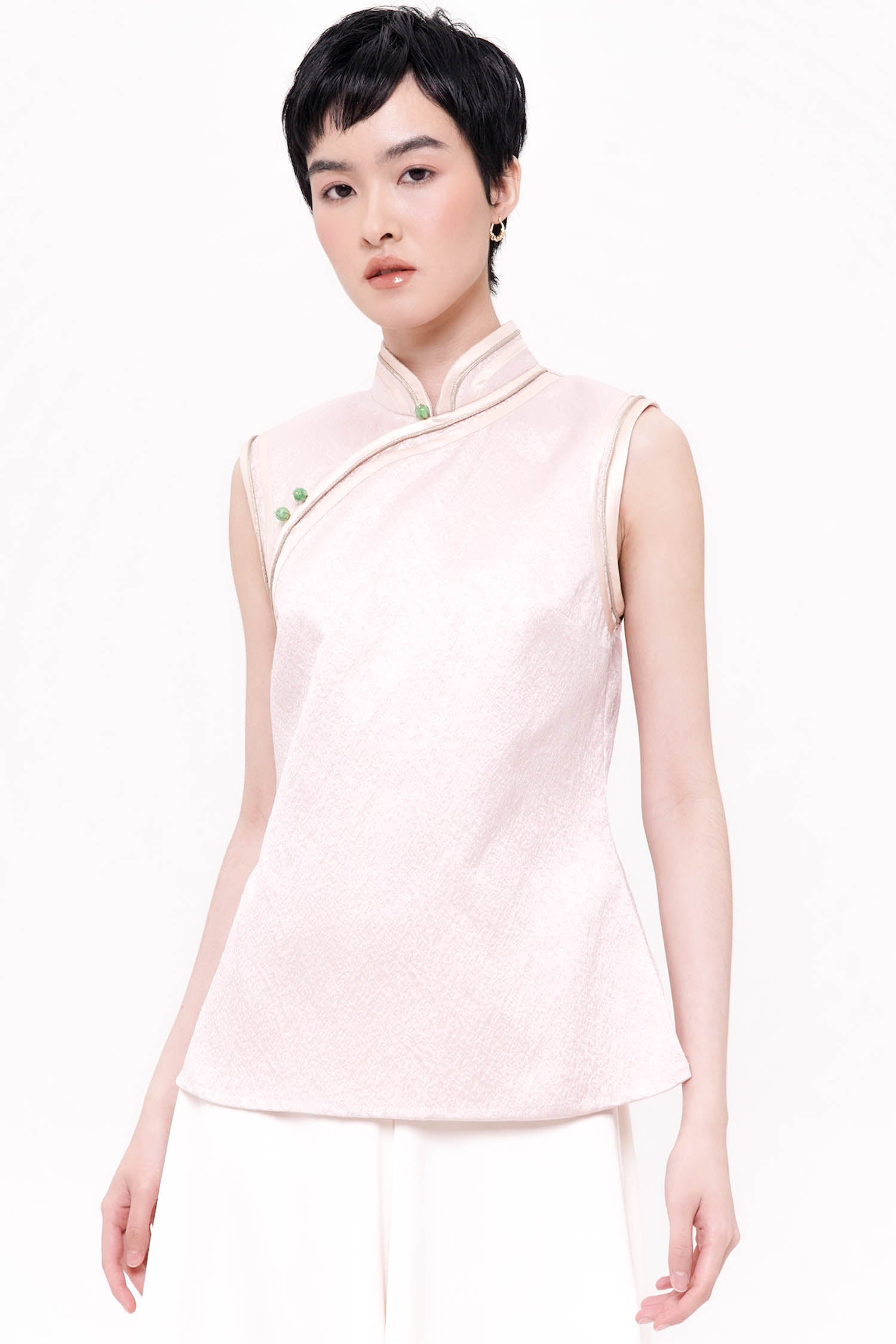 The Mei Mandarin Collar Top is a graceful fusion of tradition and modernity, crafted from exquisite jacquard that shimmers subtly with every movement. Defined by its elegant mandarin collar and refined asymmetric front panel, the design is beautifully accented with contrast piping and delicate jade-tone buttons, lending a touch of timeless oriental charm. The sleeveless silhouette and gently flared hem create a flattering, elongated line, making it both comfortable and sophisticated for any occasion. Available in serene Sage and romantic Pink, the Mei Top exudes quiet luxury and polished femininity.