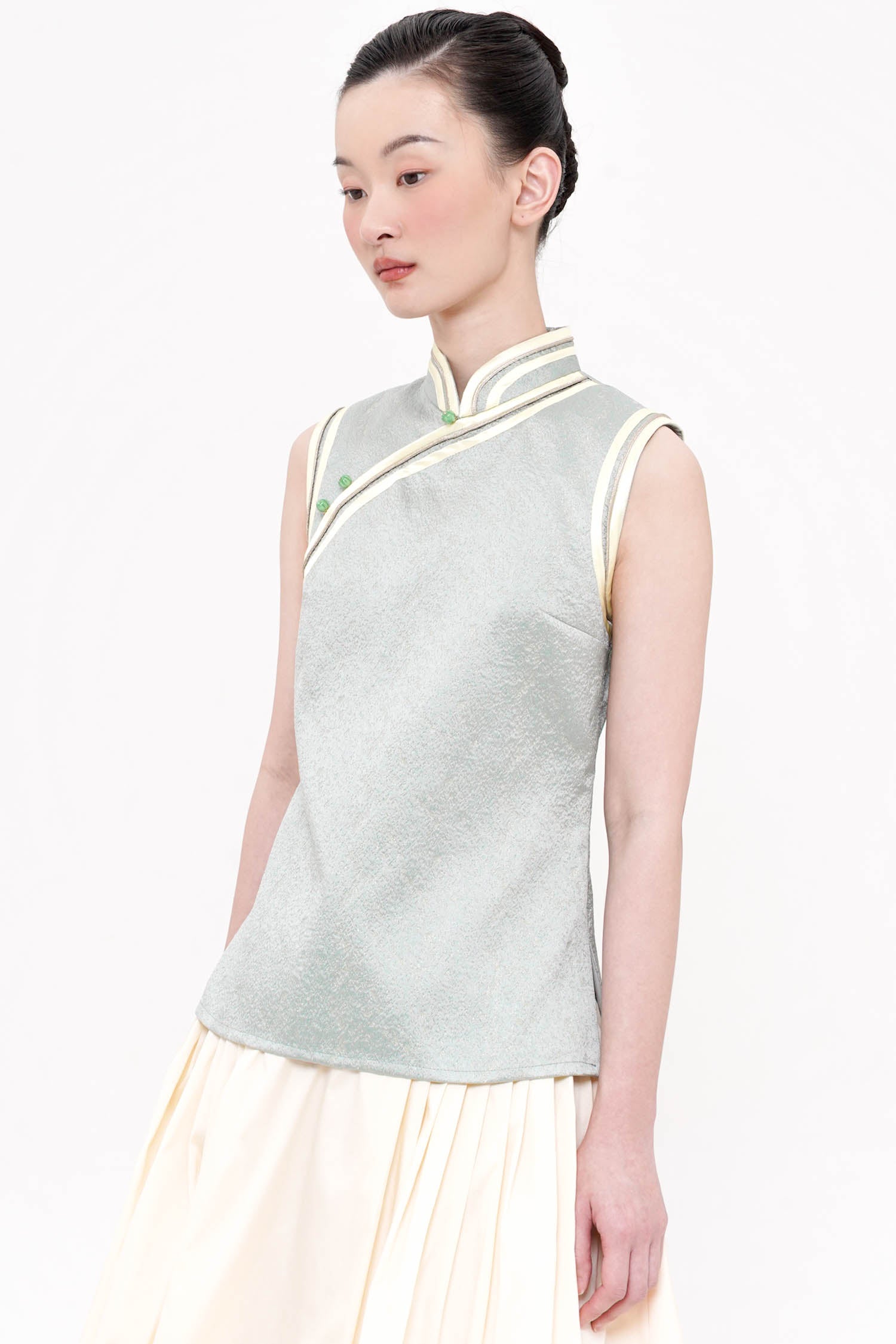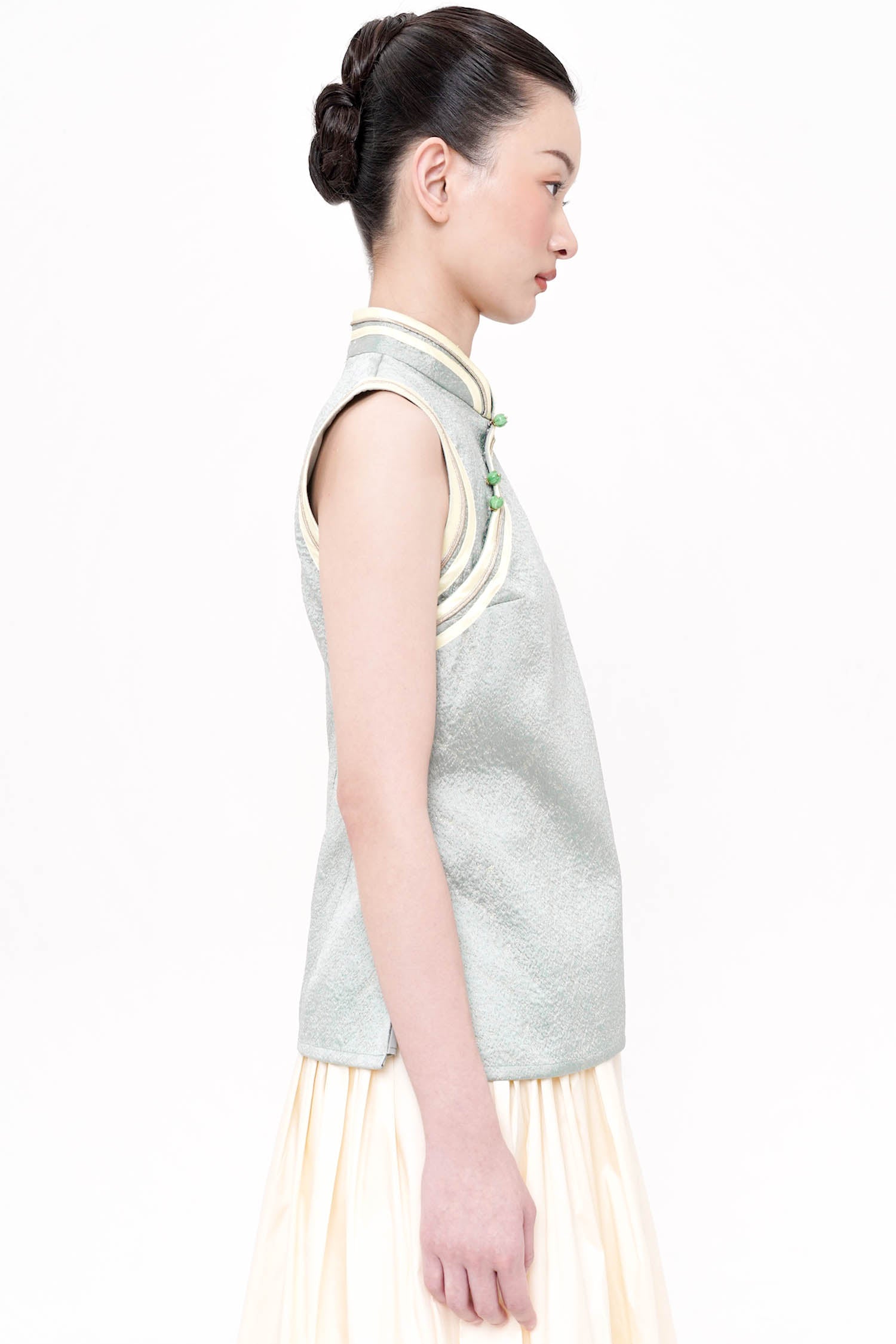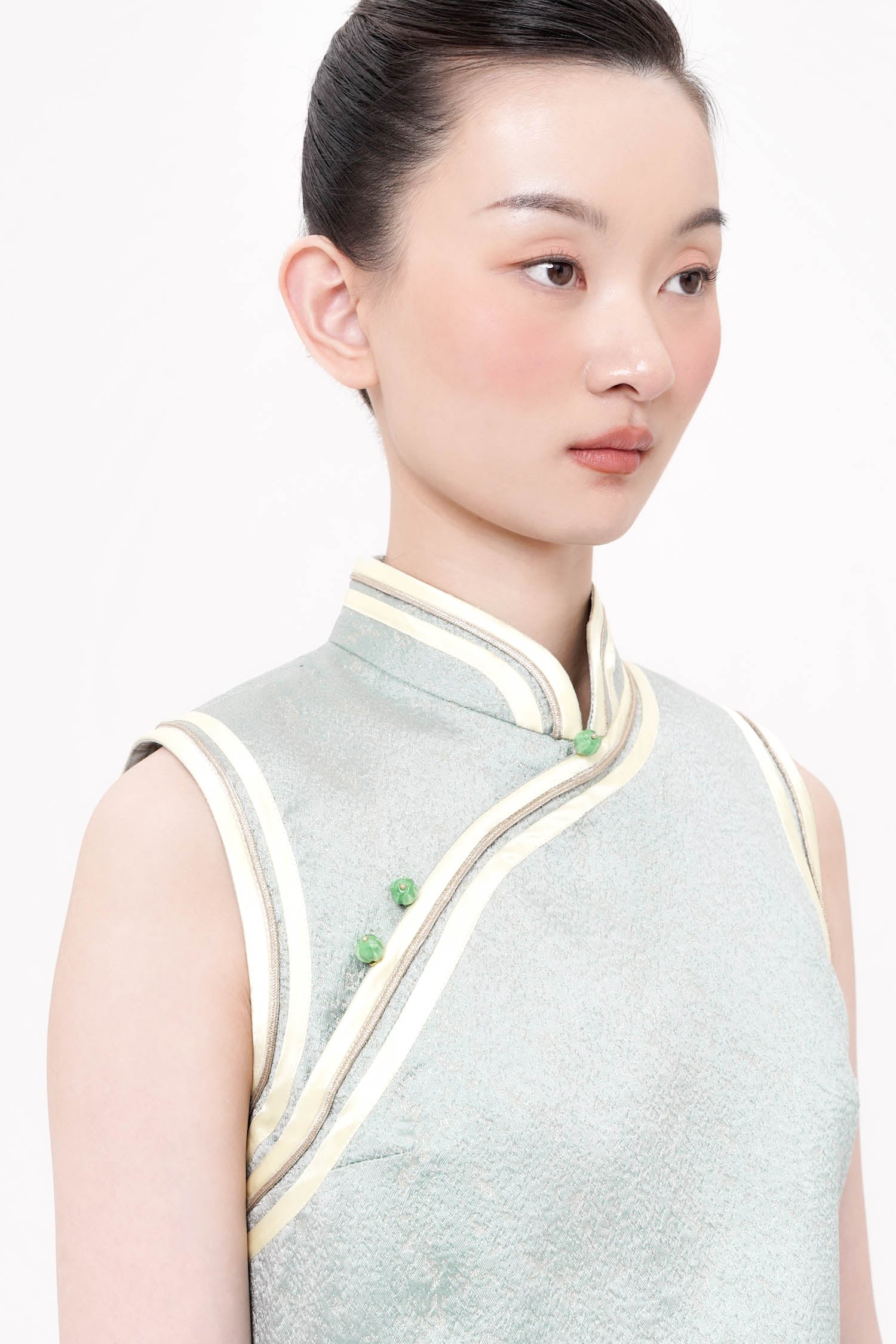 The Mei Mandarin Collar Top is a graceful fusion of tradition and modernity, crafted from exquisite jacquard that shimmers subtly with every movement. Defined by its elegant mandarin collar and refined asymmetric front panel, the design is beautifully accented with contrast piping and delicate jade-tone buttons, lending a touch of timeless oriental charm. The sleeveless silhouette and gently flared hem create a flattering, elongated line, making it both comfortable and sophisticated for any occasion. Available in serene Sage and romantic Pink, the Mei Top exudes quiet luxury and polished femininity.