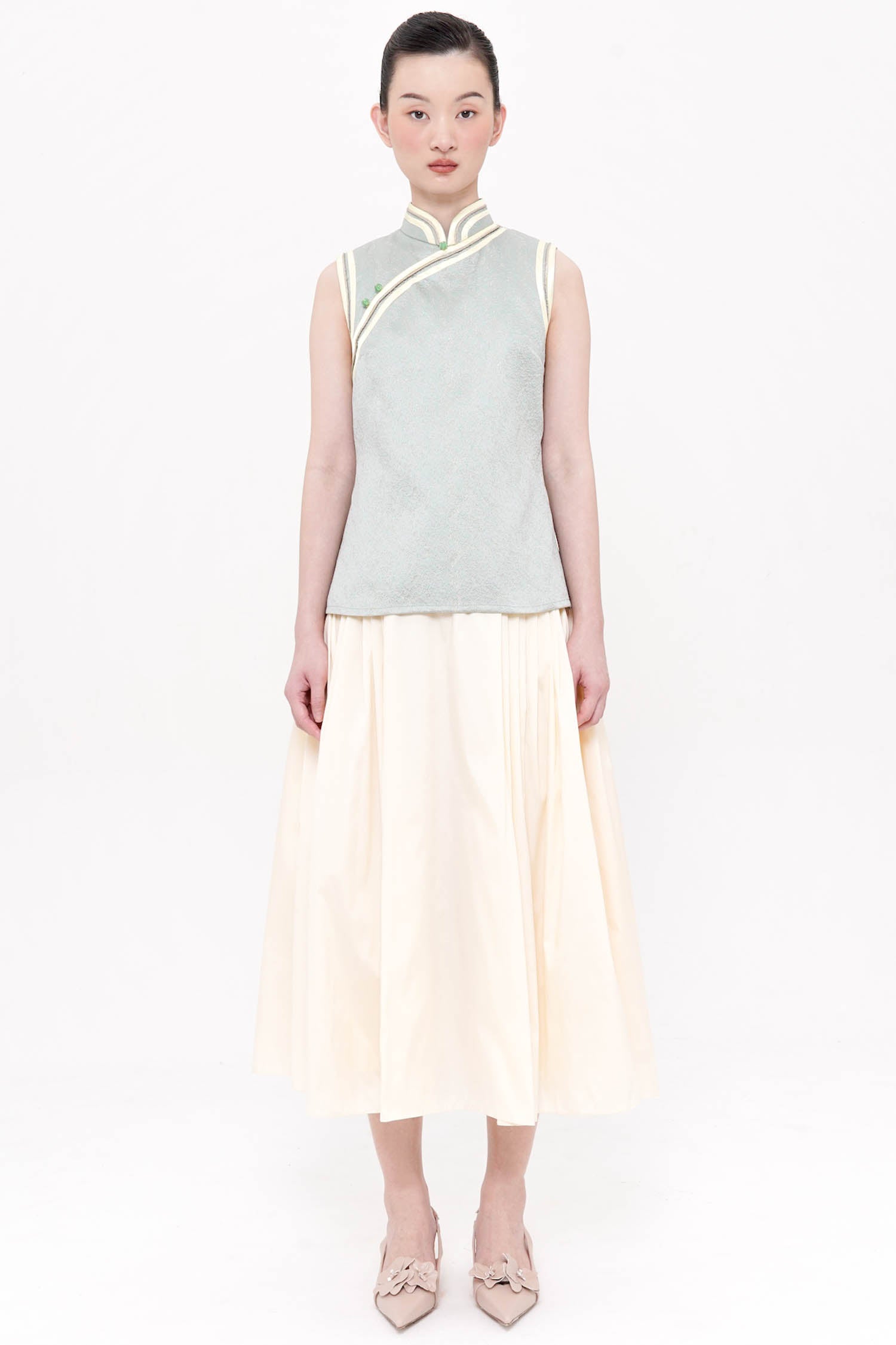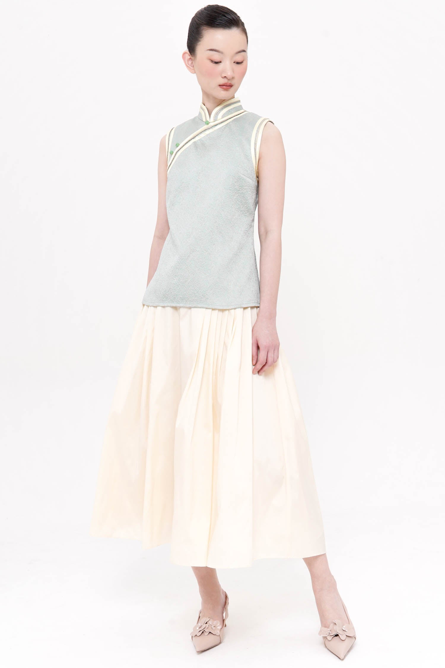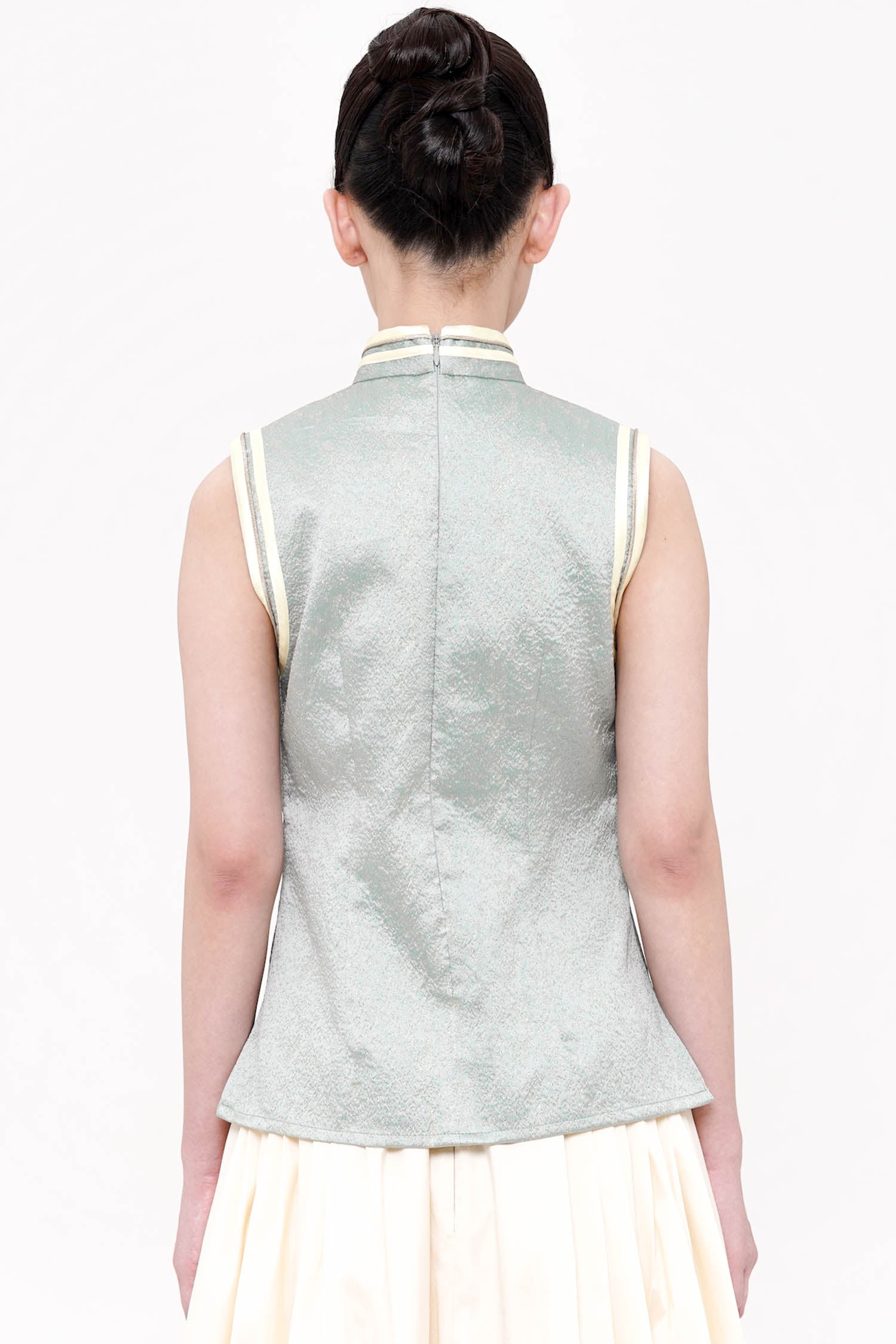The Mei Mandarin Collar Top is a graceful fusion of tradition and modernity, crafted from exquisite jacquard that shimmers subtly with every movement. Defined by its elegant mandarin collar and refined asymmetric front panel, the design is beautifully accented with contrast piping and delicate jade-tone buttons, lending a touch of timeless oriental charm. The sleeveless silhouette and gently flared hem create a flattering, elongated line, making it both comfortable and sophisticated for any occasion. Available in serene Sage and romantic Pink, the Mei Top exudes quiet luxury and polished femininity.