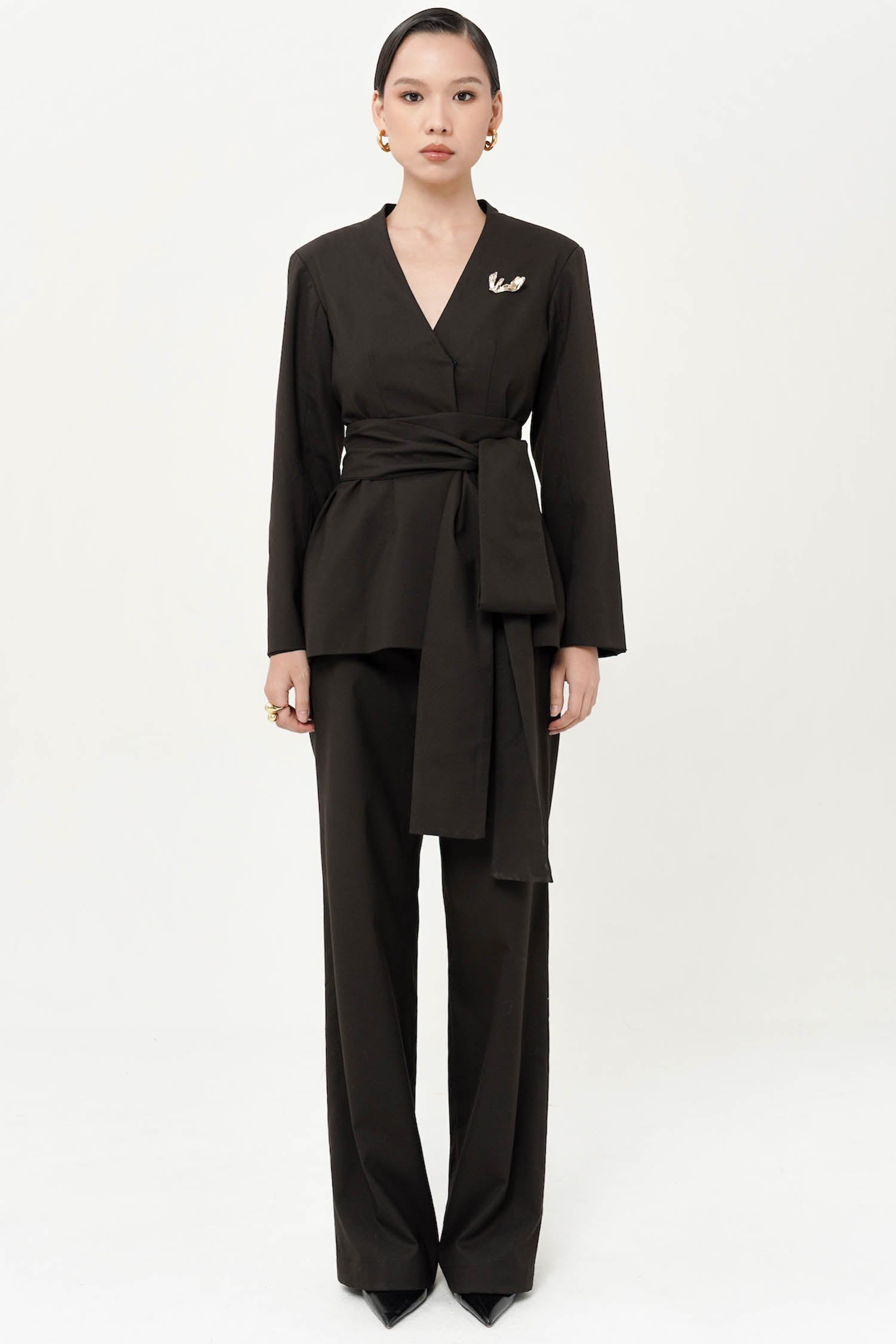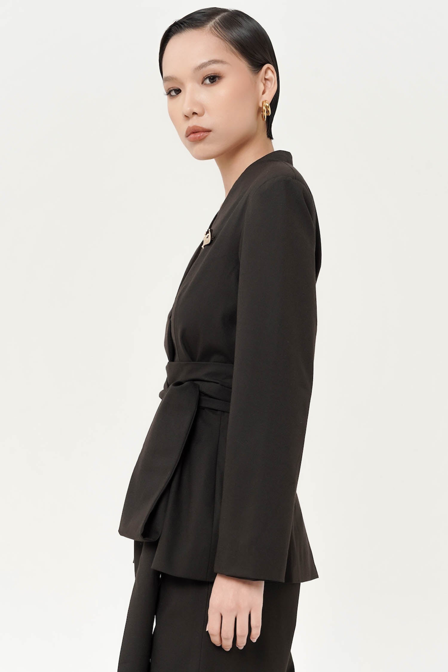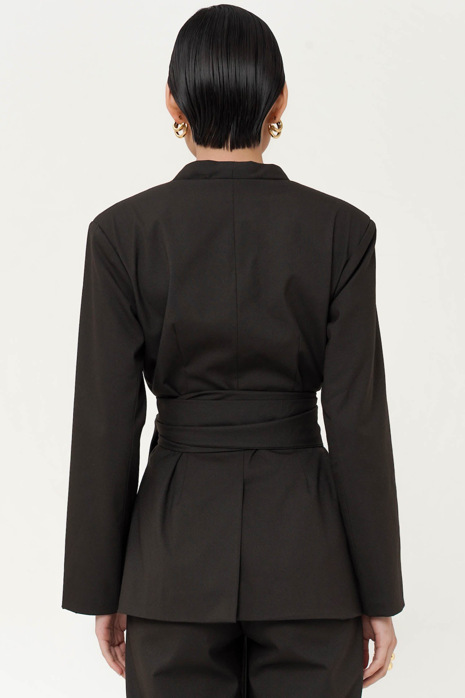 Elevate your wardrobe with the Montre Blazer in Dark Brown, featuring a sleek, collarless design enhanced by structured shoulder pads for a sharp silhouette. The detachable belt offers versatile styling options, allowing you to define your waist effortlessly. Paired perfectly with matching Montre pants, this blazer creates a refined, cohesive look ideal for sophisticated occasions.