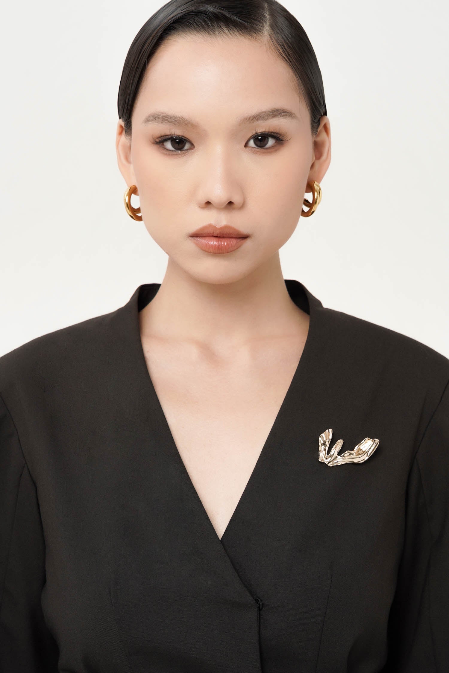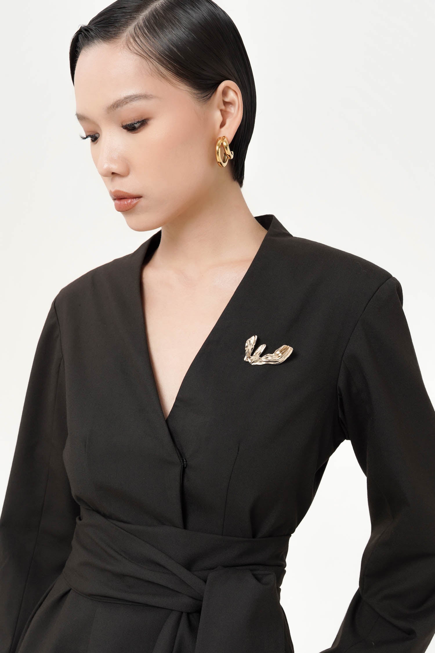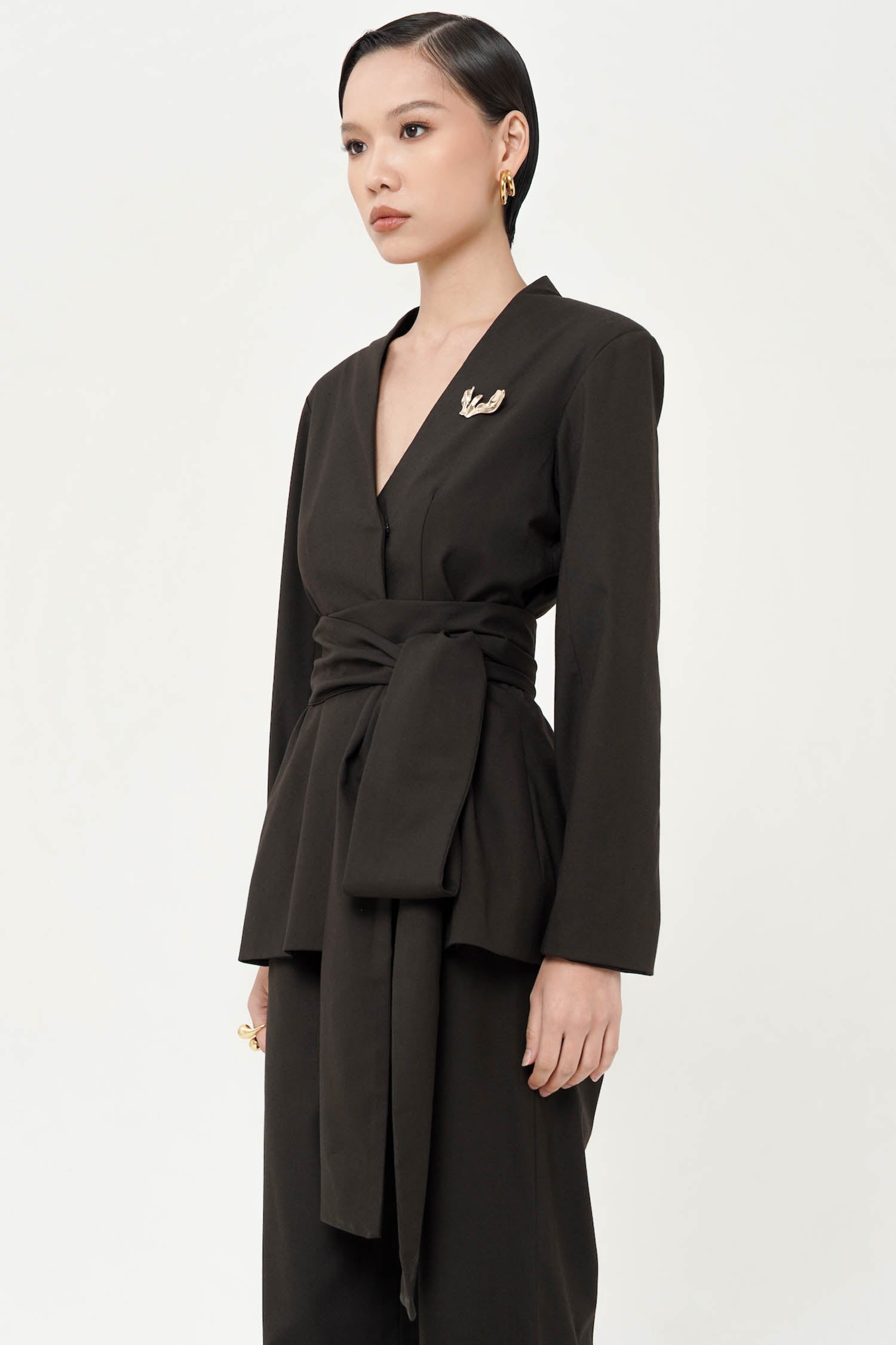 Elevate your wardrobe with the Montre Blazer in Dark Brown, featuring a sleek, collarless design enhanced by structured shoulder pads for a sharp silhouette. The detachable belt offers versatile styling options, allowing you to define your waist effortlessly. Paired perfectly with matching Montre pants, this blazer creates a refined, cohesive look ideal for sophisticated occasions.