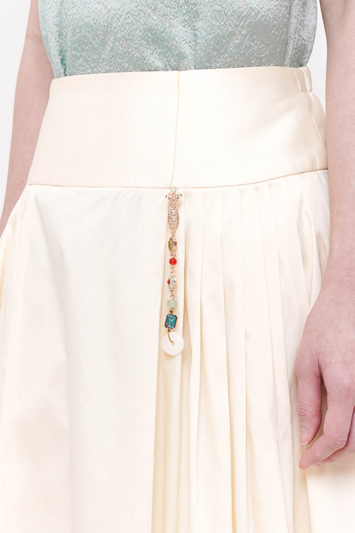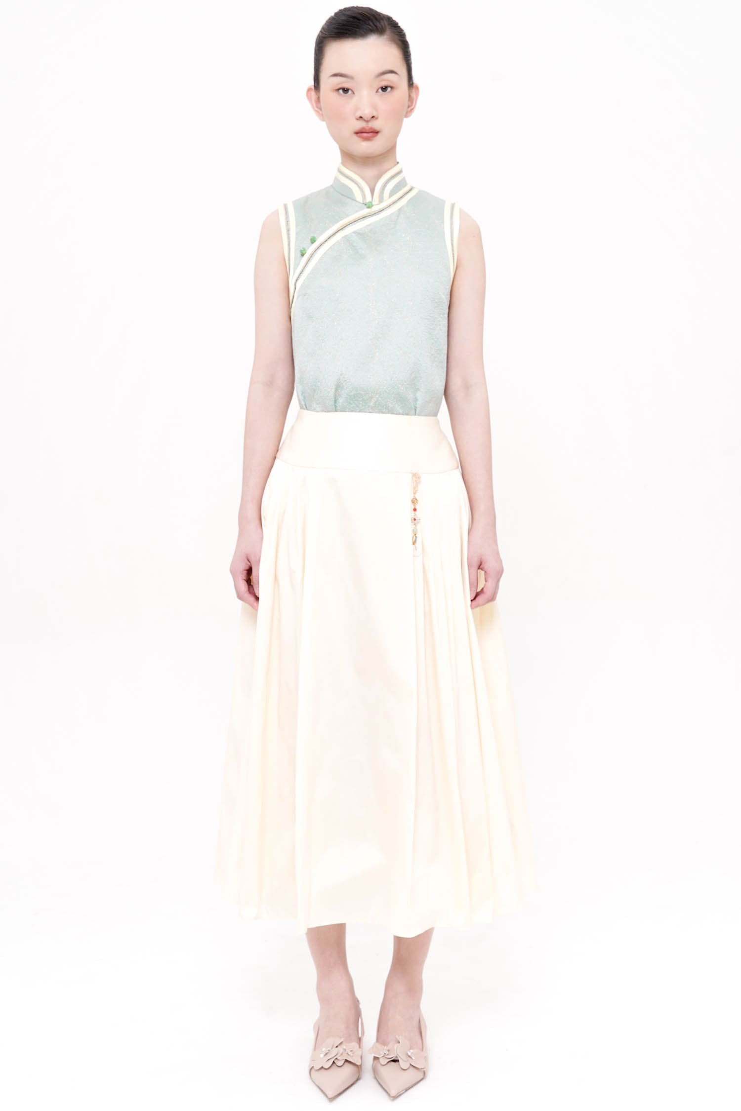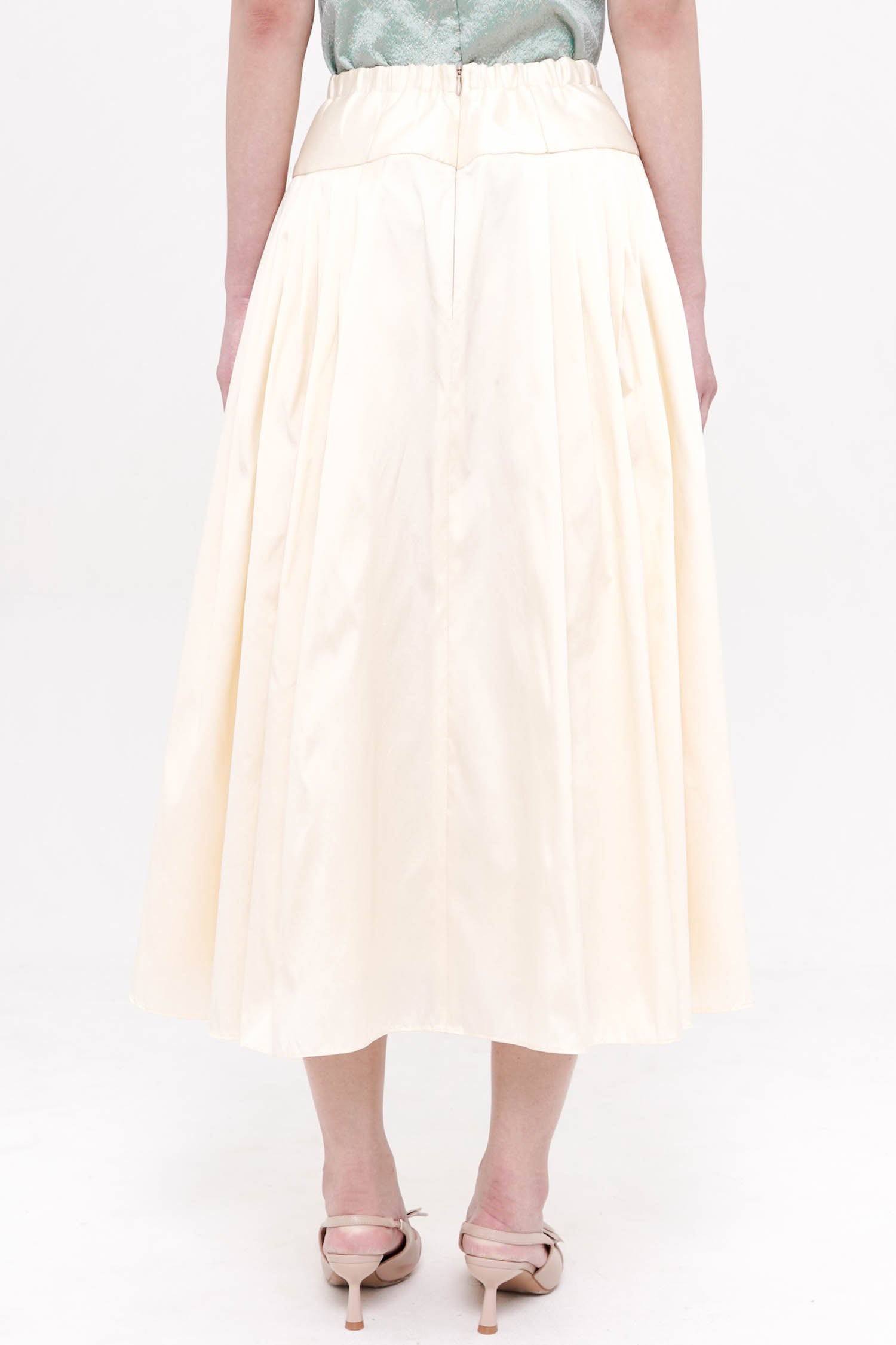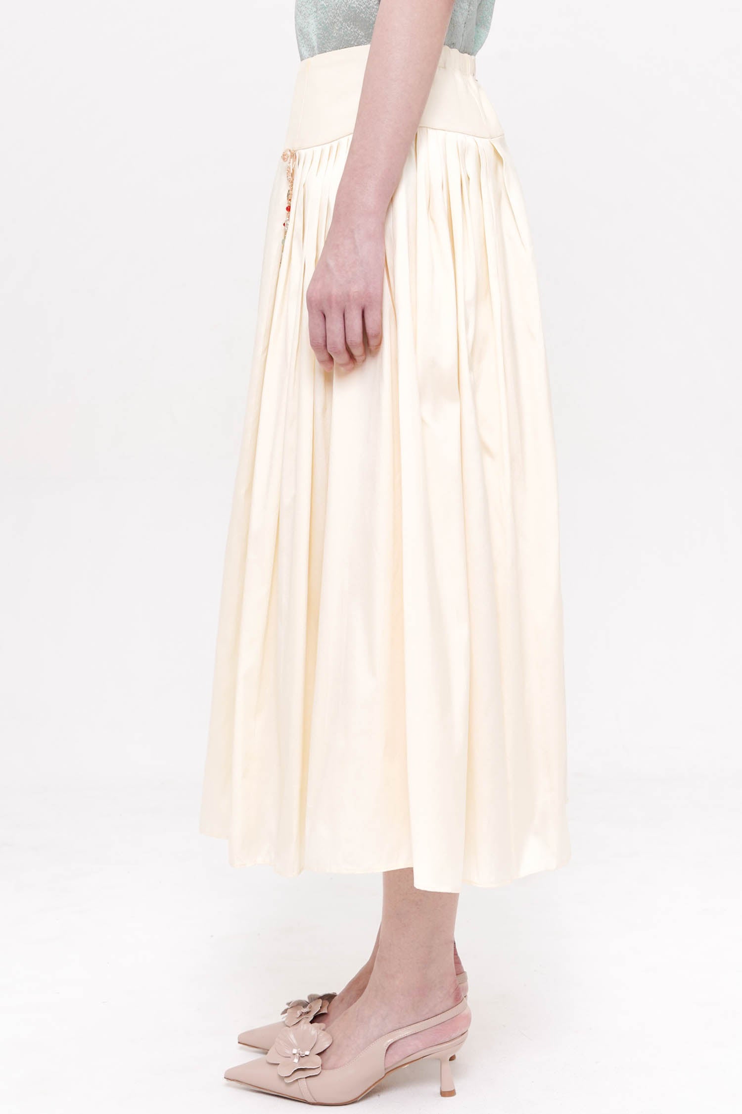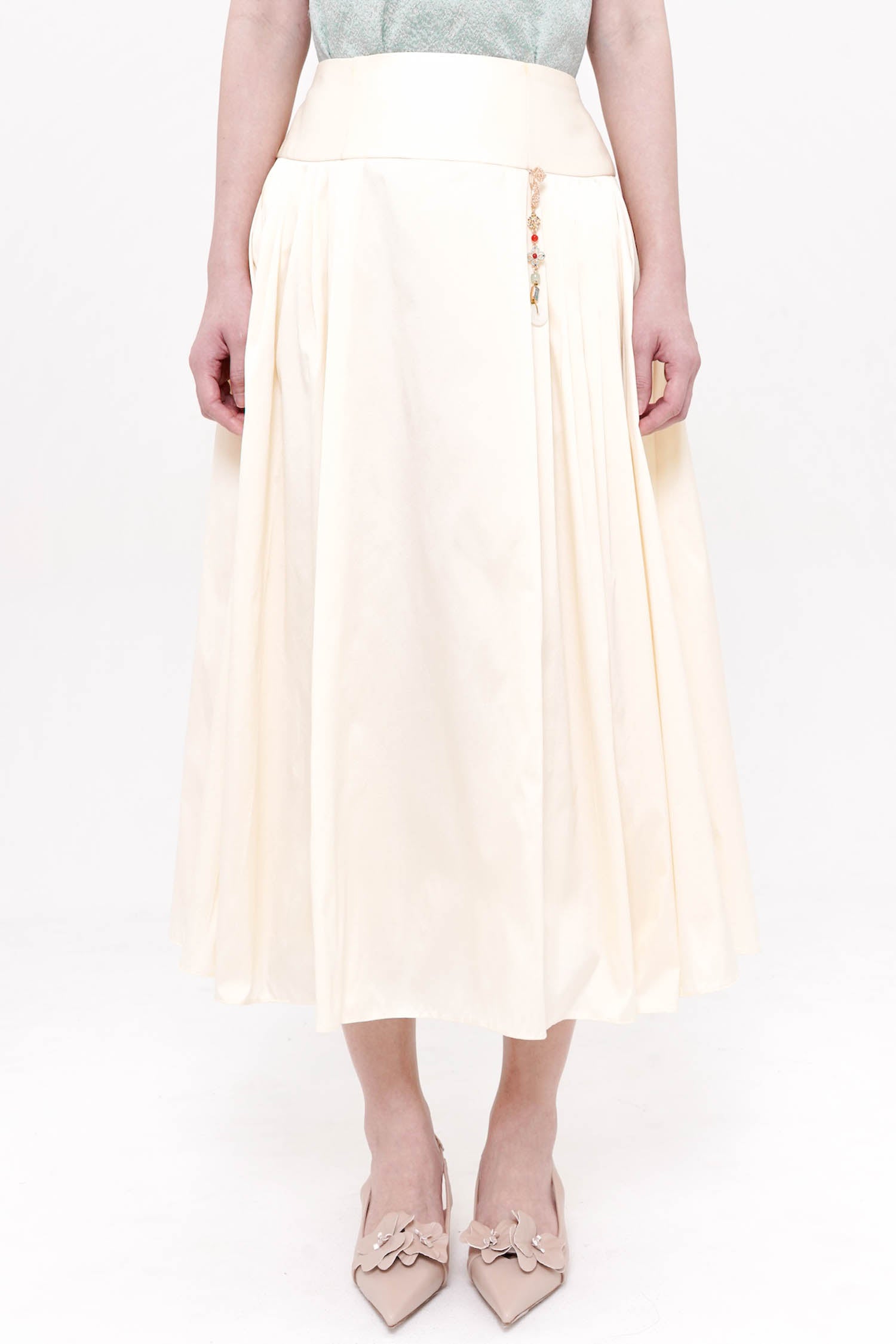 The Mudan Maxi Pleated Skirt in Ivory is an elegant foundation piece, designed to move with quiet sophistication. Crafted from lightweight polyester, its soft pleats fall fluidly from a structured waistband, creating a graceful, elongated silhouette. A subtle decorative accent at the waist adds a refined touch, while the airy construction ensures comfort and ease of movement. Timeless and versatile, this skirt pairs beautifully with statement tops or delicate layers, offering an effortless balance of femininity and polish.