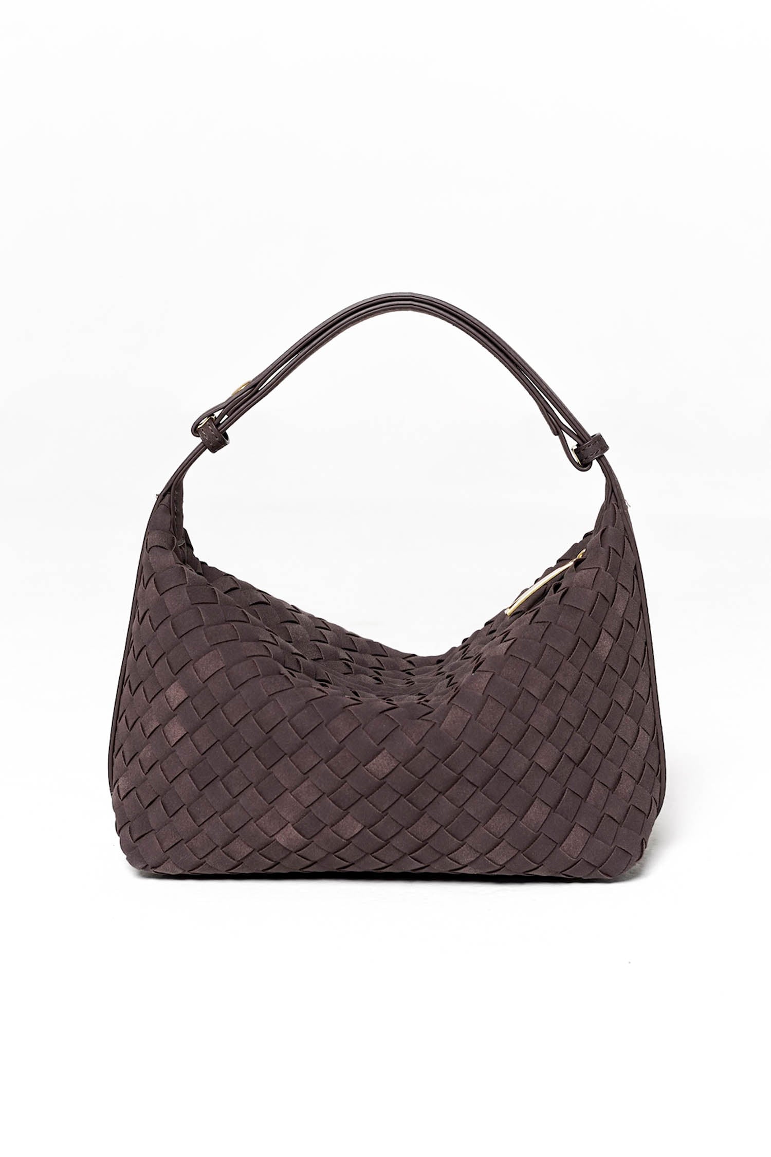 The Nano Bag is an elegantly crafted woven shoulder bag that blends understated luxury with everyday practicality. Made from matte, suede-like faux leather, it features a soft yet structured silhouette that drapes beautifully while maintaining its refined shape. The interior is thoughtfully designed with a spacious main compartment, a zip pocket, and an inner slip pocket to keep essentials neatly organized. Finished with an adjustable shoulder strap for comfortable wear, the Nano Bag is available in choco, olive, and khaki, making it a versatile statement piece that transitions seamlessly from daytime sophistication to evening elegance.