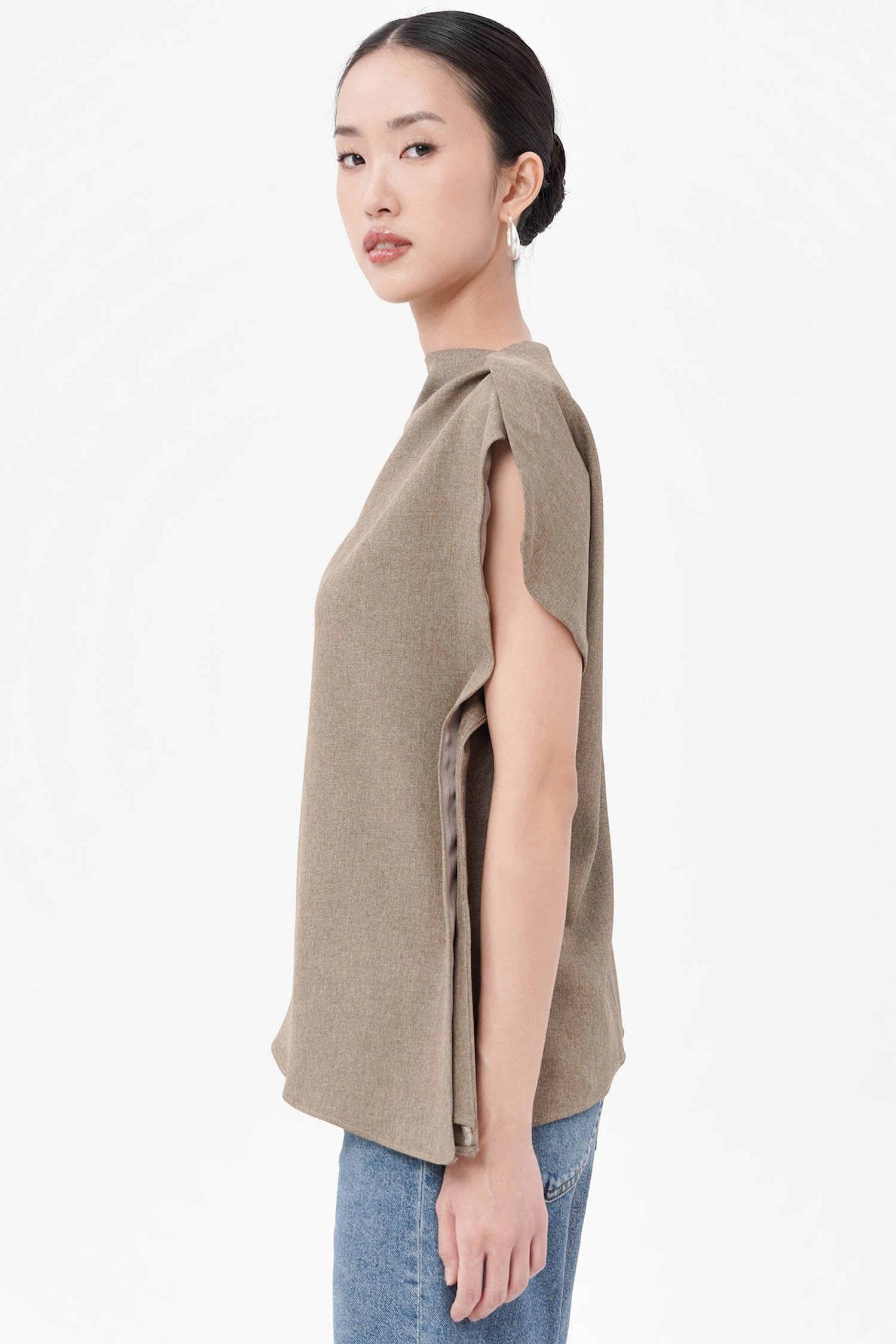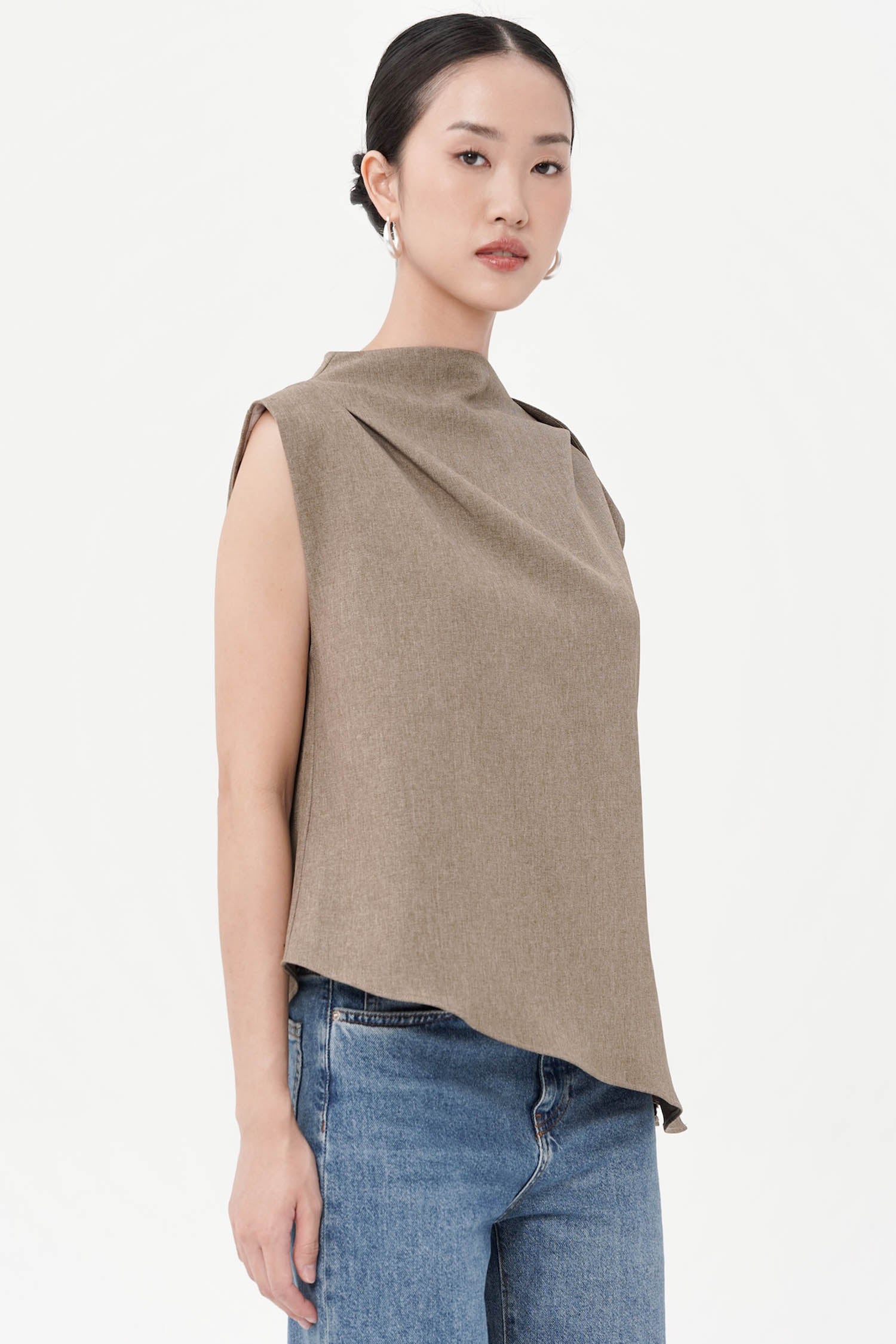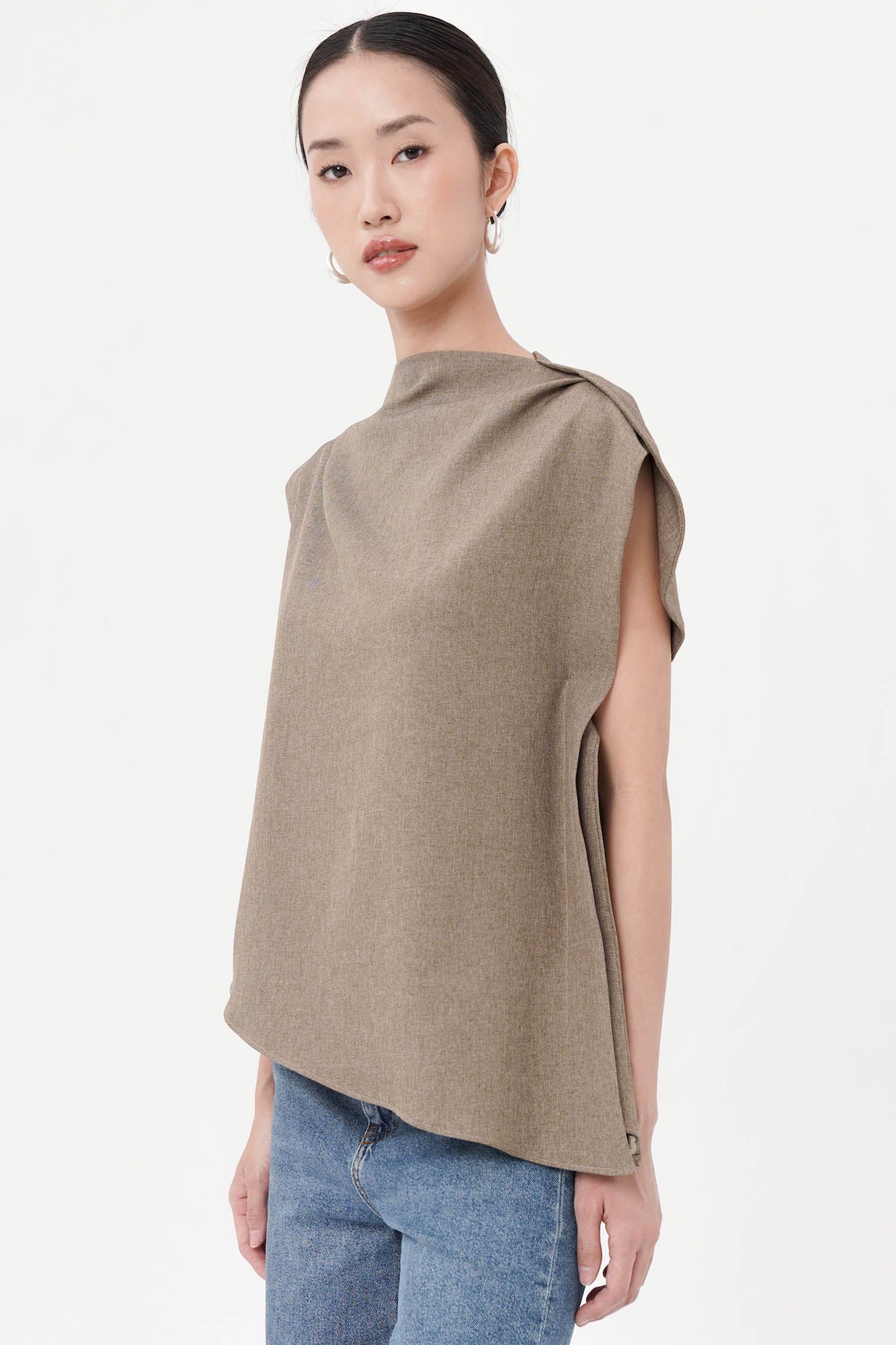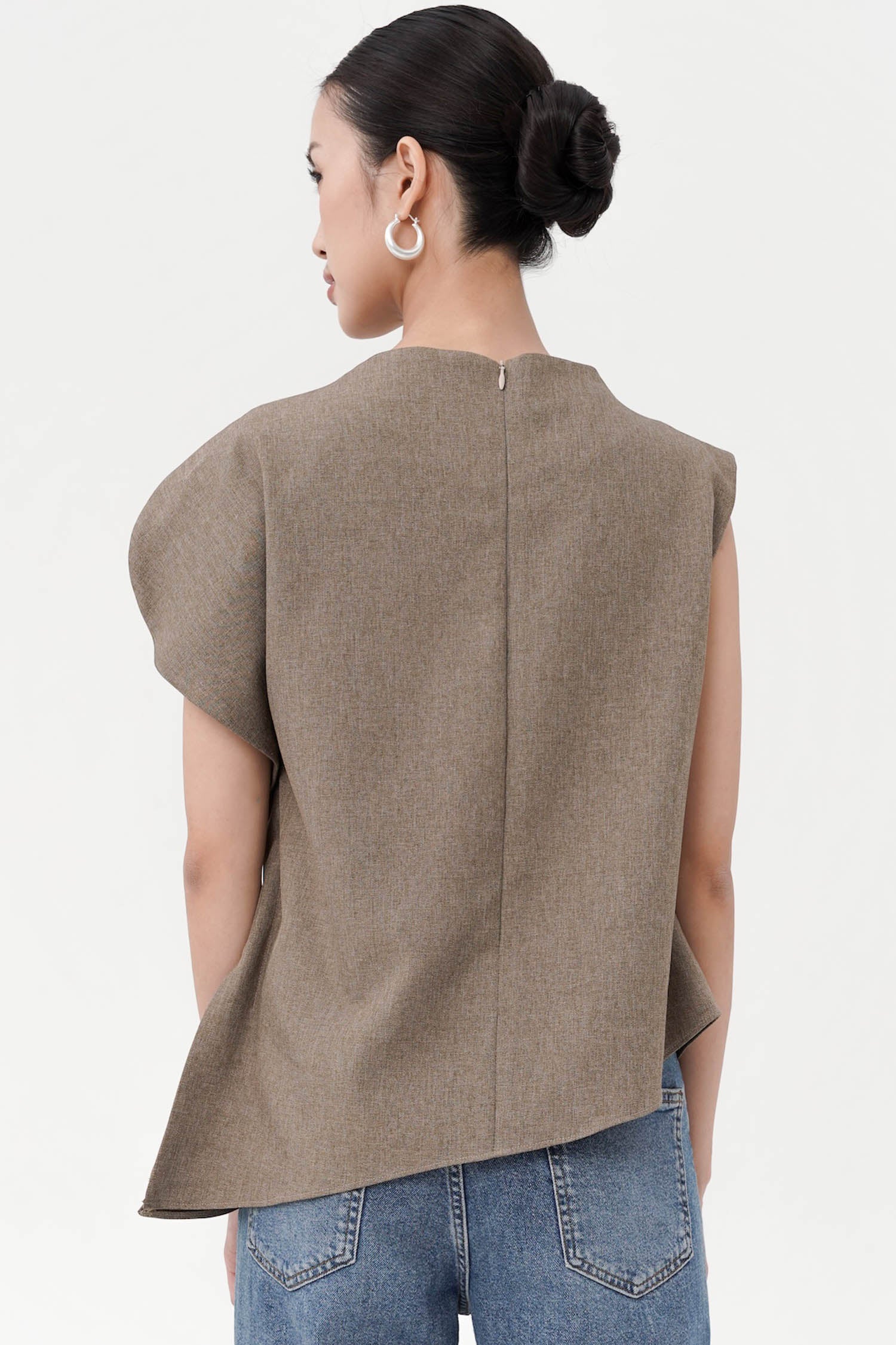 The Neuf Asymmetrical Top redefines modern sophistication through clean lines and architectural form. Crafted from luxurious semi wool, this piece showcases a structured yet fluid silhouette, featuring a softly draped shoulder and an artfully angled hem that lends an air of effortless refinement. Its sleeveless design and precise tailoring create a balanced interplay between strength and subtle femininity. Available in Broken White and Ash Brown, the Neuf Top is a statement of quiet confidence—perfect for those who appreciate contemporary elegance with a timeless edge.