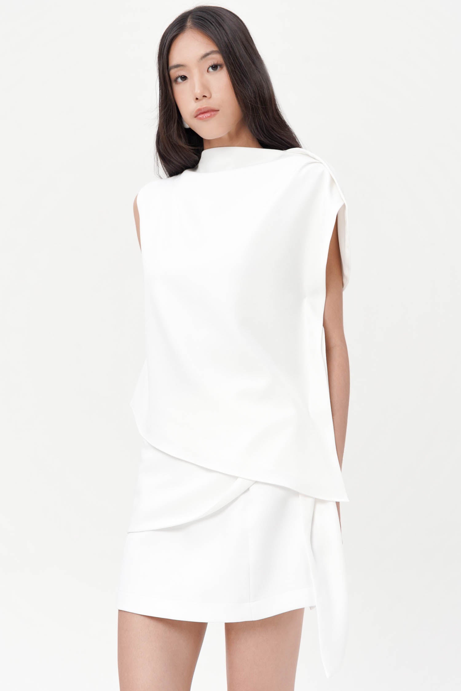 The Neuf Asymmetrical Top redefines modern sophistication through clean lines and architectural form. Crafted from luxurious semi wool, this piece showcases a structured yet fluid silhouette, featuring a softly draped shoulder and an artfully angled hem that lends an air of effortless refinement. Its sleeveless design and precise tailoring create a balanced interplay between strength and subtle femininity. Available in Broken White and Ash Brown, the Neuf Top is a statement of quiet confidence—perfect for those who appreciate contemporary elegance with a timeless edge.