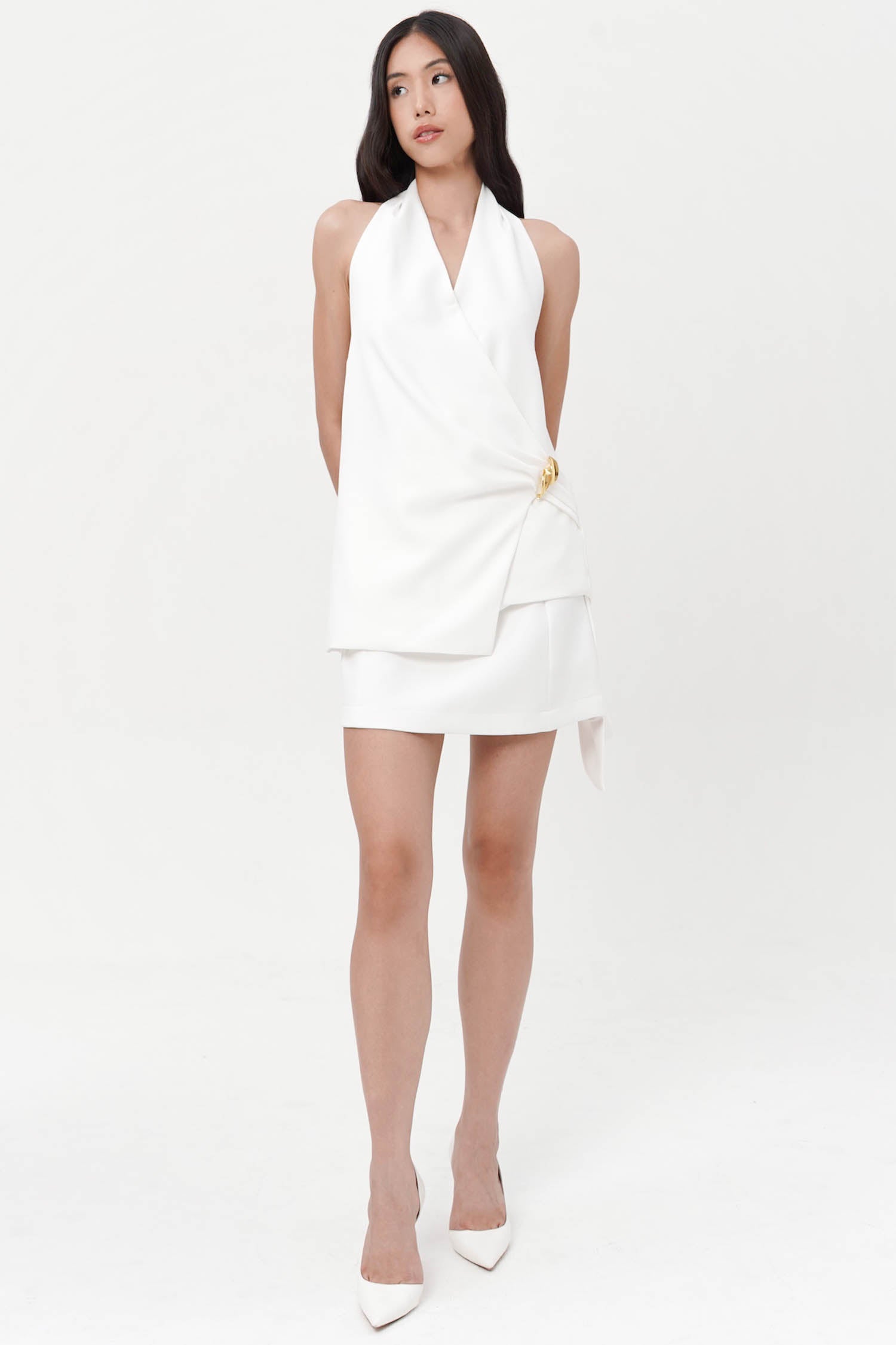 The Niki Draped Top embodies refined elegance through its fluid drapery and sculptural detailing. Crafted from semi wool, the piece offers a smooth yet structured texture that drapes effortlessly over the body, creating a flattering silhouette with an artful, asymmetrical finish. The halter neckline accentuates the shoulders and neckline, while a statement gold accent at the waist adds a touch of modern sophistication. Available in Broken White and Dusty Pink, this design exudes quiet luxury—perfect for both polished daytime ensembles and graceful evening looks.