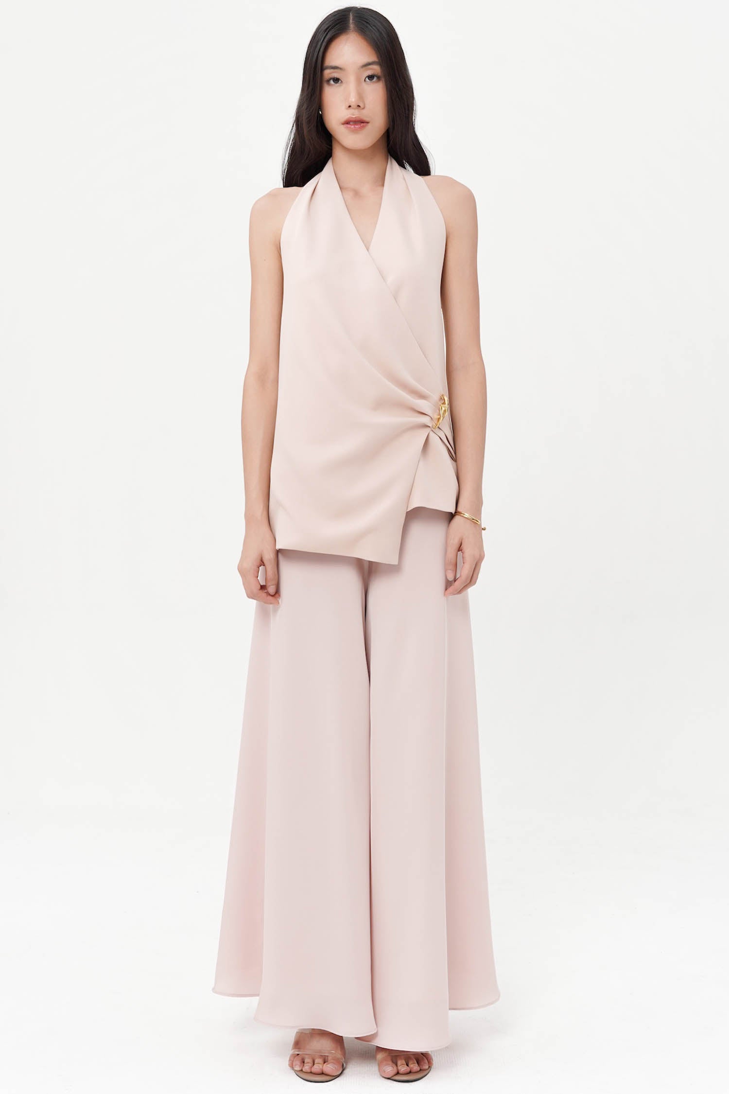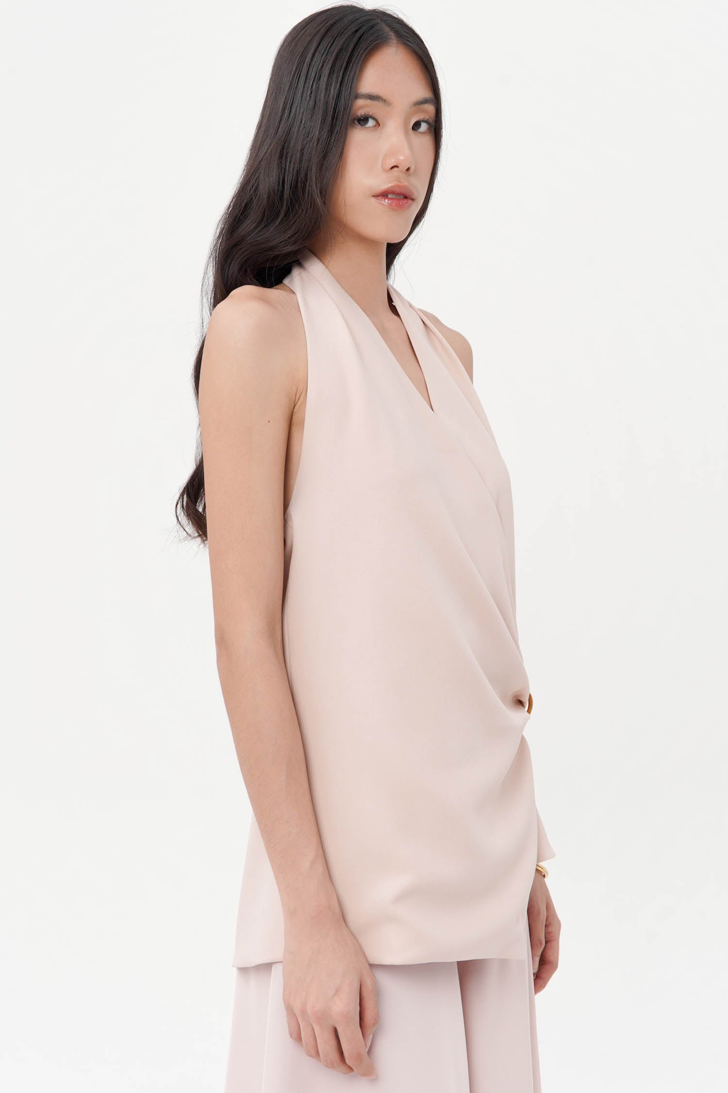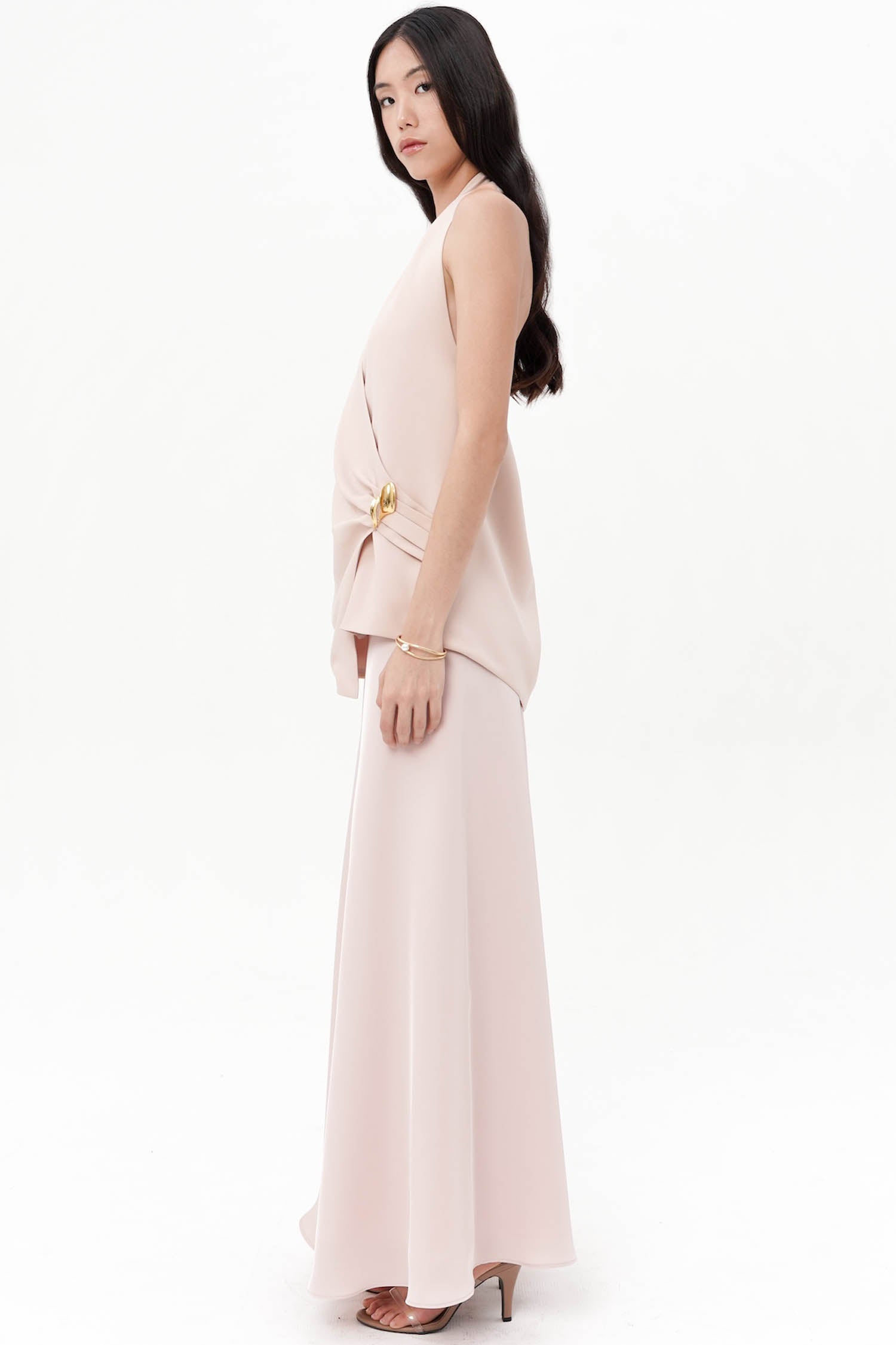 The Niki Draped Top embodies refined elegance through its fluid drapery and sculptural detailing. Crafted from semi wool, the piece offers a smooth yet structured texture that drapes effortlessly over the body, creating a flattering silhouette with an artful, asymmetrical finish. The halter neckline accentuates the shoulders and neckline, while a statement gold accent at the waist adds a touch of modern sophistication. Available in Broken White and Dusty Pink, this design exudes quiet luxury—perfect for both polished daytime ensembles and graceful evening looks.